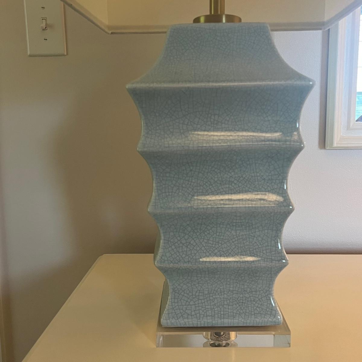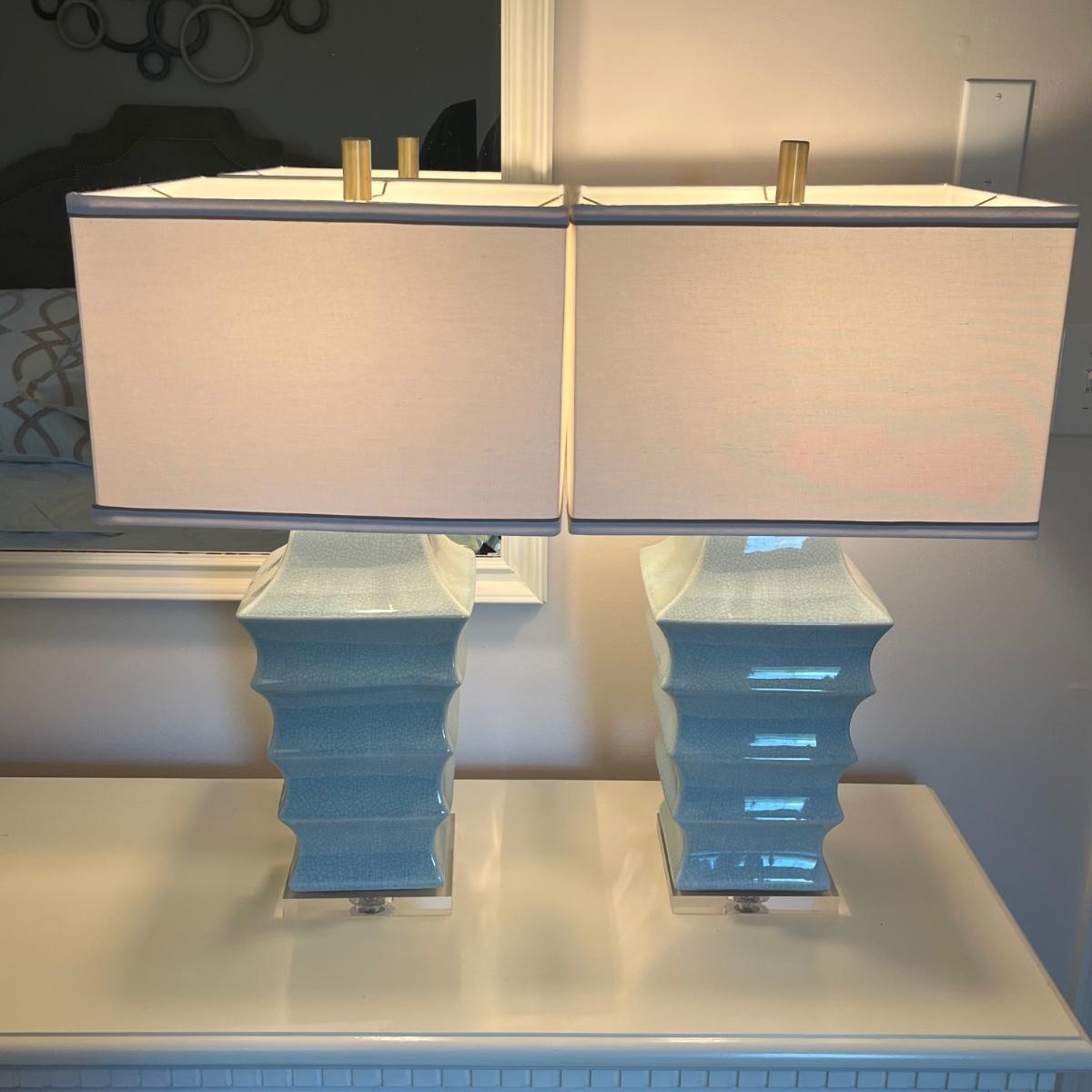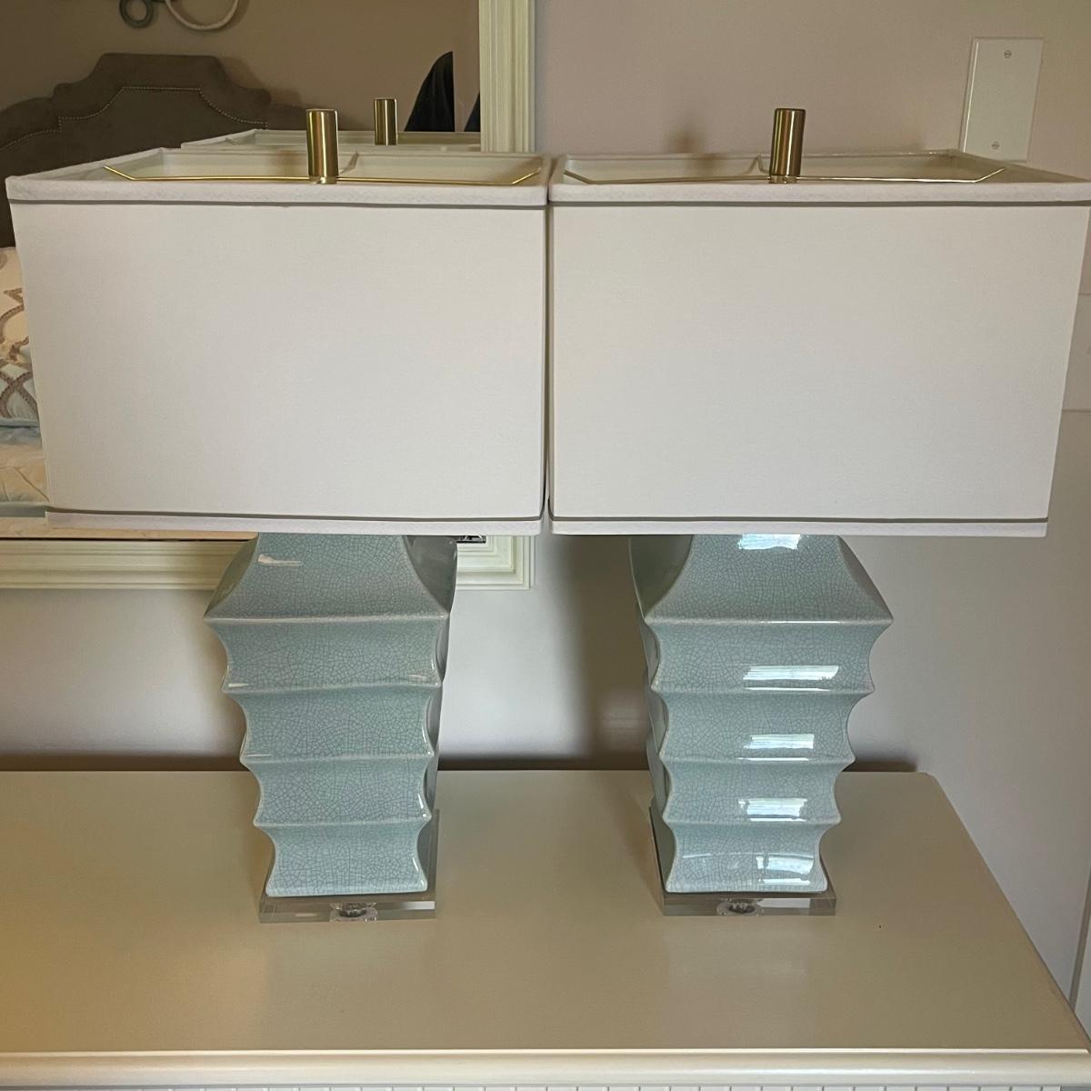 Lot includes two ceramic lamps with a Lucite base and square shades. Lamps measure 14.5” x 14.5” x 27”H with shade and have three way switches. Lamps powered on when plugged in.