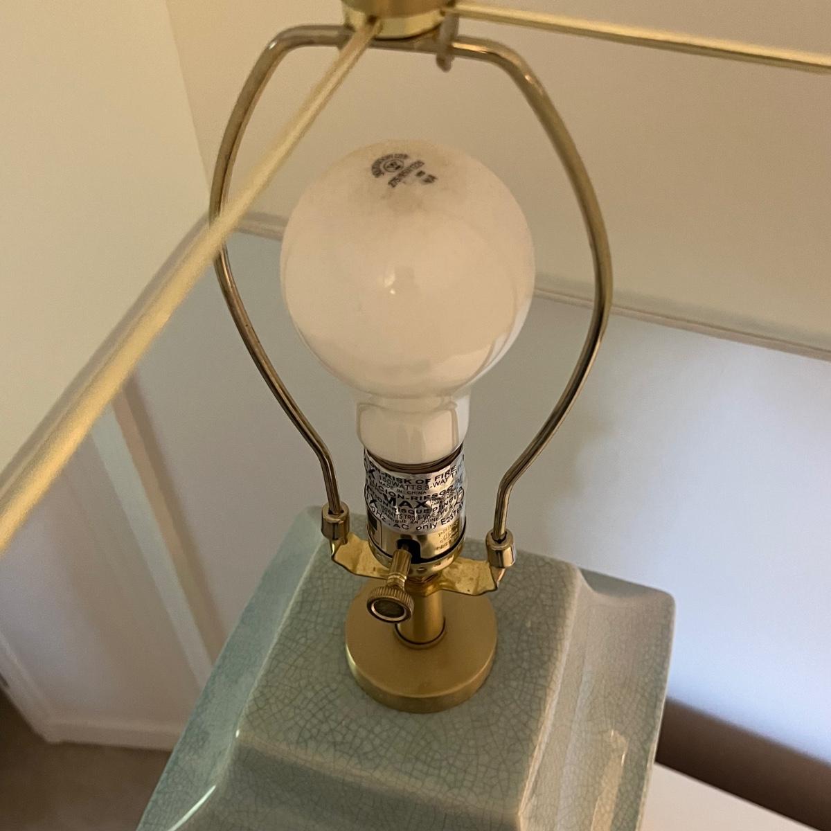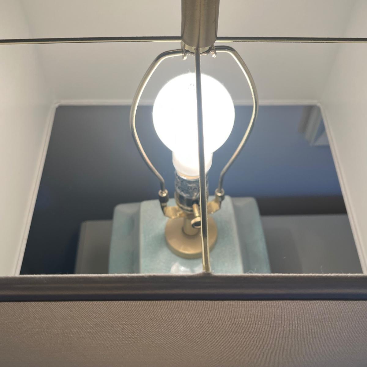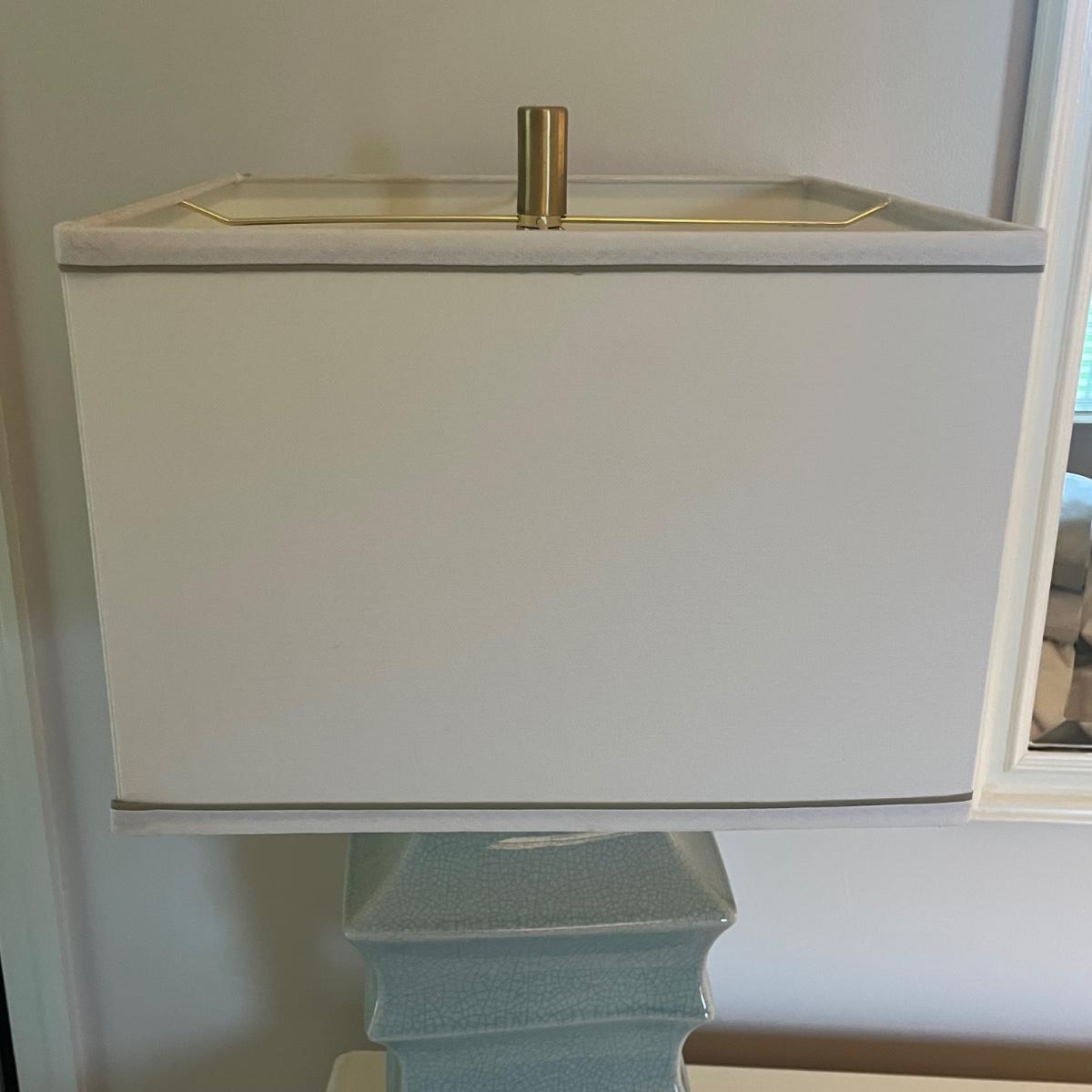 Lot includes two ceramic lamps with a Lucite base and square shades. Lamps measure 14.5” x 14.5” x 27”H with shade and have three way switches. Lamps powered on when plugged in.