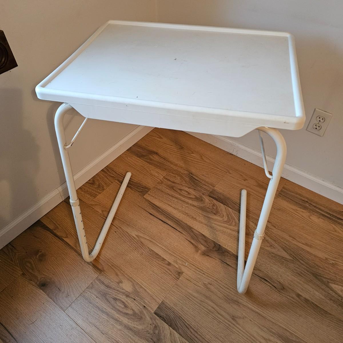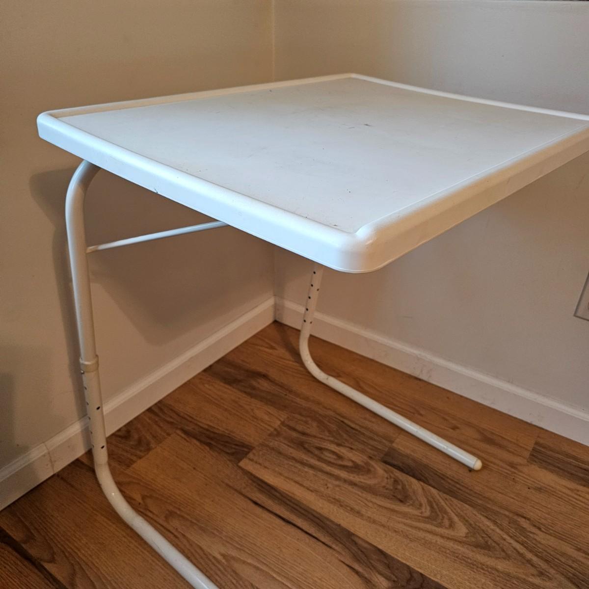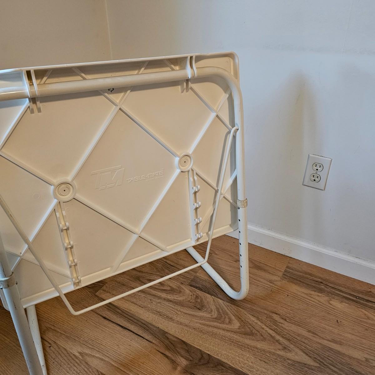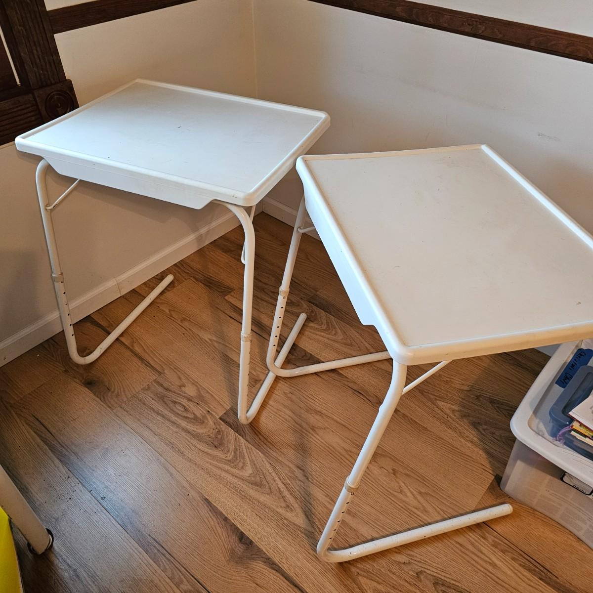 Two Table-Mate brand adjustable tables. Plastic tops, steel legs. Tops adjust from full flat to several different angles. Legs move up or down, can be used over a lap or with furniture. Tables measure 20" x 25.5" x 22-30"H. See photos for details. Local pickup only.