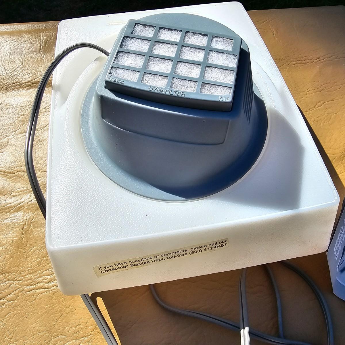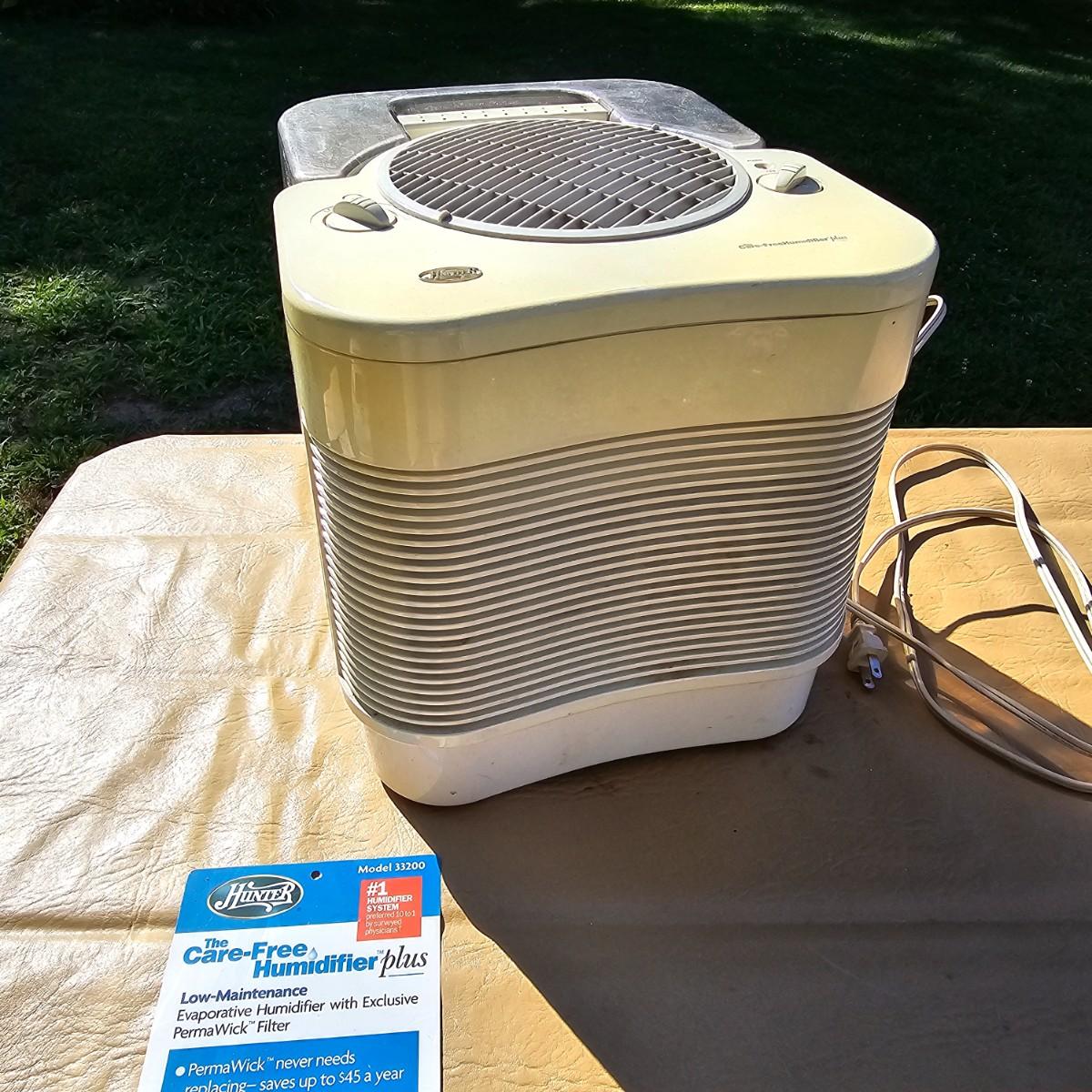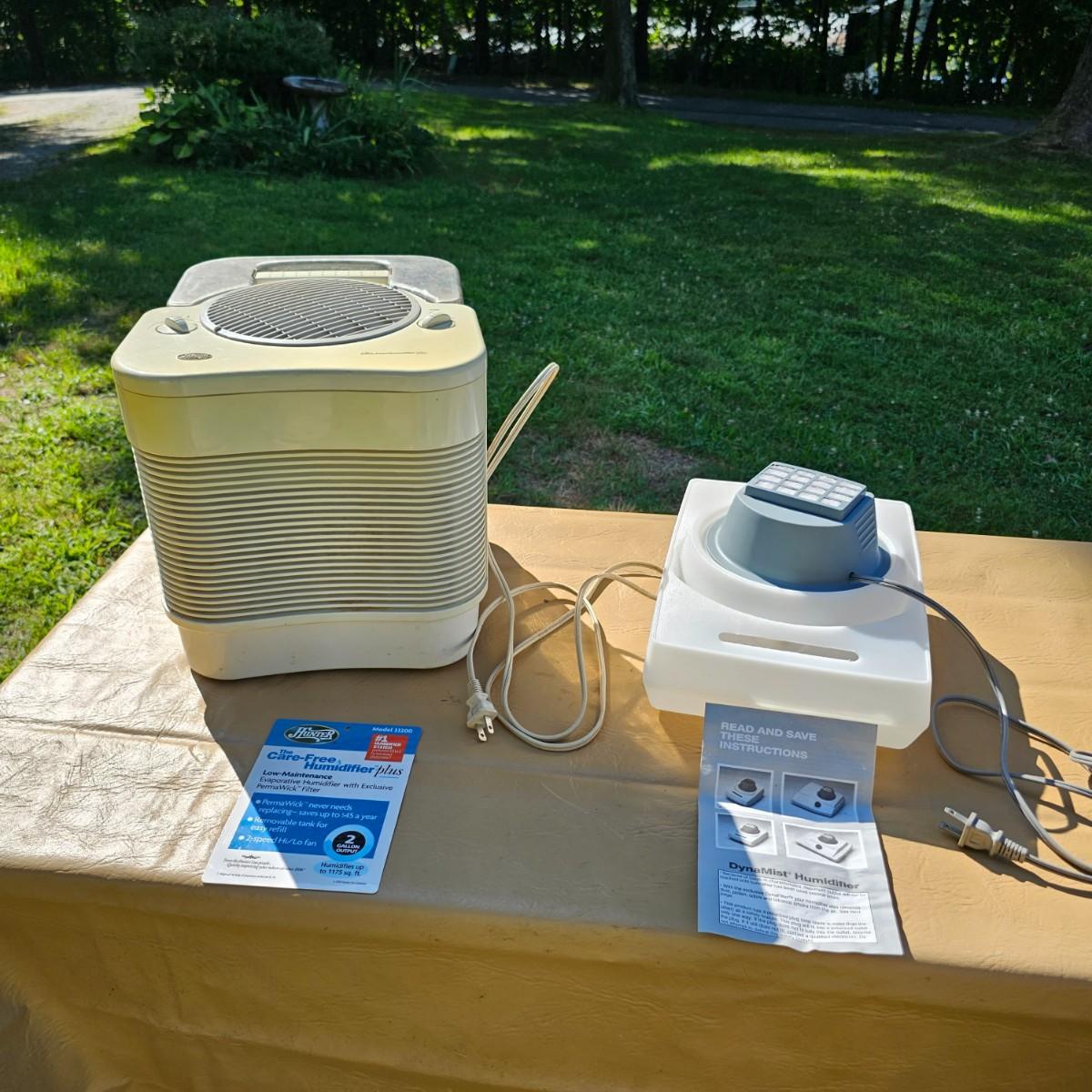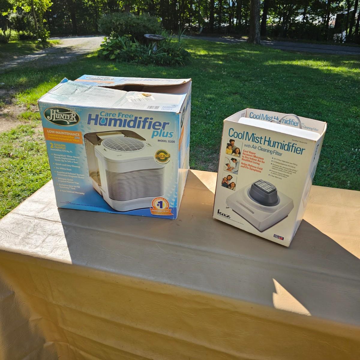 One Hunter and one Kaz small humidifiers. Two gallon and 1.2 gallon output respectively. Hunter measures 12" x 13" x 12"H, other is 9" x 22" x 7"H. Both units powered on when plugged in. The larger unit has some discoloration from age and storage. See photos for details. Shipping available.