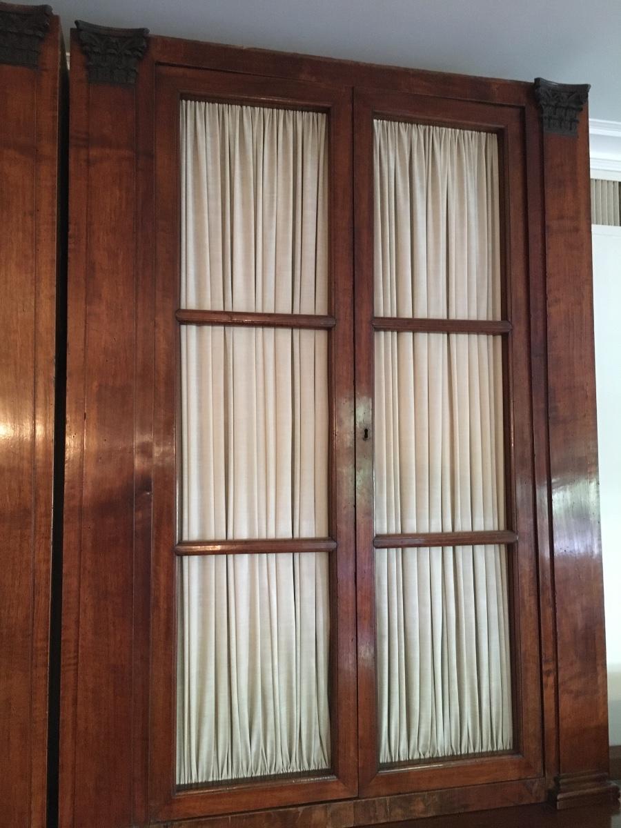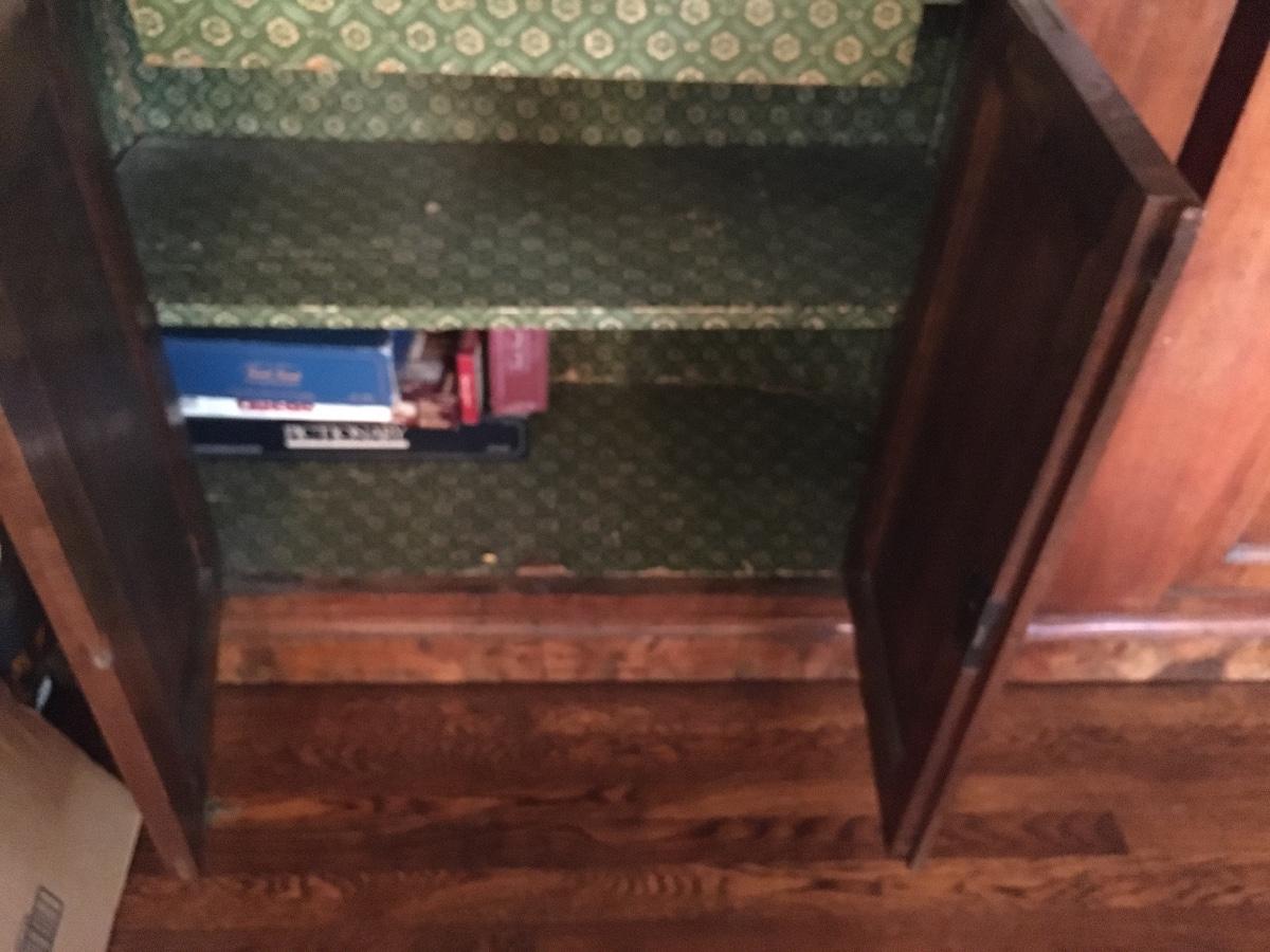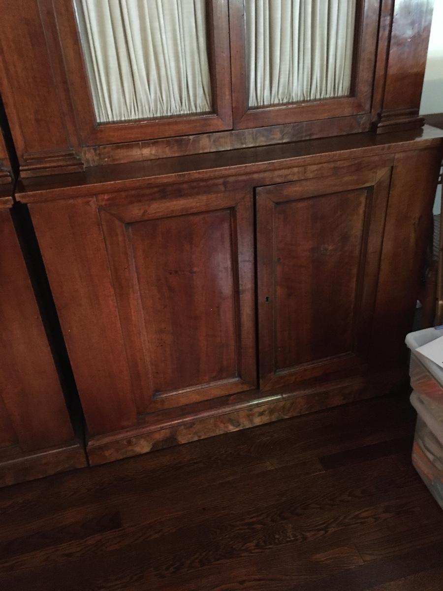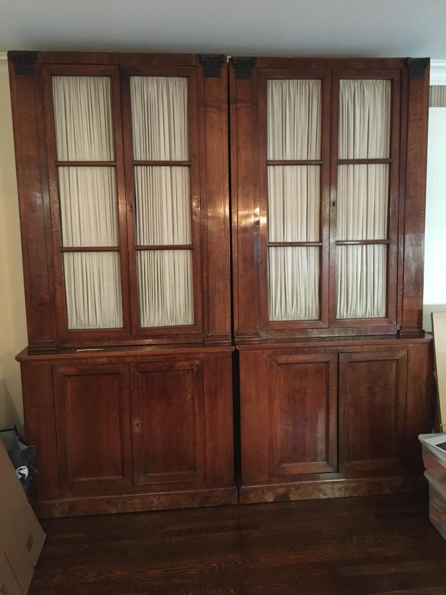 Storage, storage, storage! This pair of wood cabinets has shelving that doesn't quit. Curtained, but glassless upper doors open to reveal plenty of shelves. Lower doors open for even more shelving. Measurements are in photo although the top part where curtained windows are measure 60" high. Top cabinets are not attached so can be moved separately.