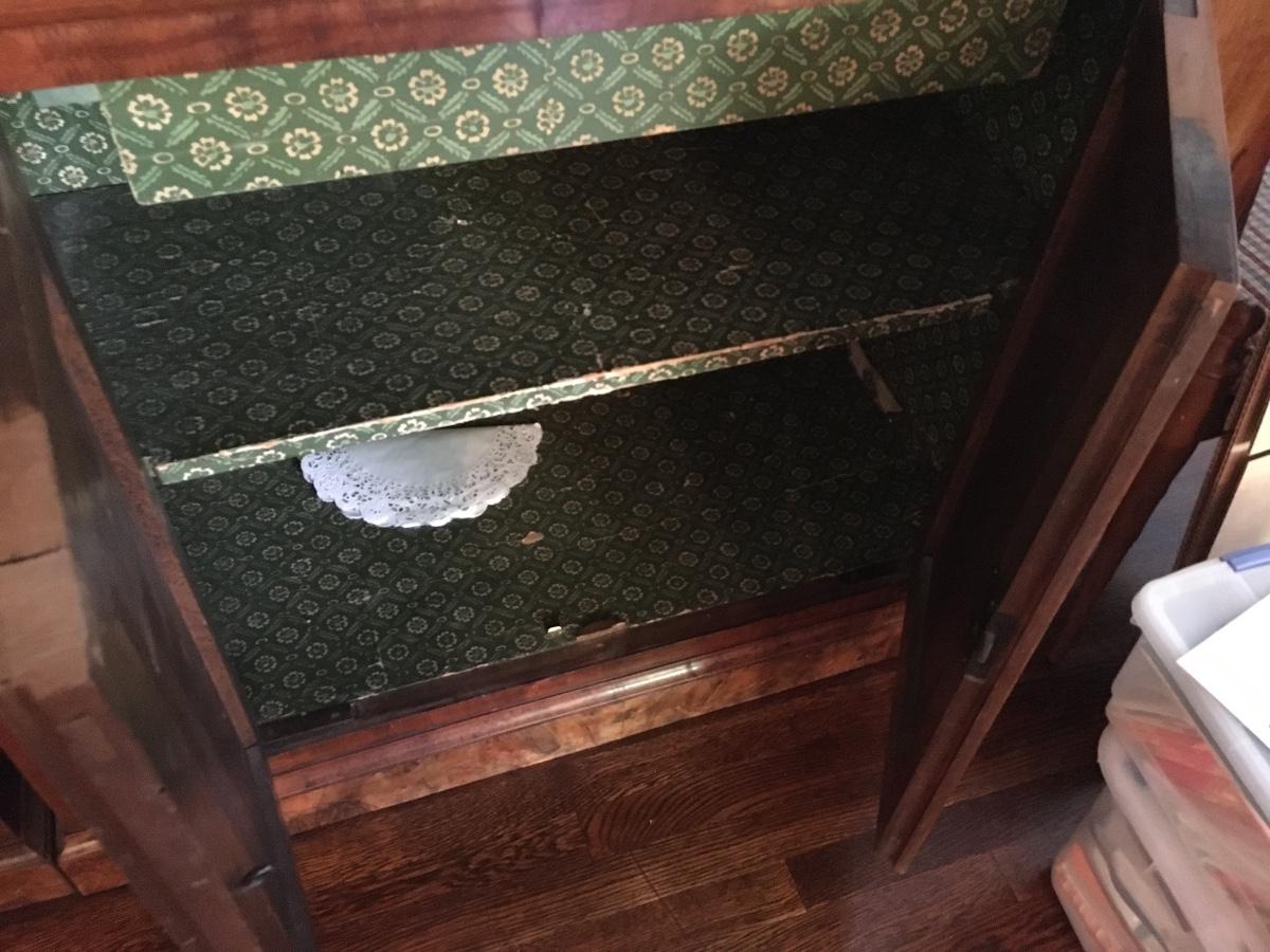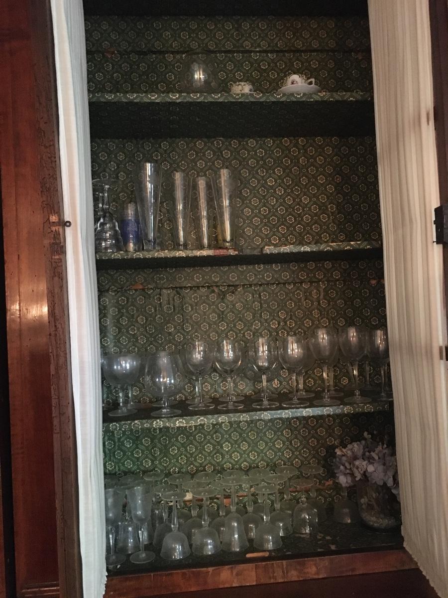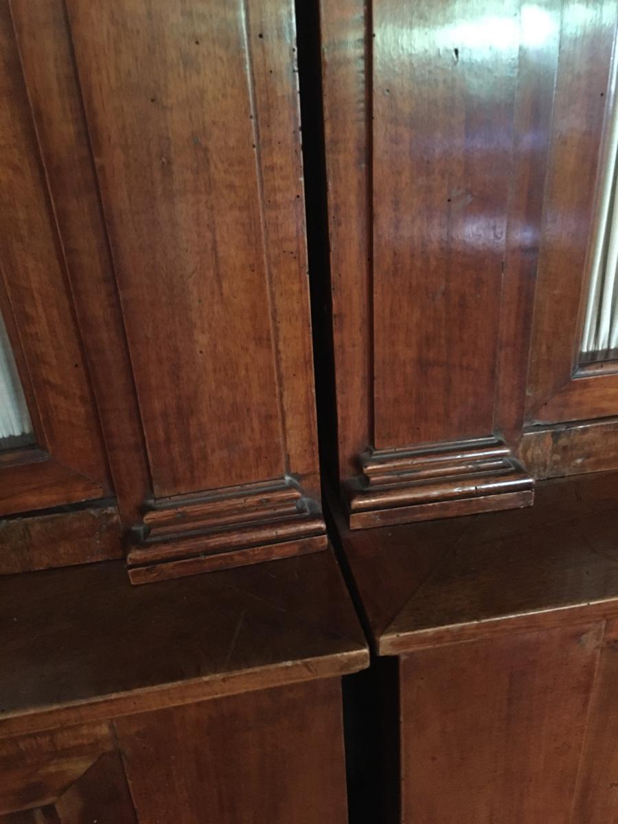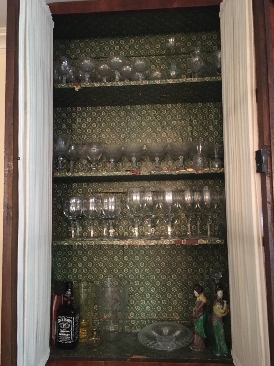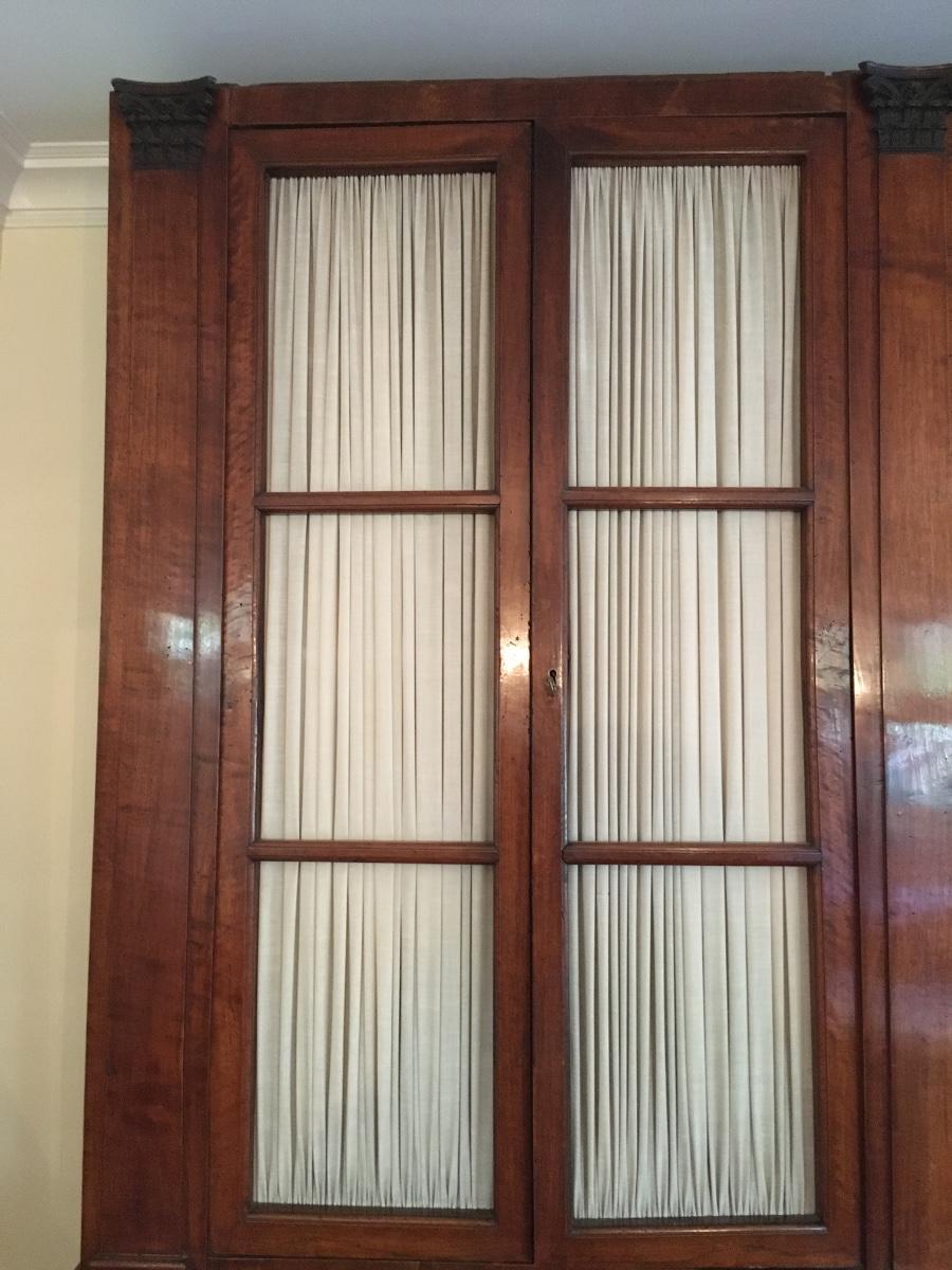 Storage, storage, storage! This pair of wood cabinets has shelving that doesn't quit. Curtained, but glassless upper doors open to reveal plenty of shelves. Lower doors open for even more shelving. Measurements are in photo although the top part where curtained windows are measure 60" high. Top cabinets are not attached so can be moved separately.