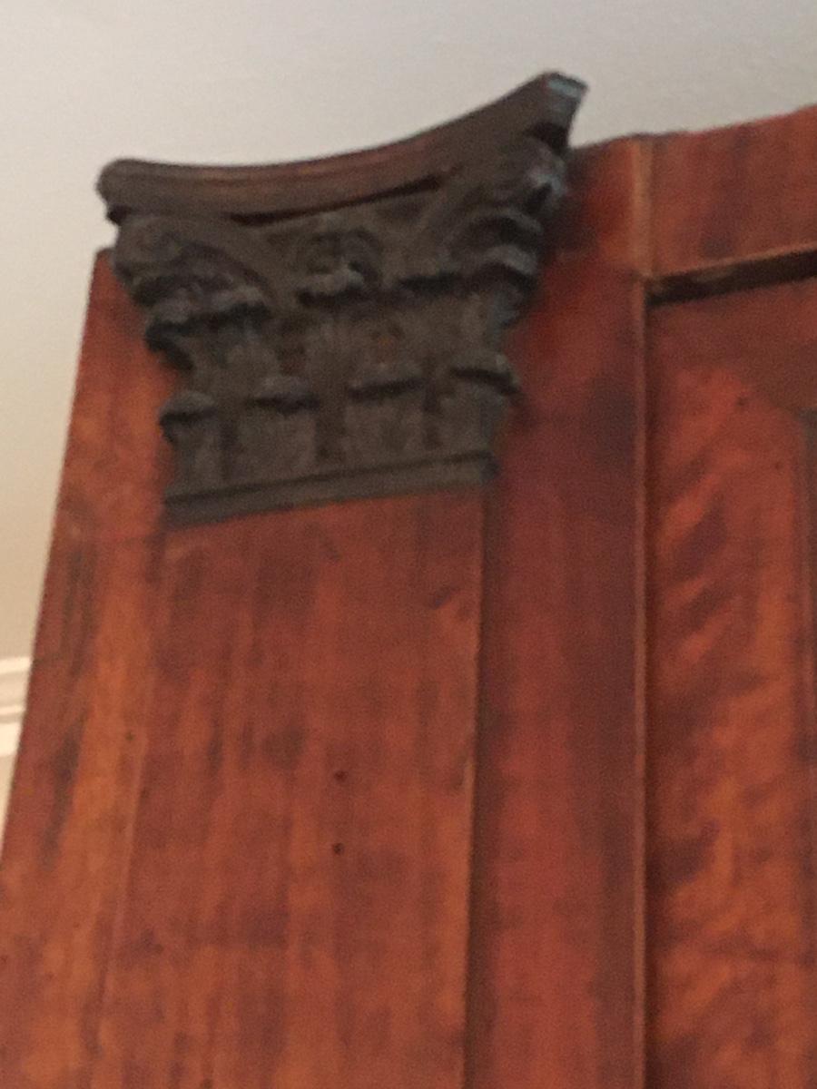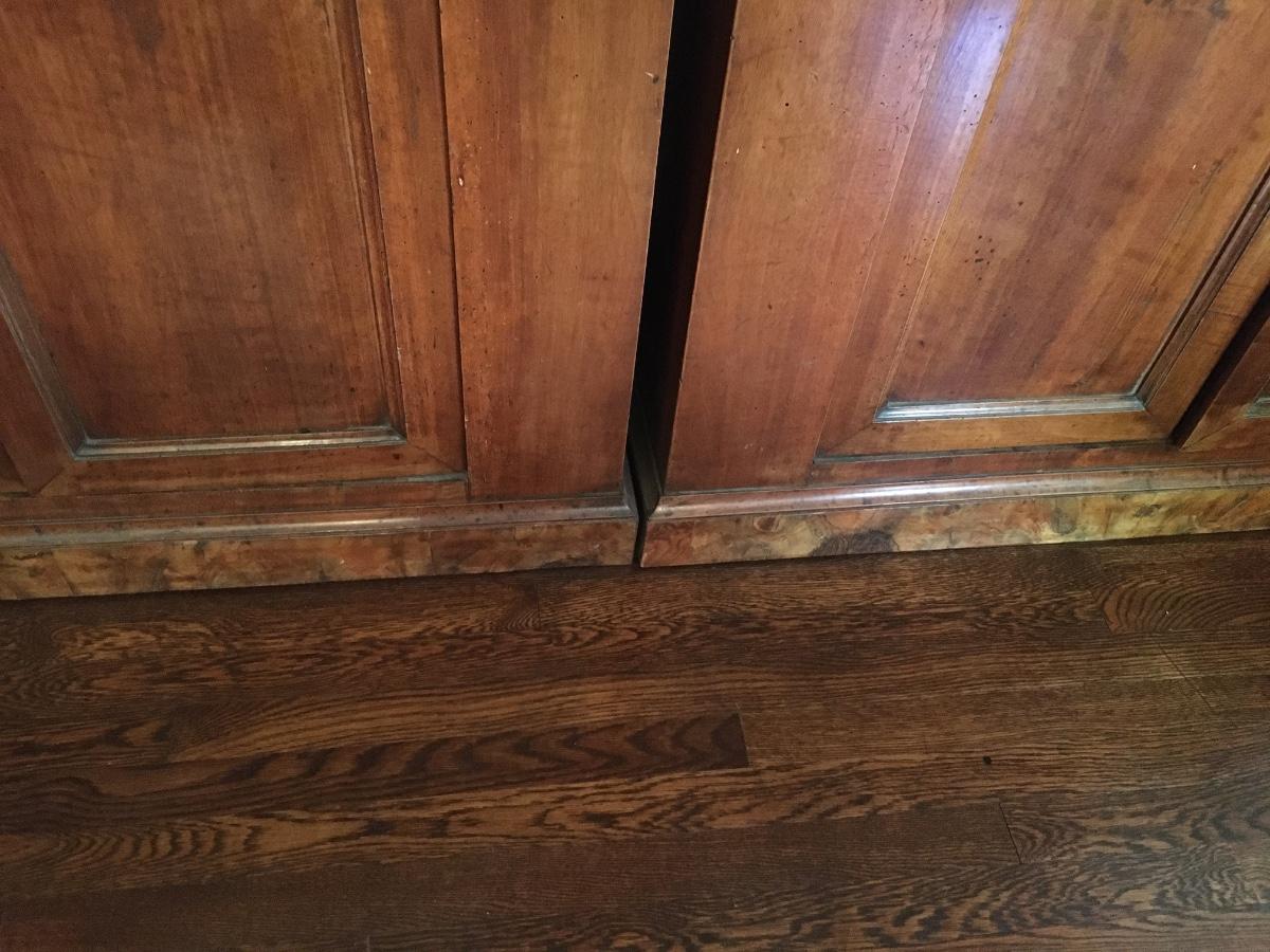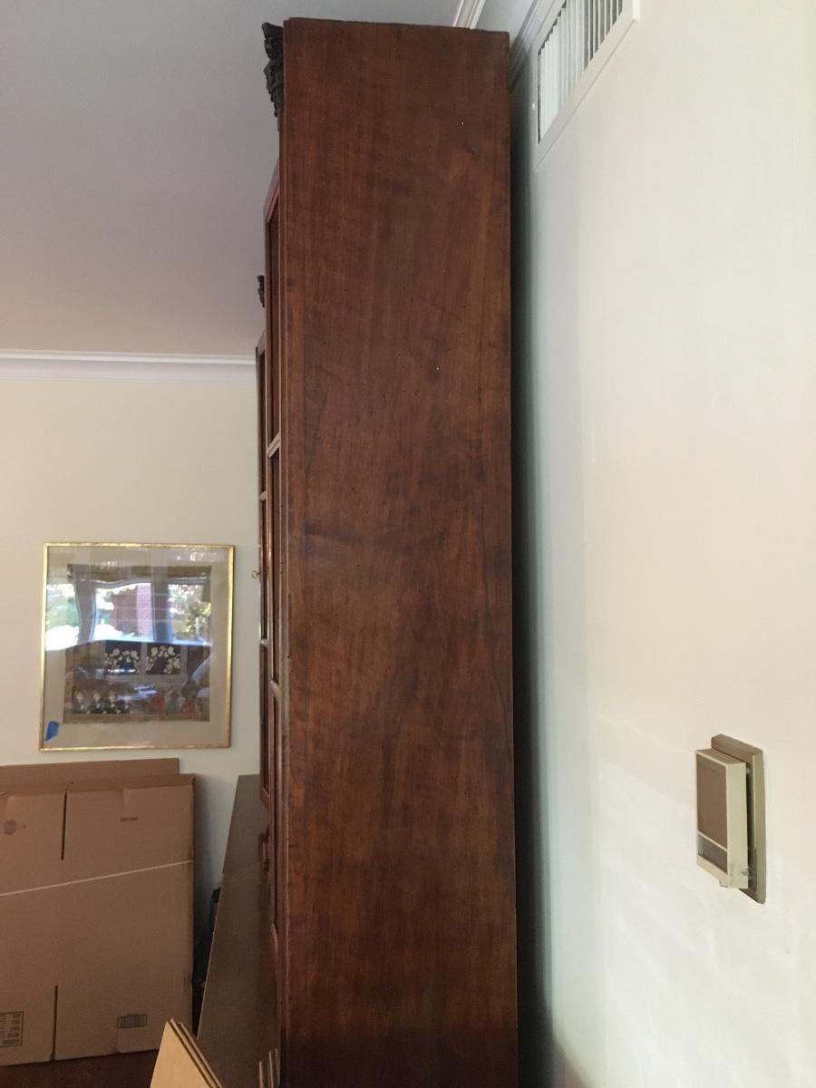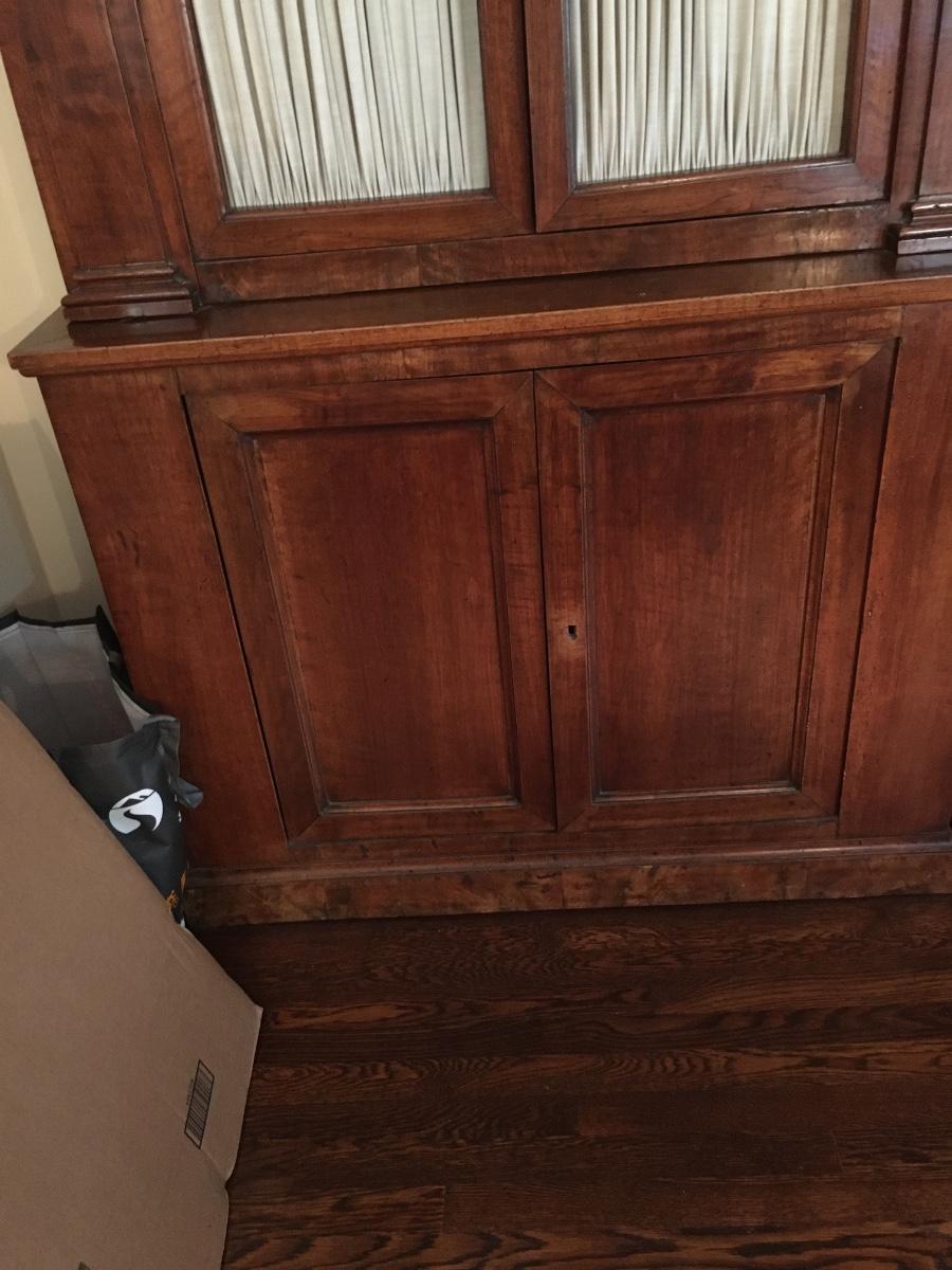 Storage, storage, storage! This pair of wood cabinets has shelving that doesn't quit. Curtained, but glassless upper doors open to reveal plenty of shelves. Lower doors open for even more shelving. Measurements are in photo although the top part where curtained windows are measure 60" high. Top cabinets are not attached so can be moved separately.