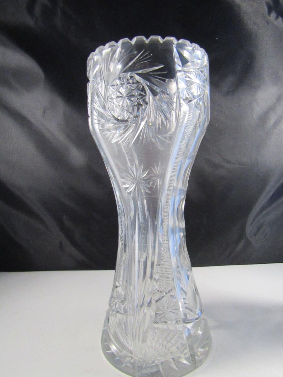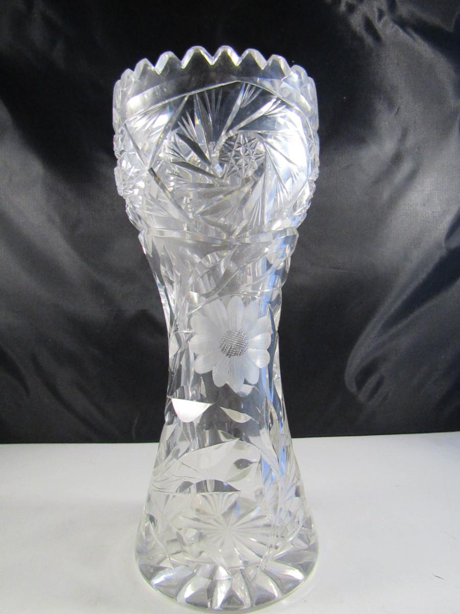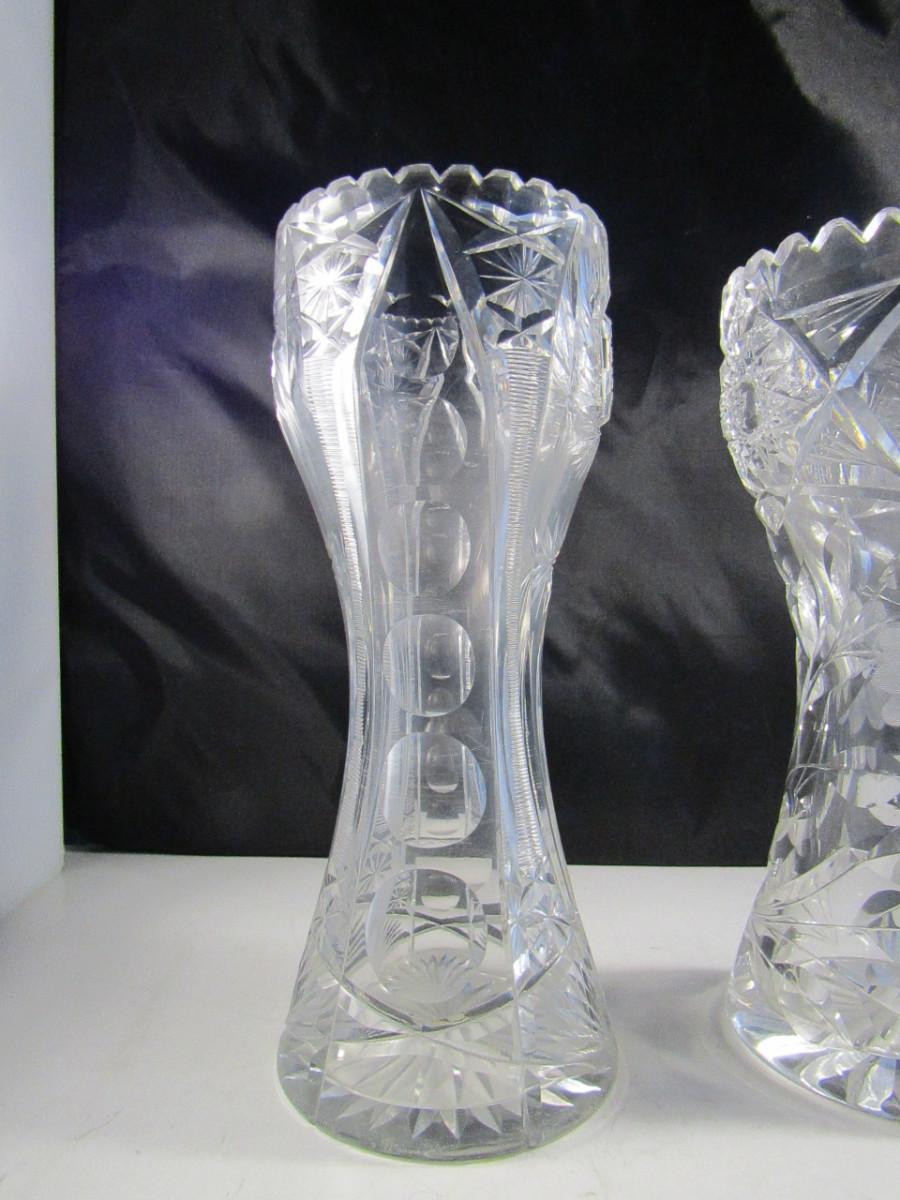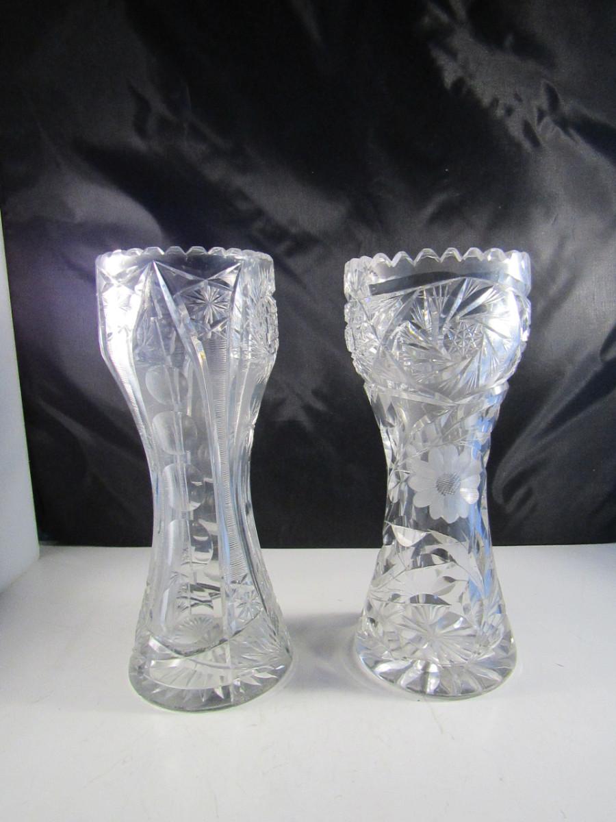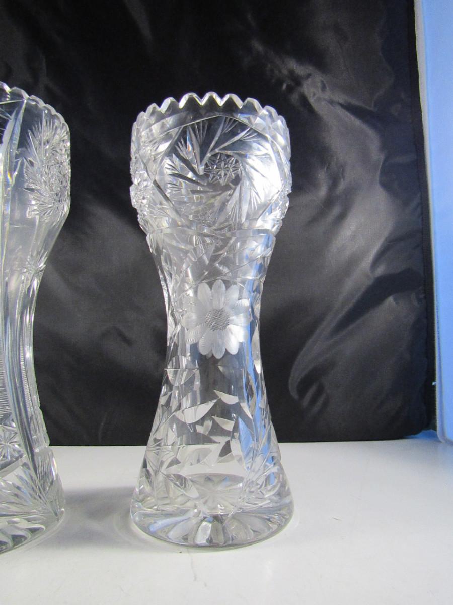 Pair of Tall Crystal Vases. Items are not identical.