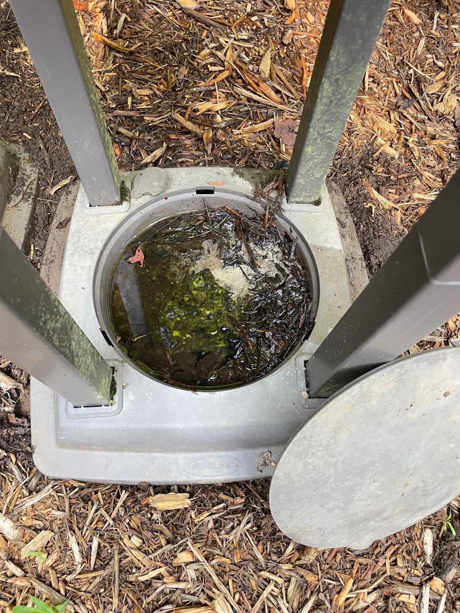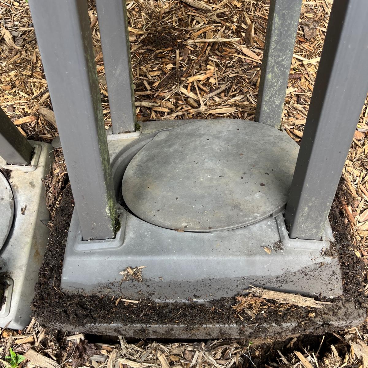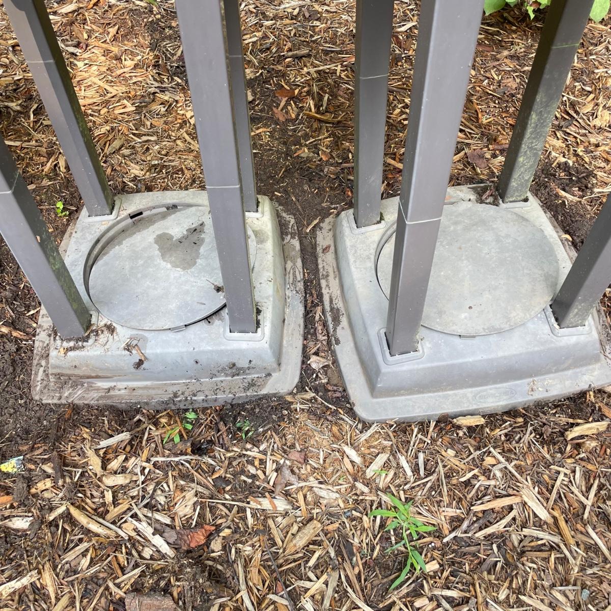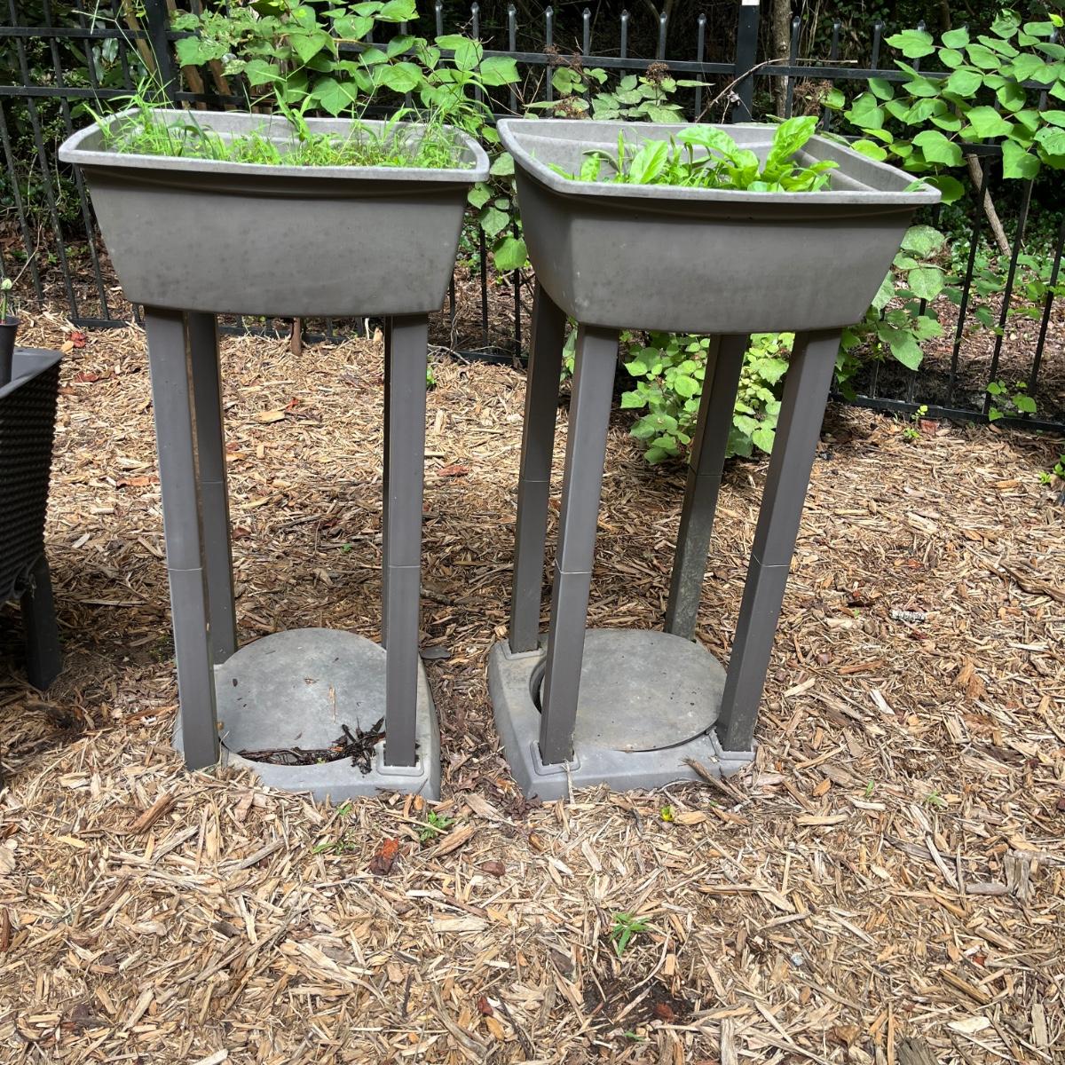 Lot includes two tall plastic plant containers that each measure 21” x 21” x 42”H. Base has a compartment to likely be filled for stability, it will need to be emptied prior to transport. Plants and soil are included but can be dumped on sight if desired.
