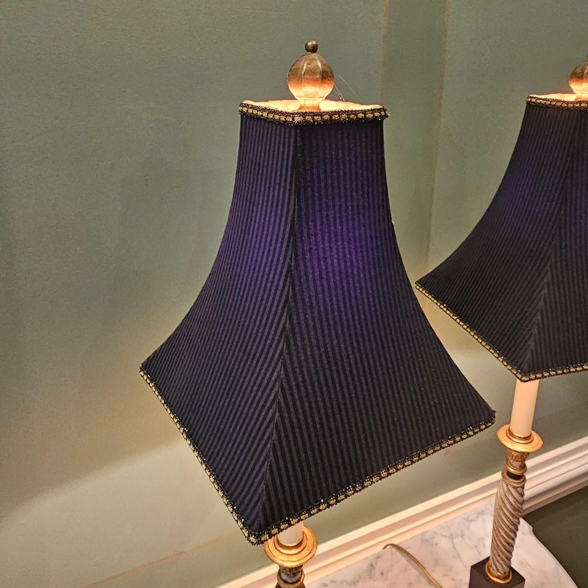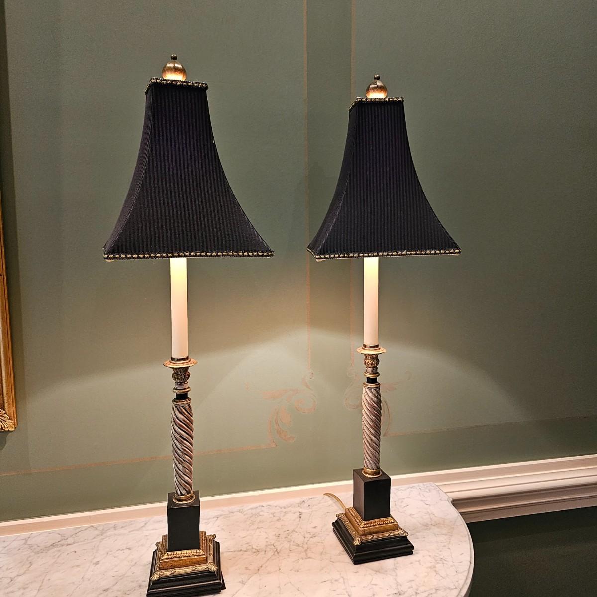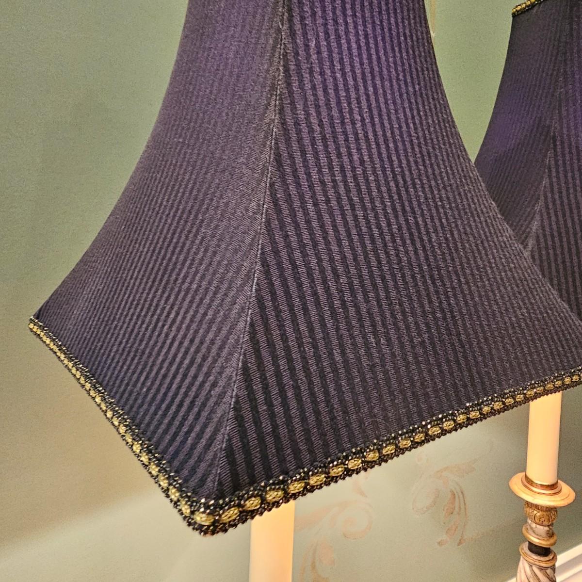 Two black and gold table lamps with black tapered shades. Lamps appear to be made of synthetic material with cloth shades. Each lamp measures 9.5" x 9.5" x 34"H. Single style switch. See photos for details. Shipping available.
