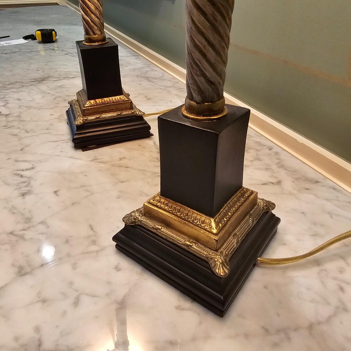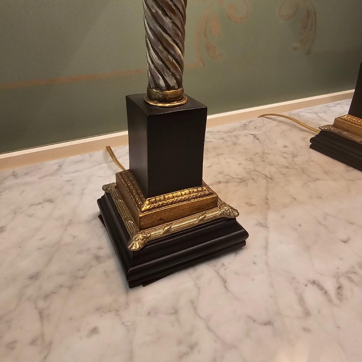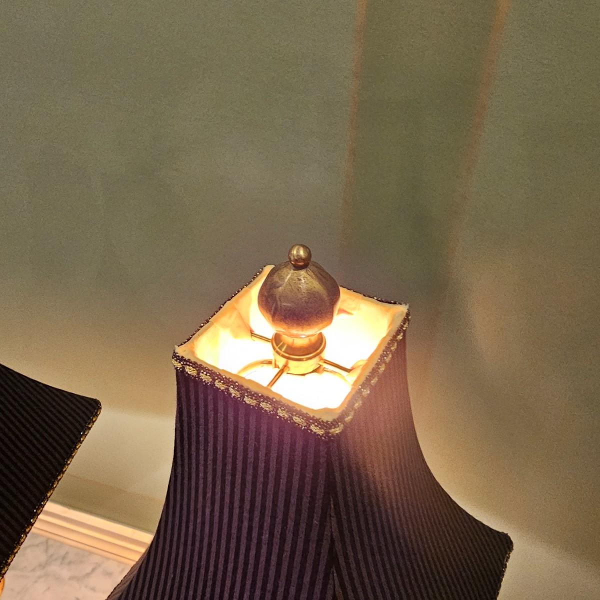 Two black and gold table lamps with black tapered shades. Lamps appear to be made of synthetic material with cloth shades. Each lamp measures 9.5" x 9.5" x 34"H. Single style switch. See photos for details. Shipping available.