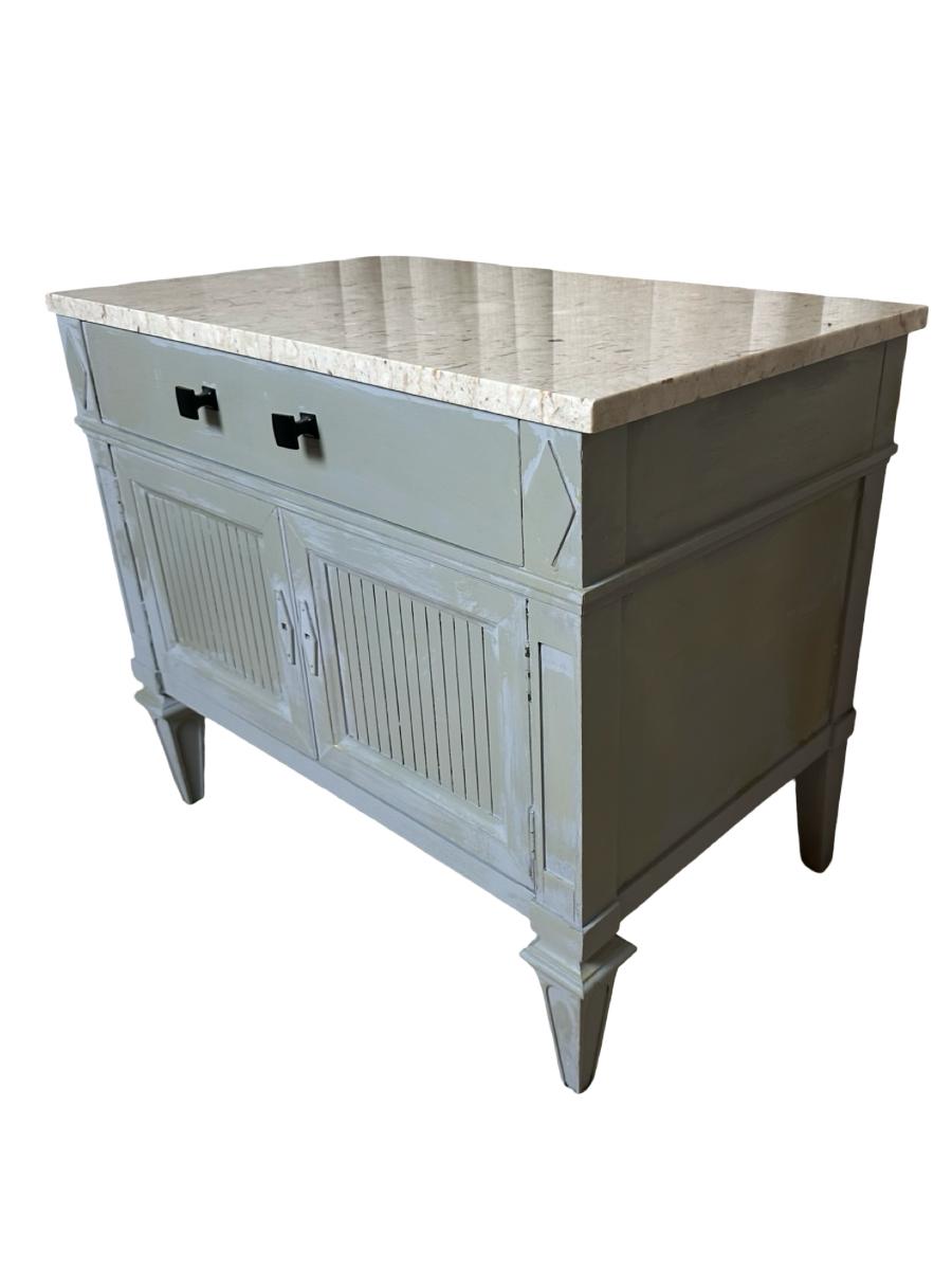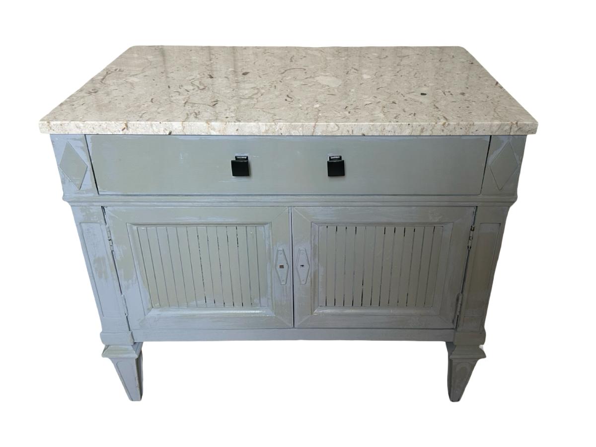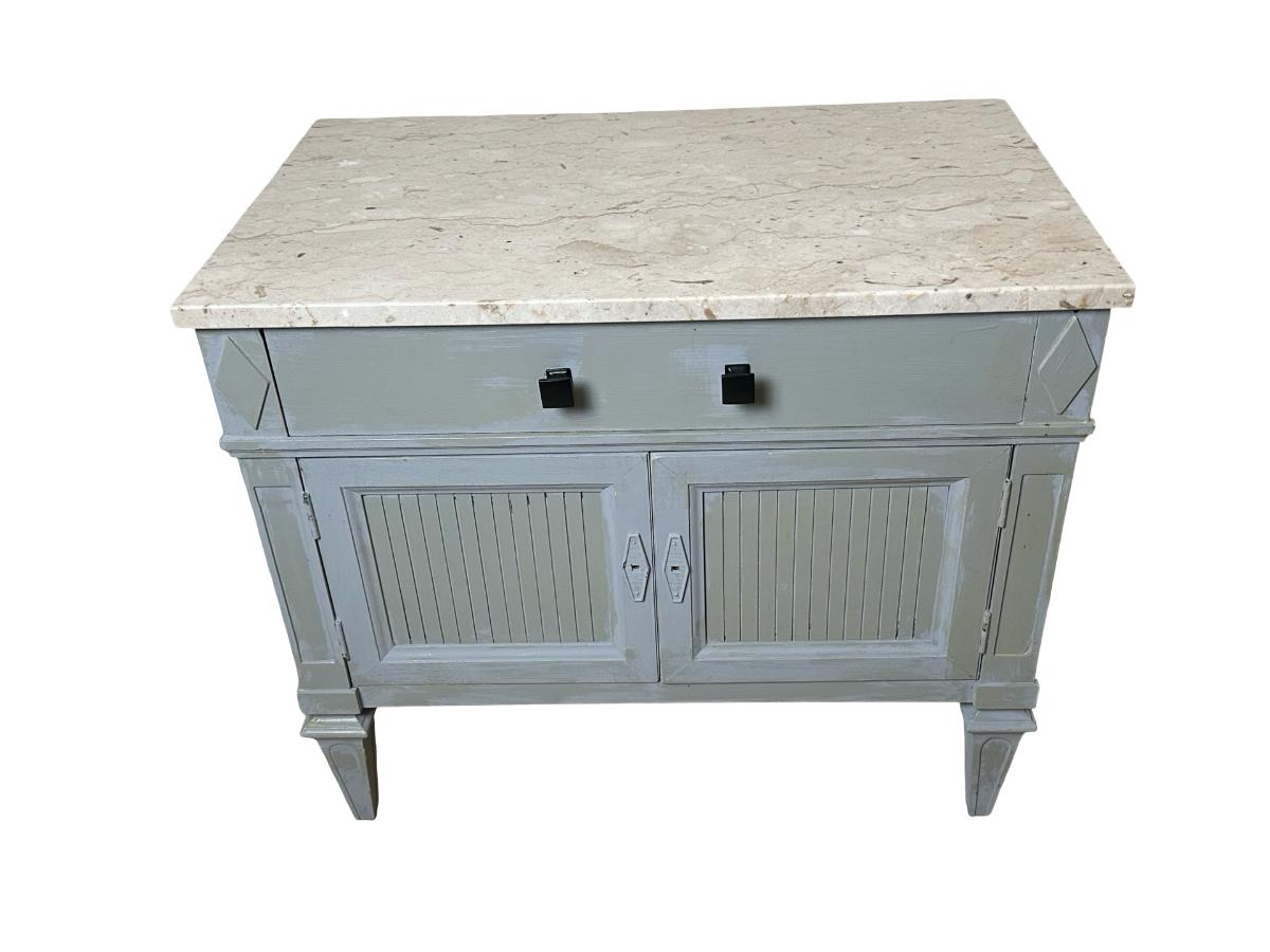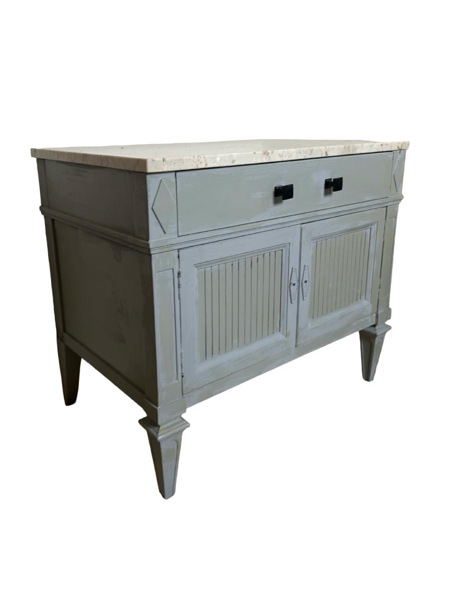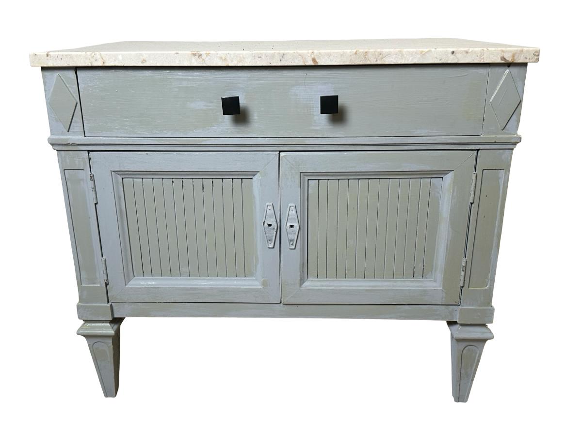 Pair of Thomsville nightstands featuring solid construction with a painted finish and marble tops. Each stand includes one upper drawer and double-door cabinet storage below. Need knobs for the cabinet to open properly.