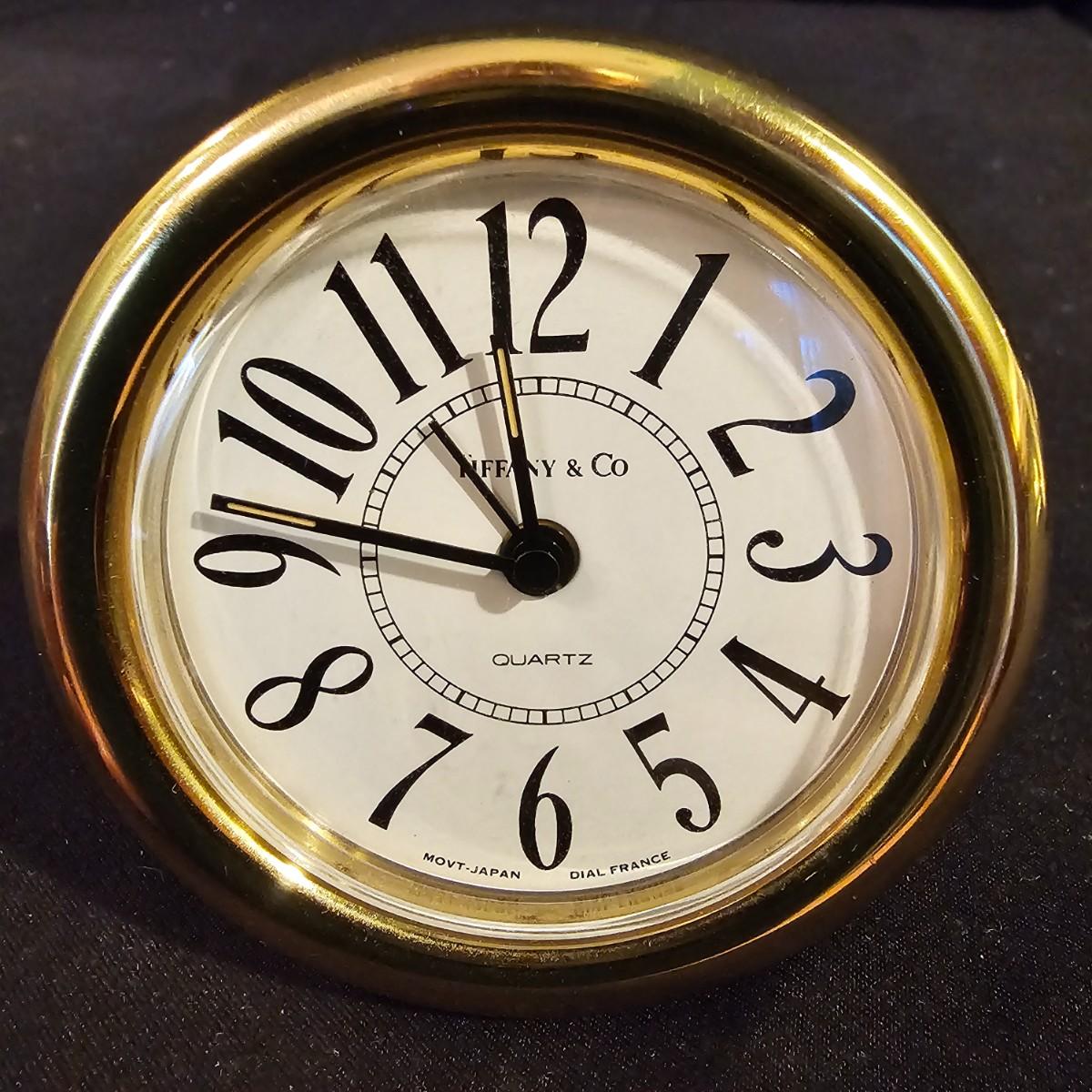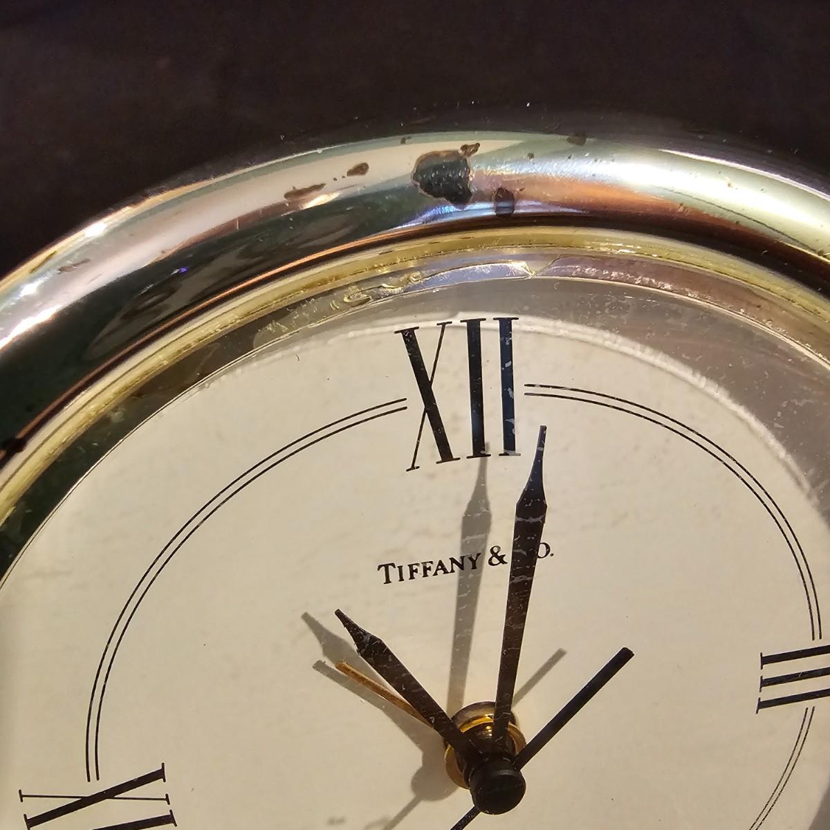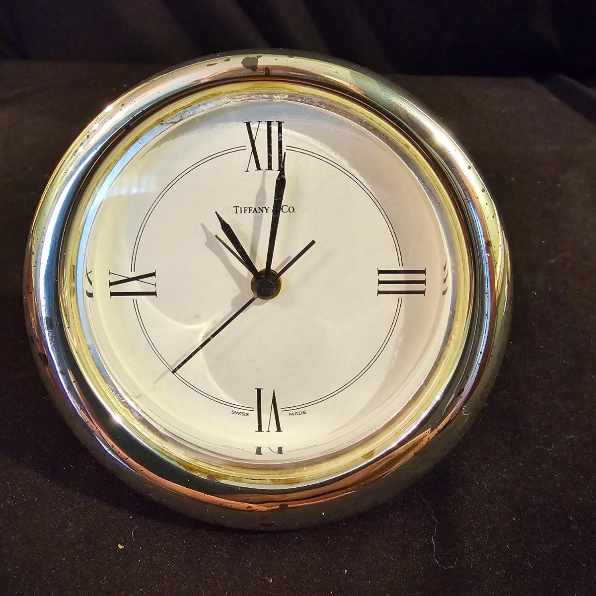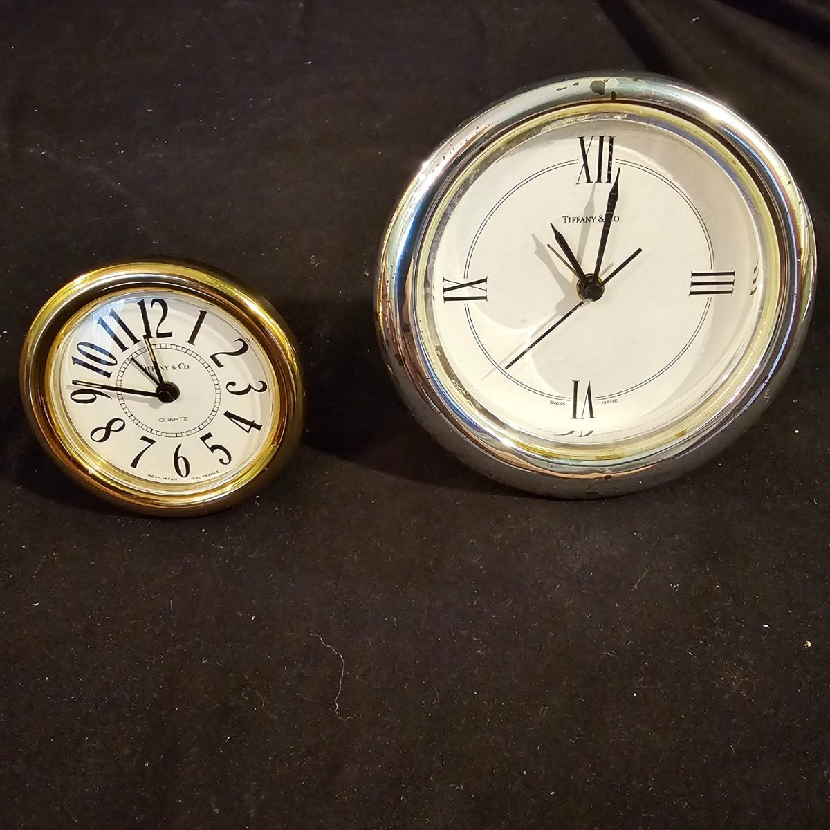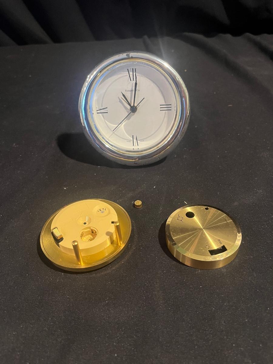 A pair of small battery operated table clocks by Tiffany & Co. Smaller item is brass, measures 2.75" x 1". Some small pieces in bag go with the larger silver colored clock; it measures 4.25" x 1.25" and has machined aluminum base. Silver colored clock has black spots, see pictures. Neither clock currently running, probably need batteries. See photos for details. Shipping available.