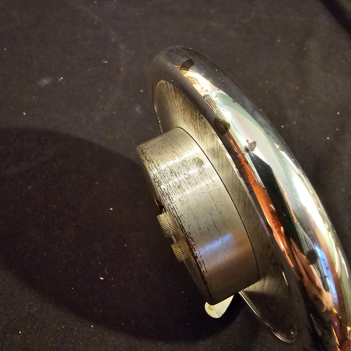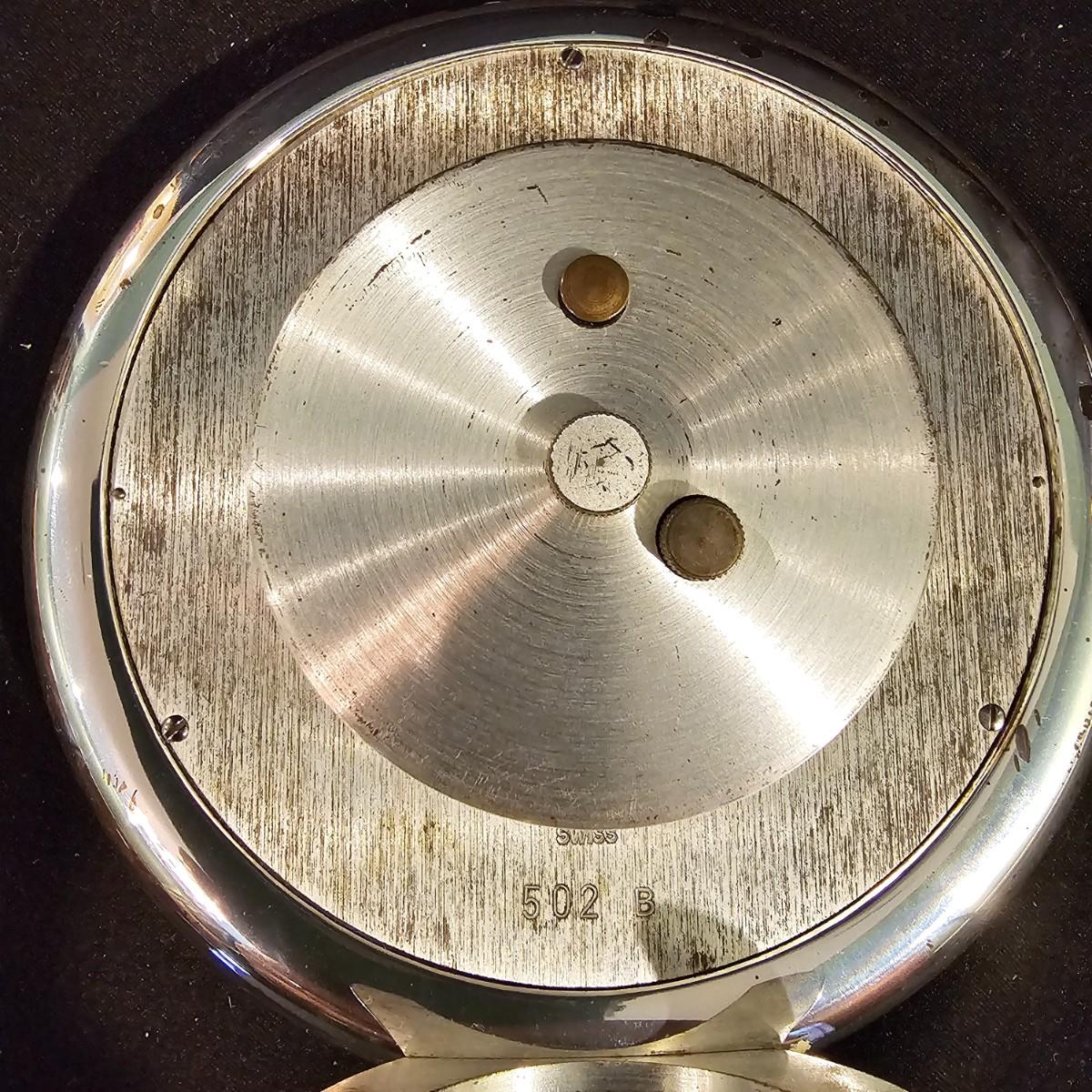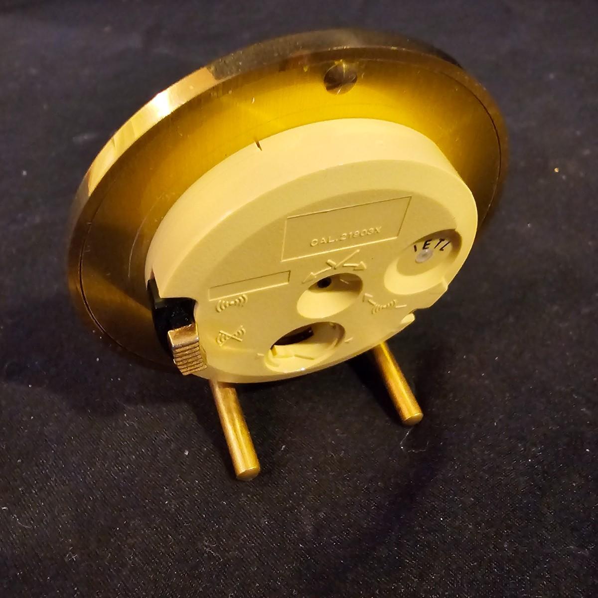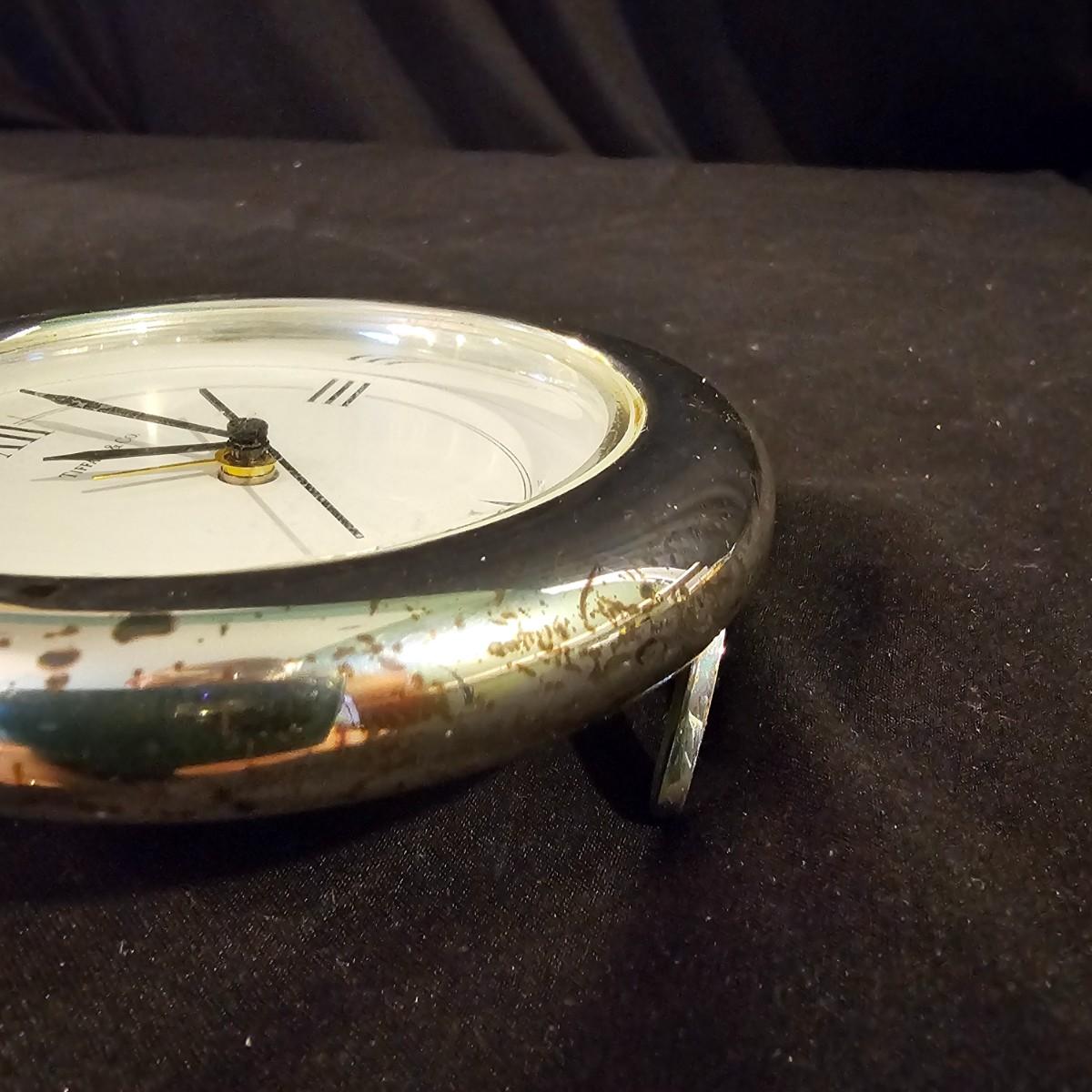 A pair of small battery operated table clocks by Tiffany & Co. Smaller item is brass, measures 2.75" x 1". Some small pieces in bag go with the larger silver colored clock; it measures 4.25" x 1.25" and has machined aluminum base. Silver colored clock has black spots, see pictures. Neither clock currently running, probably need batteries. See photos for details. Shipping available.