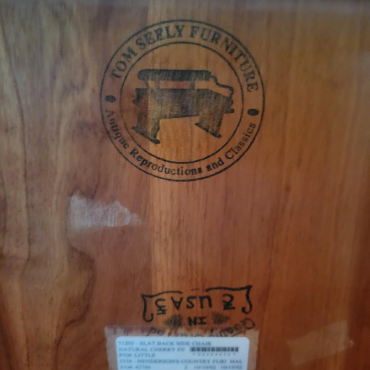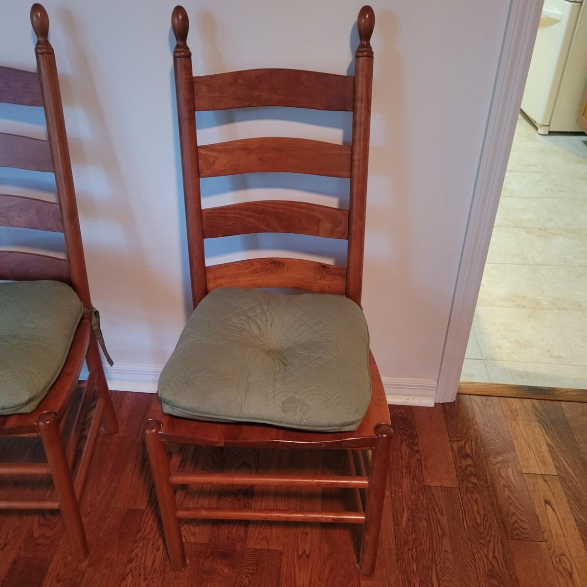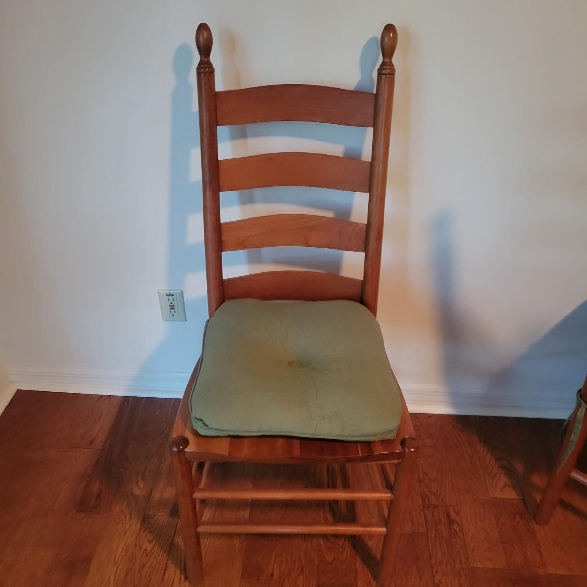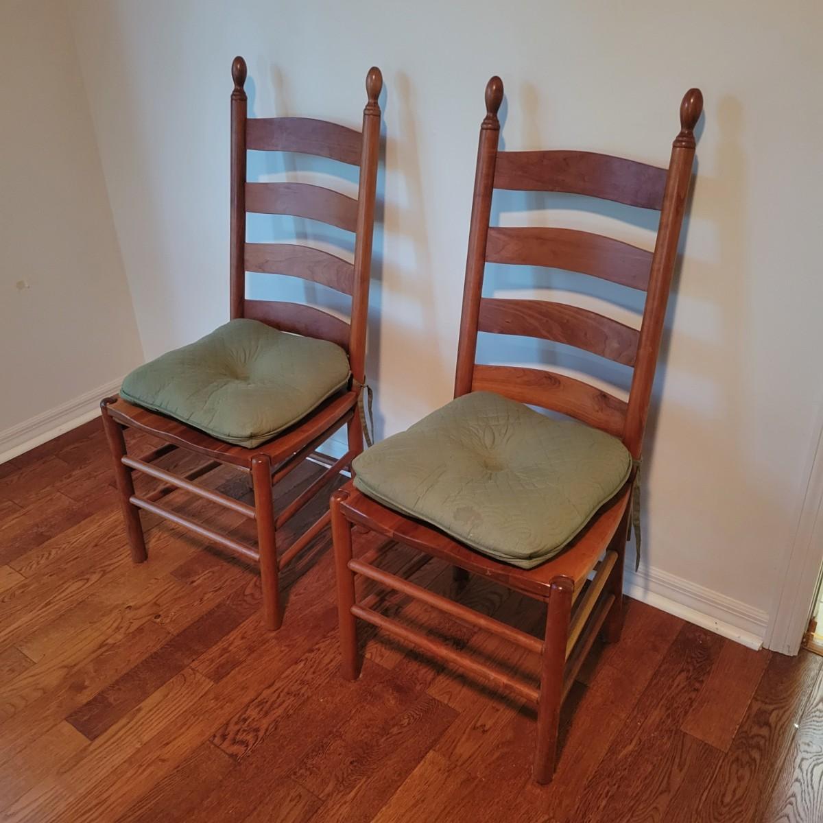 A pair of Tom Seely solid wood chairs that include seat cushions. The chairs feature a rich cherry stain and they each measure approximately 19" x 18" x 43.5"H with a seat height of 17.5". This lot also includes a pair of matching seat cushions that have a quilted pattern with green fabric. Some spots on cushions. They appaear to be machine washable. Local pickup only.
