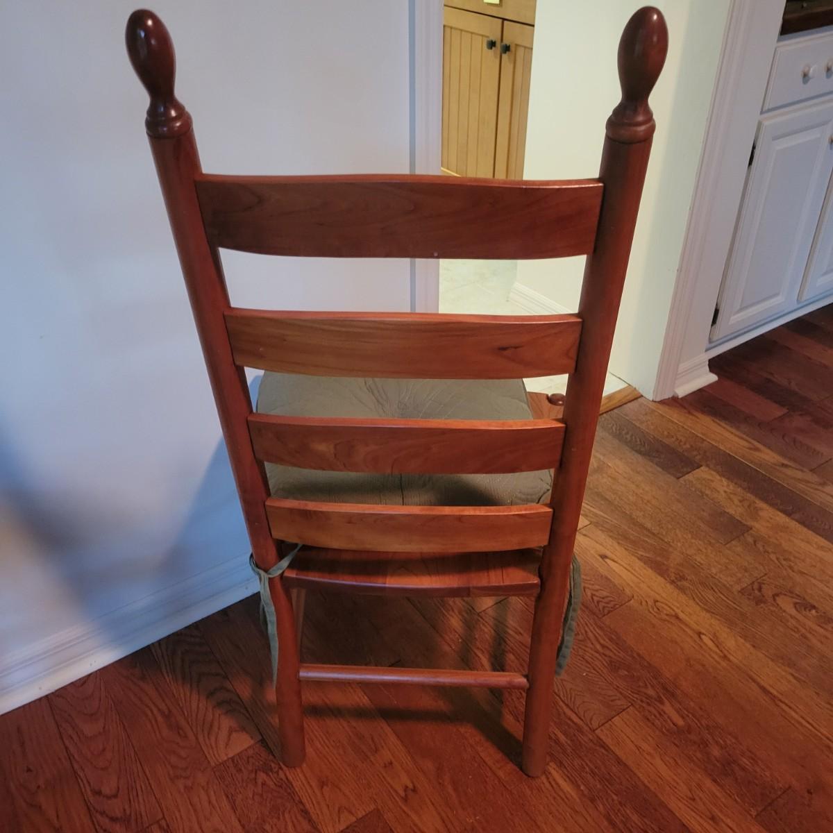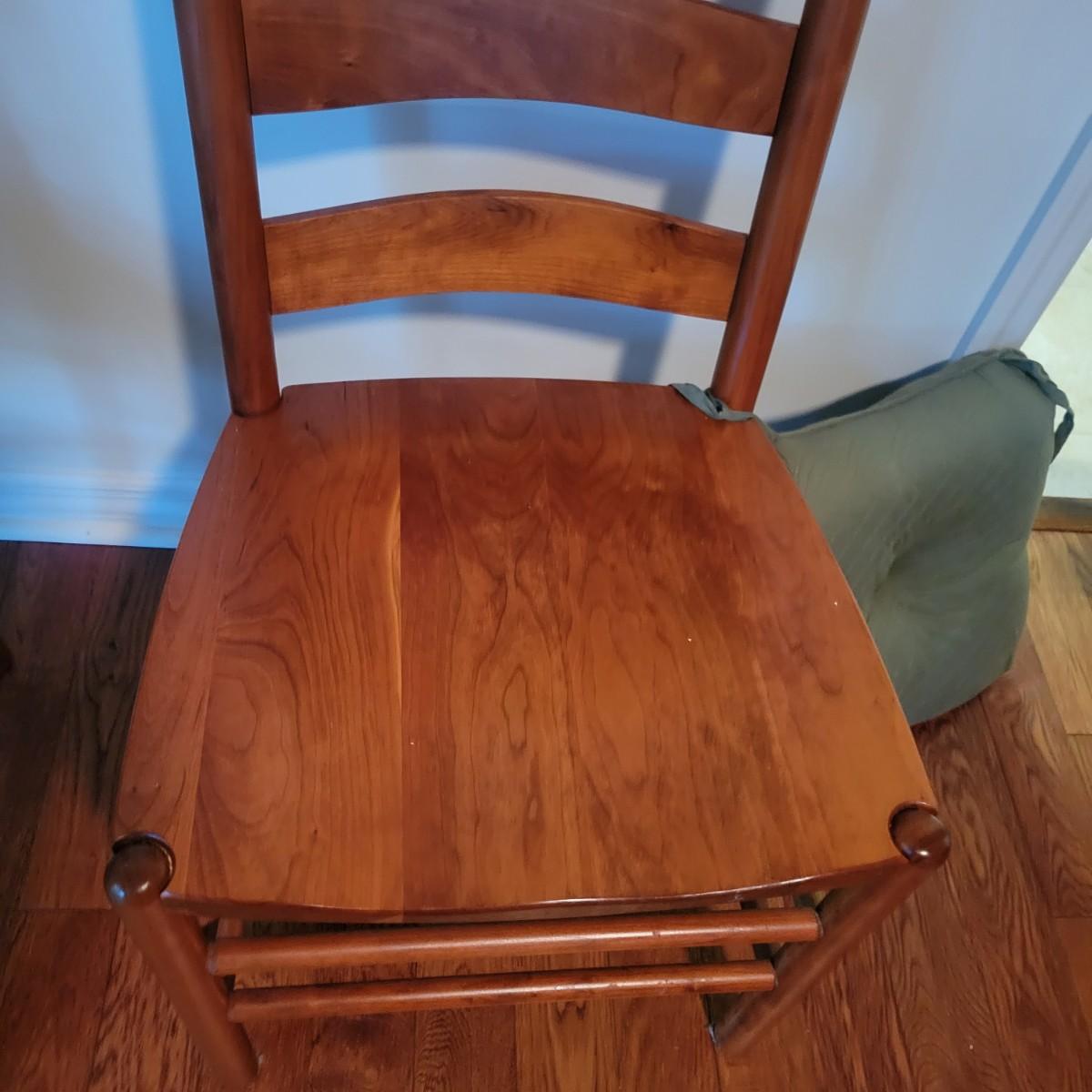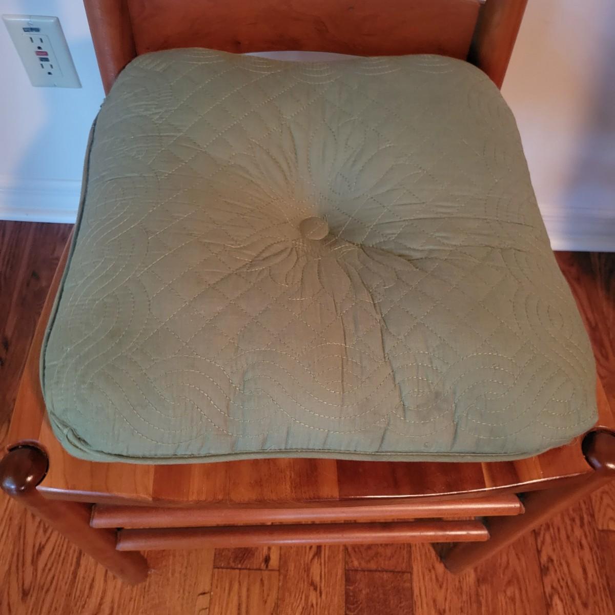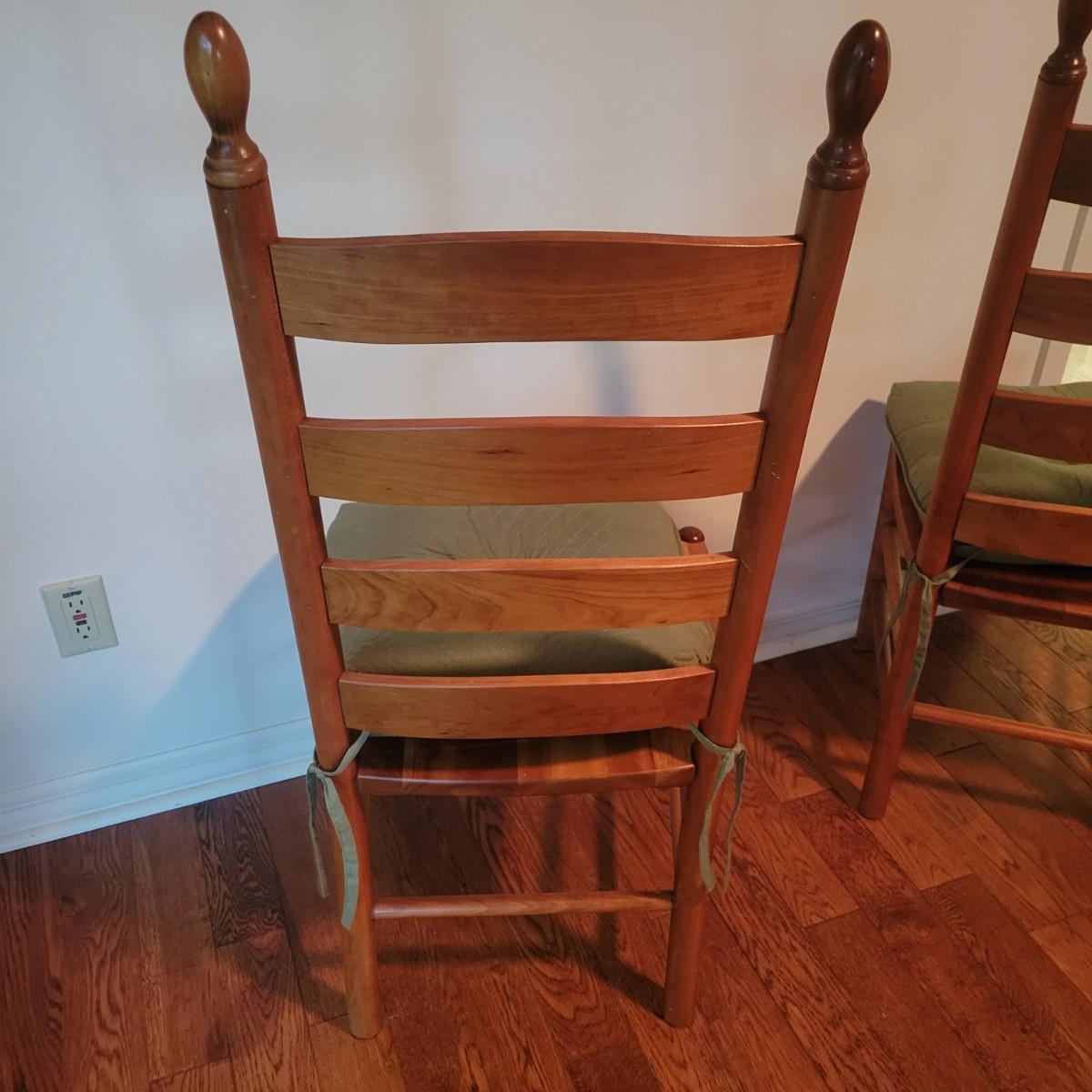 A pair of Tom Seely solid wood chairs that include seat cushions. The chairs feature a rich cherry stain and they each measure approximately 19" x 18" x 43.5"H with a seat height of 17.5". This lot also includes a pair of matching seat cushions that have a quilted pattern with green fabric. Some spots on cushions. They appaear to be machine washable. Local pickup only.