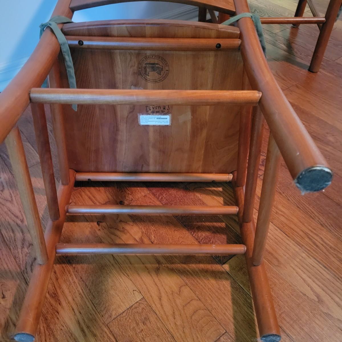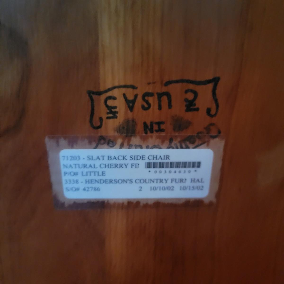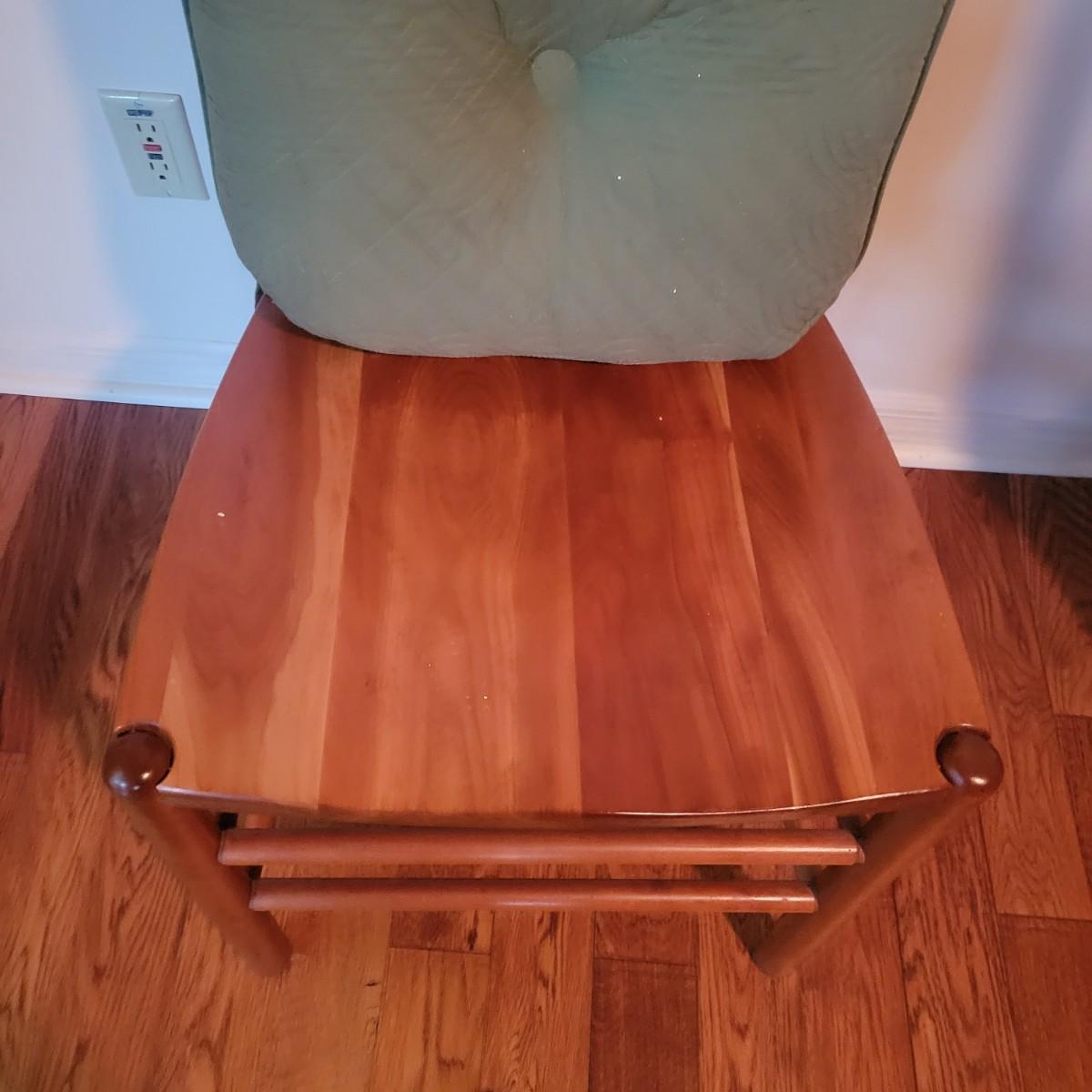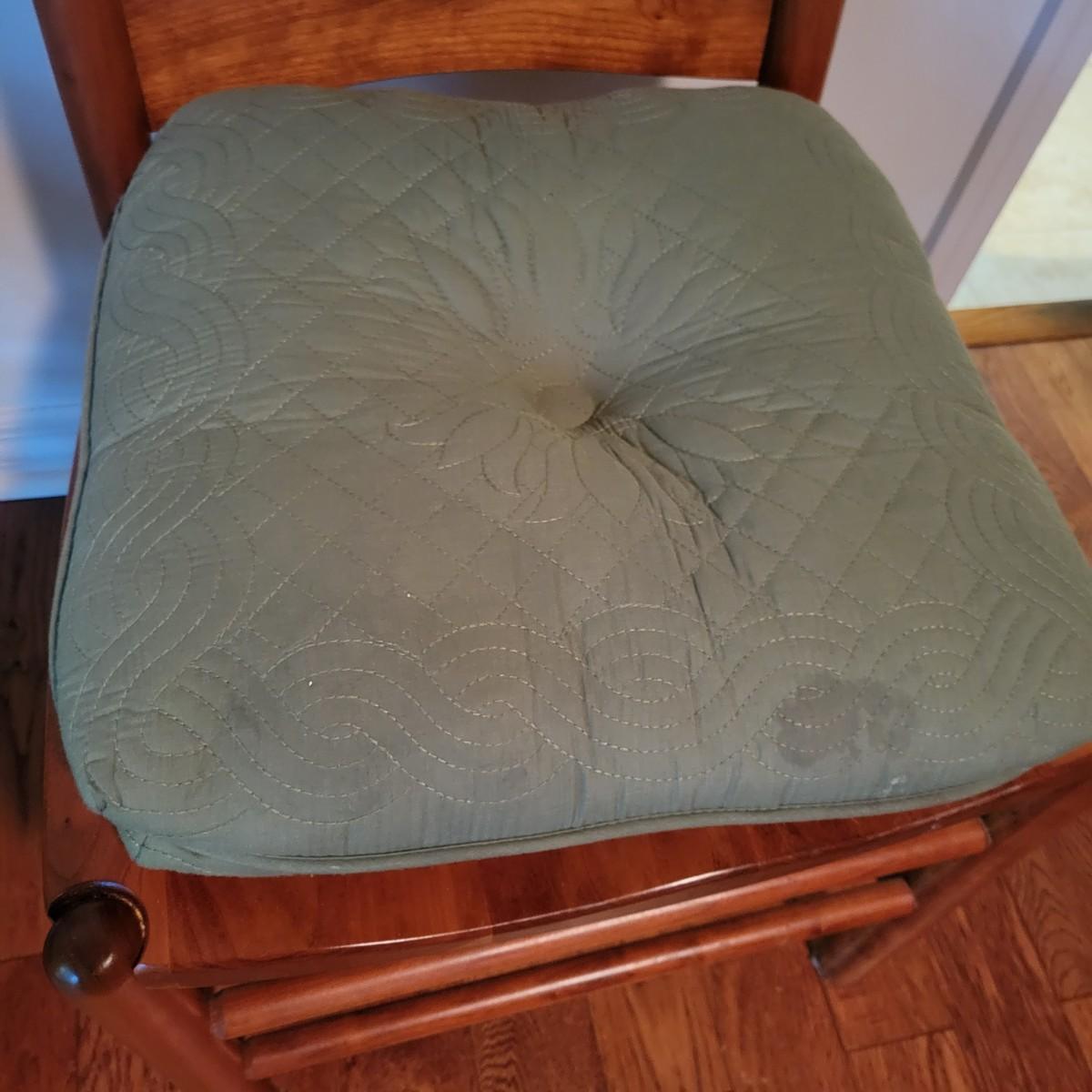 A pair of Tom Seely solid wood chairs that include seat cushions. The chairs feature a rich cherry stain and they each measure approximately 19" x 18" x 43.5"H with a seat height of 17.5". This lot also includes a pair of matching seat cushions that have a quilted pattern with green fabric. Some spots on cushions. They appaear to be machine washable. Local pickup only.