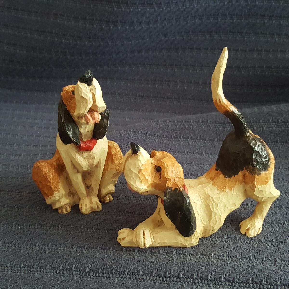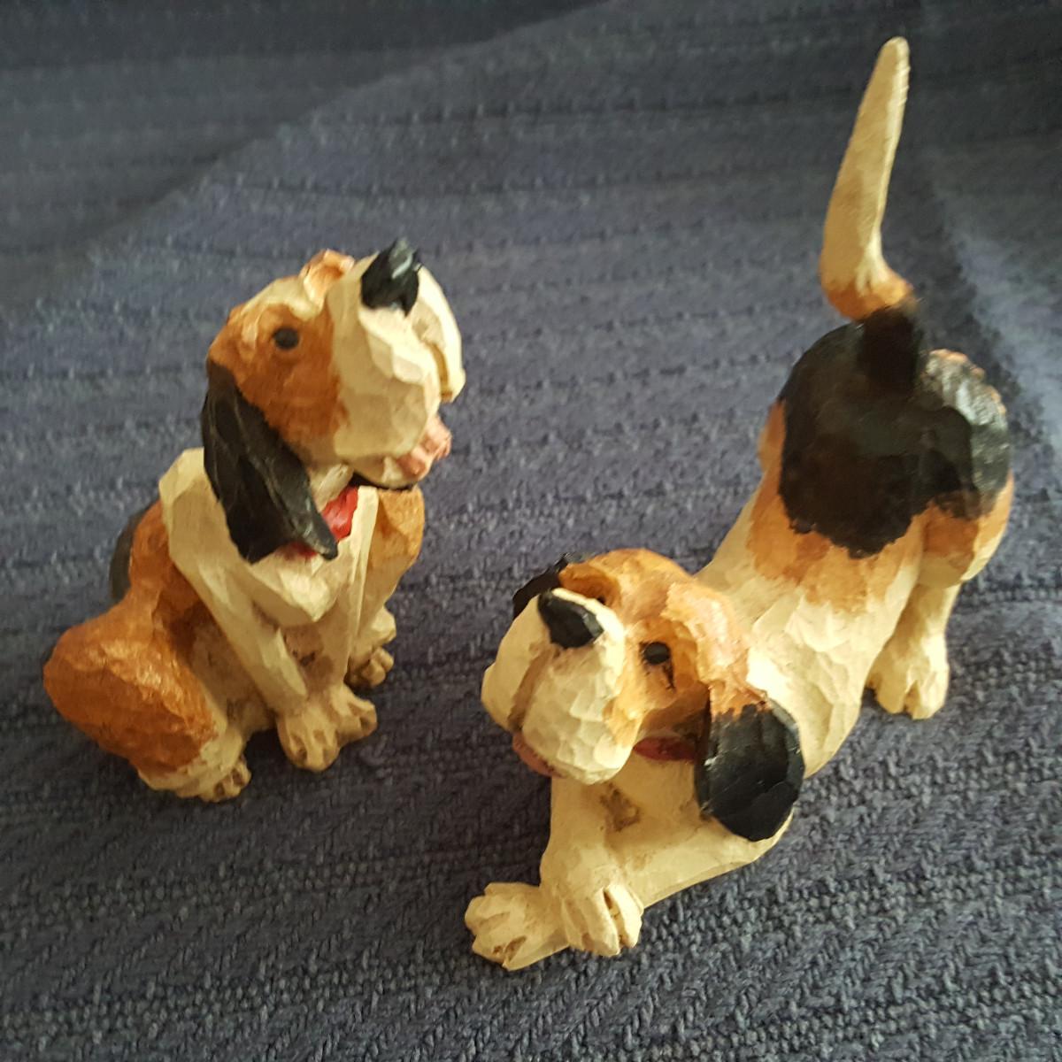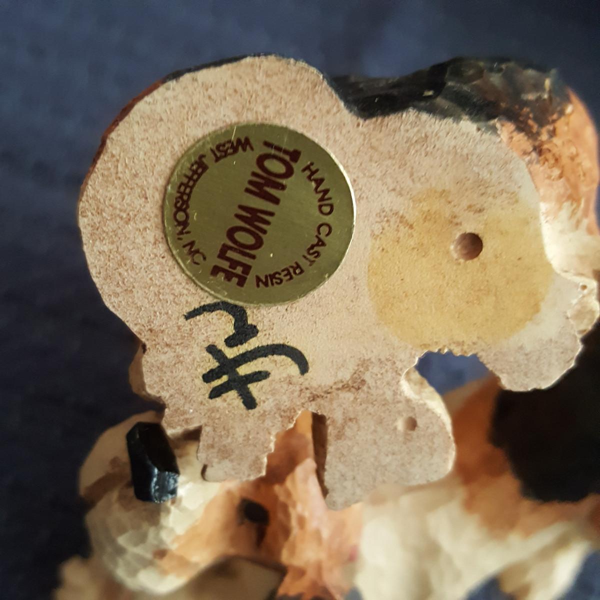 This auction lot is for a pair of Tom Wolfe Carved Dogs. These beautiful dogs are hand-carved by the noted North Carolina artist Tom Wolfe. Mr. Wolfe currently resides in Spruce Pine, NC and teaches classes several times a year at his workshop on Grandfather Mountain, as well as at the John C. Campbell School in Brasstown NC. He has written several books about hand carving - his most recent features dogs much like these. These dog are carved by hand from cast resin. The tail up dog measures about 5-inches long and the sitting dog measures about 5-inches tall. They appear to be in good shape with no visible cracks or chips. Both are signed, one has a sticker - see photos.