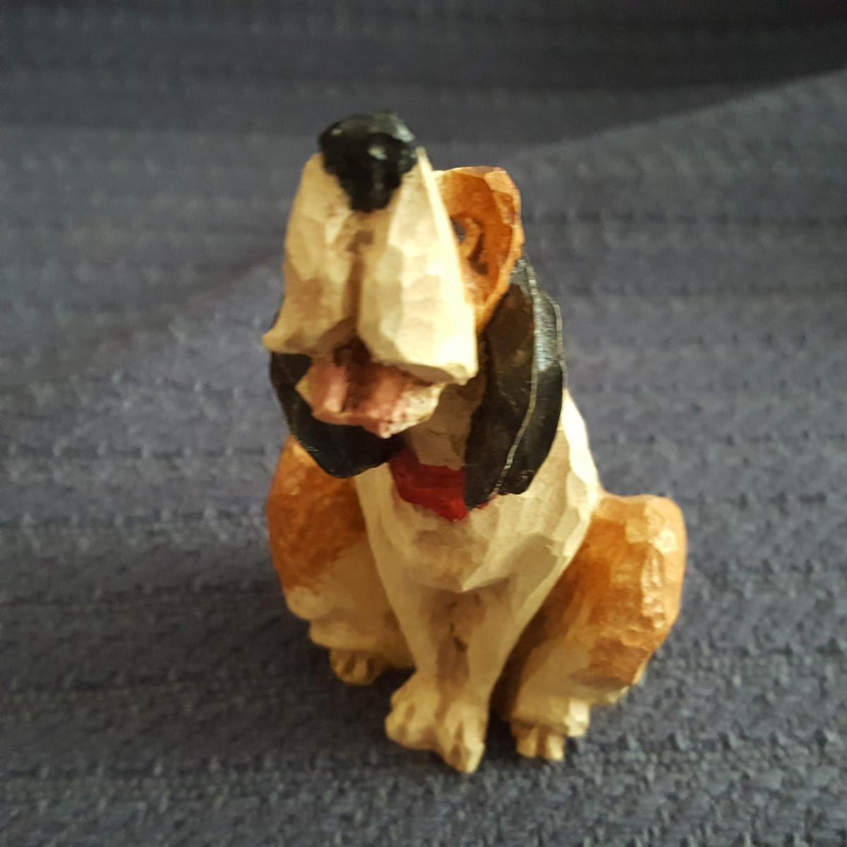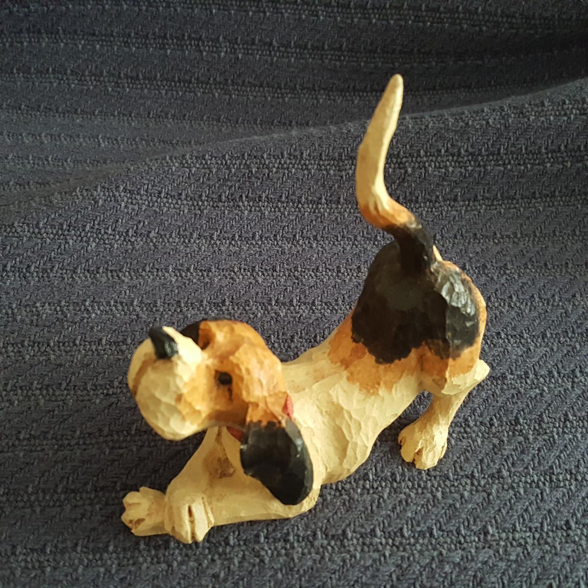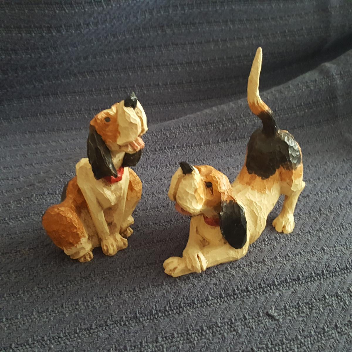 This auction lot is for a pair of Tom Wolfe Carved Dogs. These beautiful dogs are hand-carved by the noted North Carolina artist Tom Wolfe. Mr. Wolfe currently resides in Spruce Pine, NC and teaches classes several times a year at his workshop on Grandfather Mountain, as well as at the John C. Campbell School in Brasstown NC. He has written several books about hand carving - his most recent features dogs much like these. These dog are carved by hand from cast resin. The tail up dog measures about 5-inches long and the sitting dog measures about 5-inches tall. They appear to be in good shape with no visible cracks or chips. Both are signed, one has a sticker - see photos.