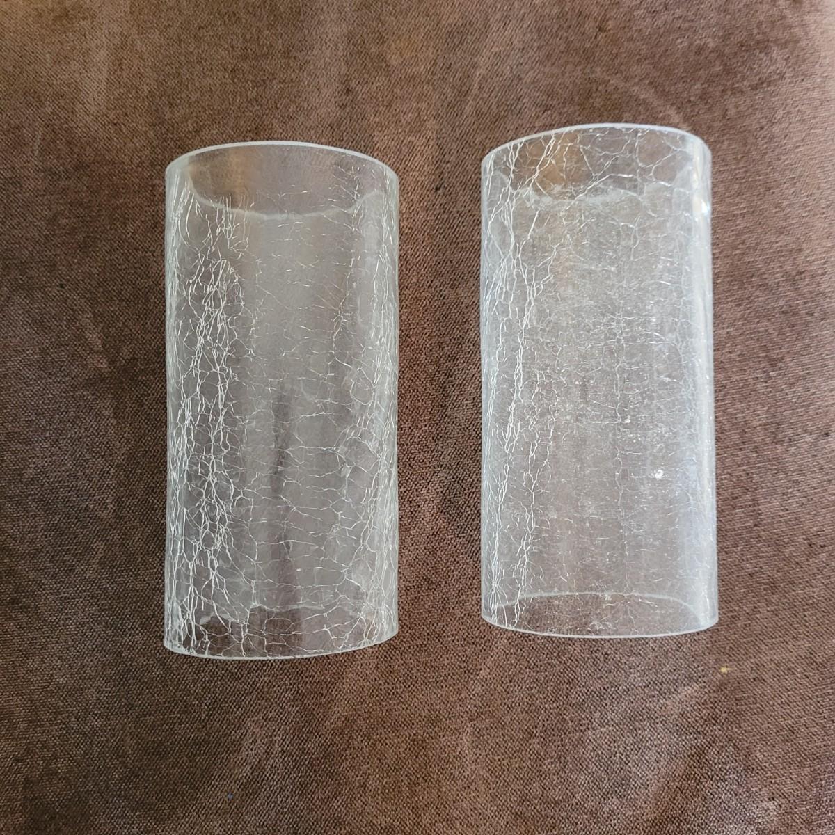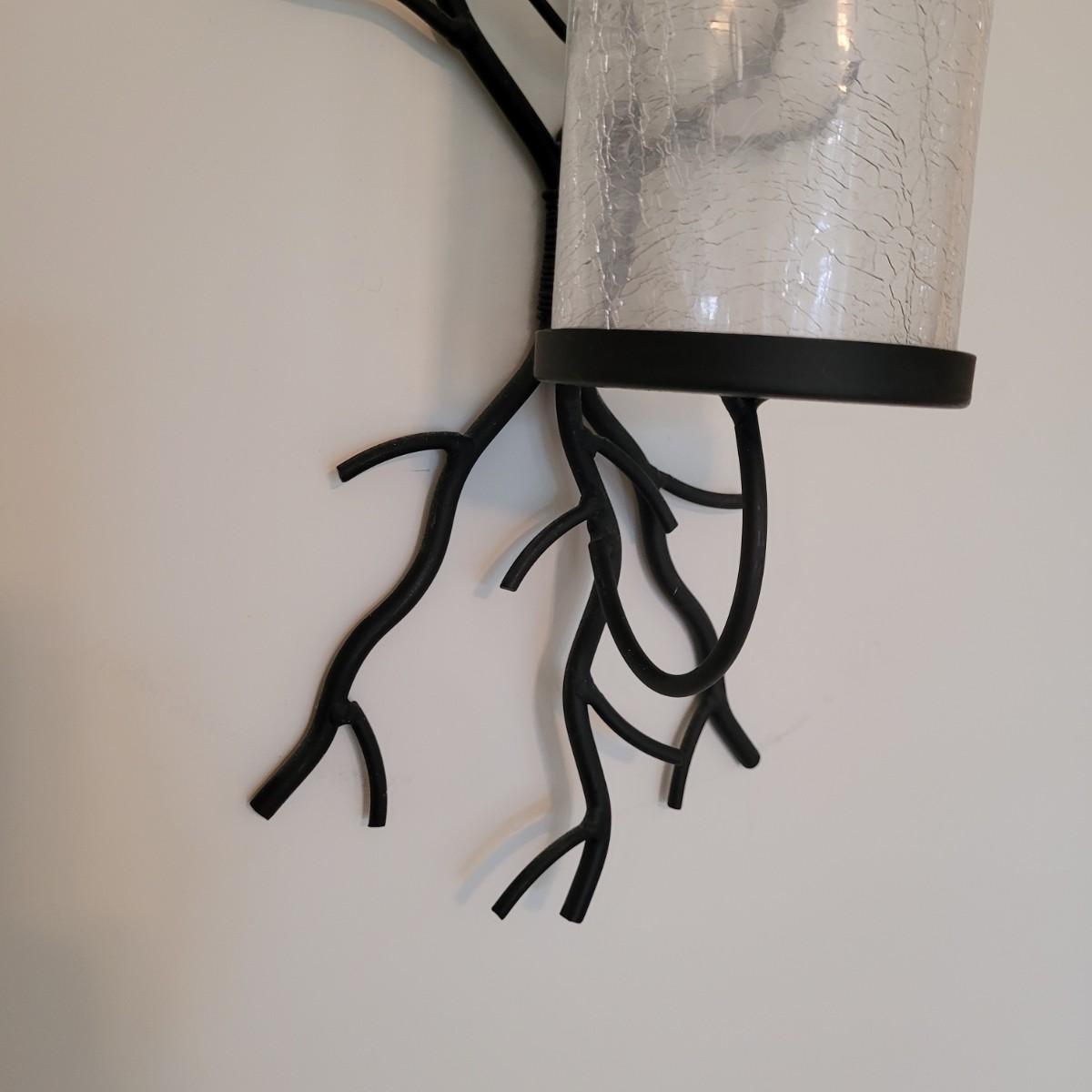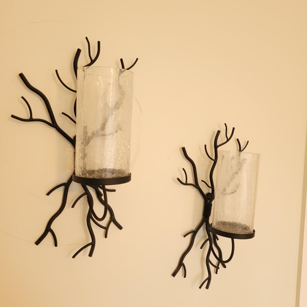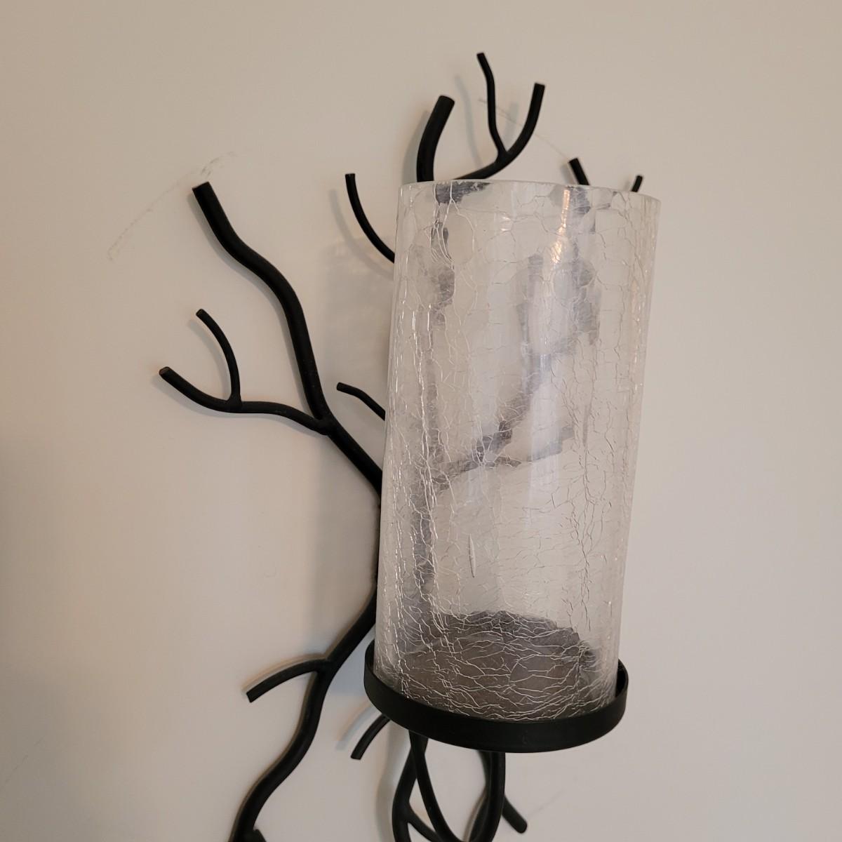 Pair of metal tree branch styled wall sconces with crackled glass cylinder shades. Sconces each measure approximately 14"H, cylinders 3"DIA x6"H. Shipping available.