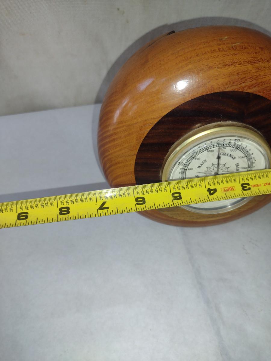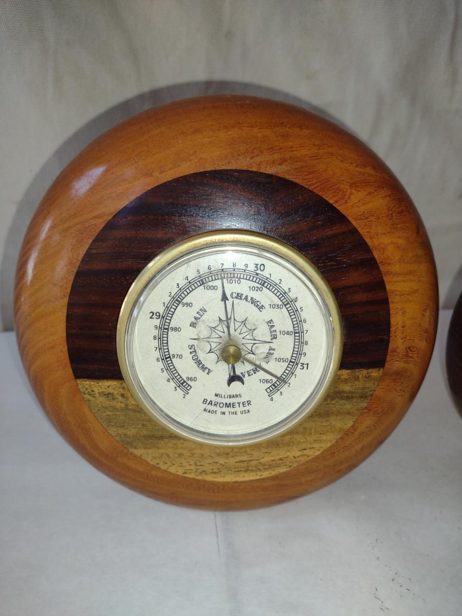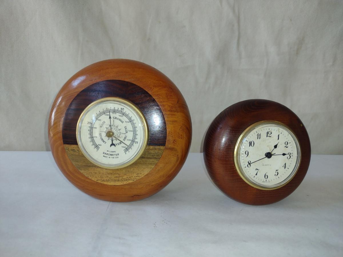 Pair of Turned Wooden Pieces by Bobby Phillips- (#91). Clock made of osage orange and barometer made of locust and cocobollo. Both items are in used condition and have signs of being stored in humidity and wear to finish.