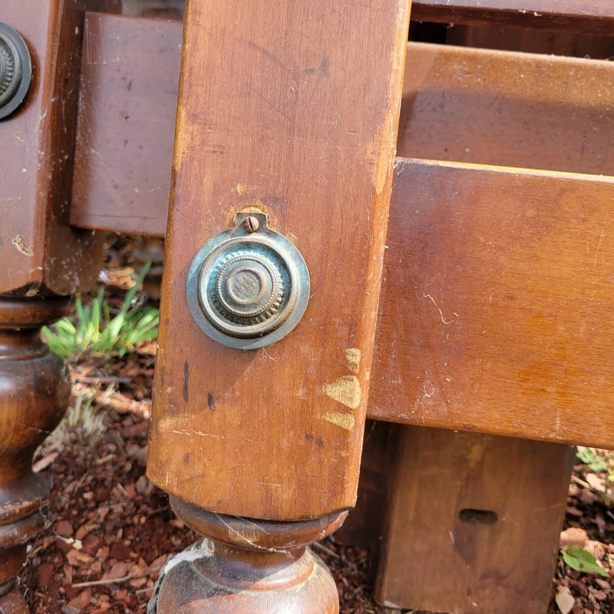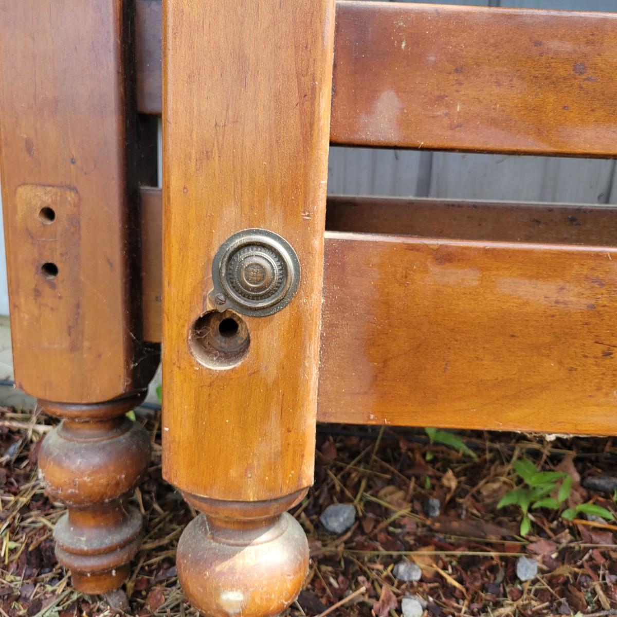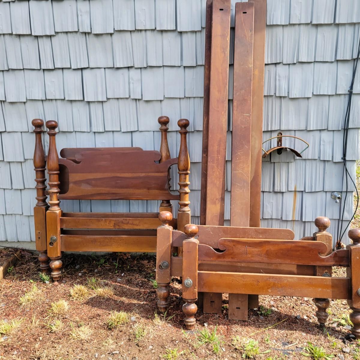 2 vintage, solid wood Bed Frames with metal hardware covers and casters. All the mounting bolts are not present and is also missing 3 casters. Approximately 40" x 78" x 46"