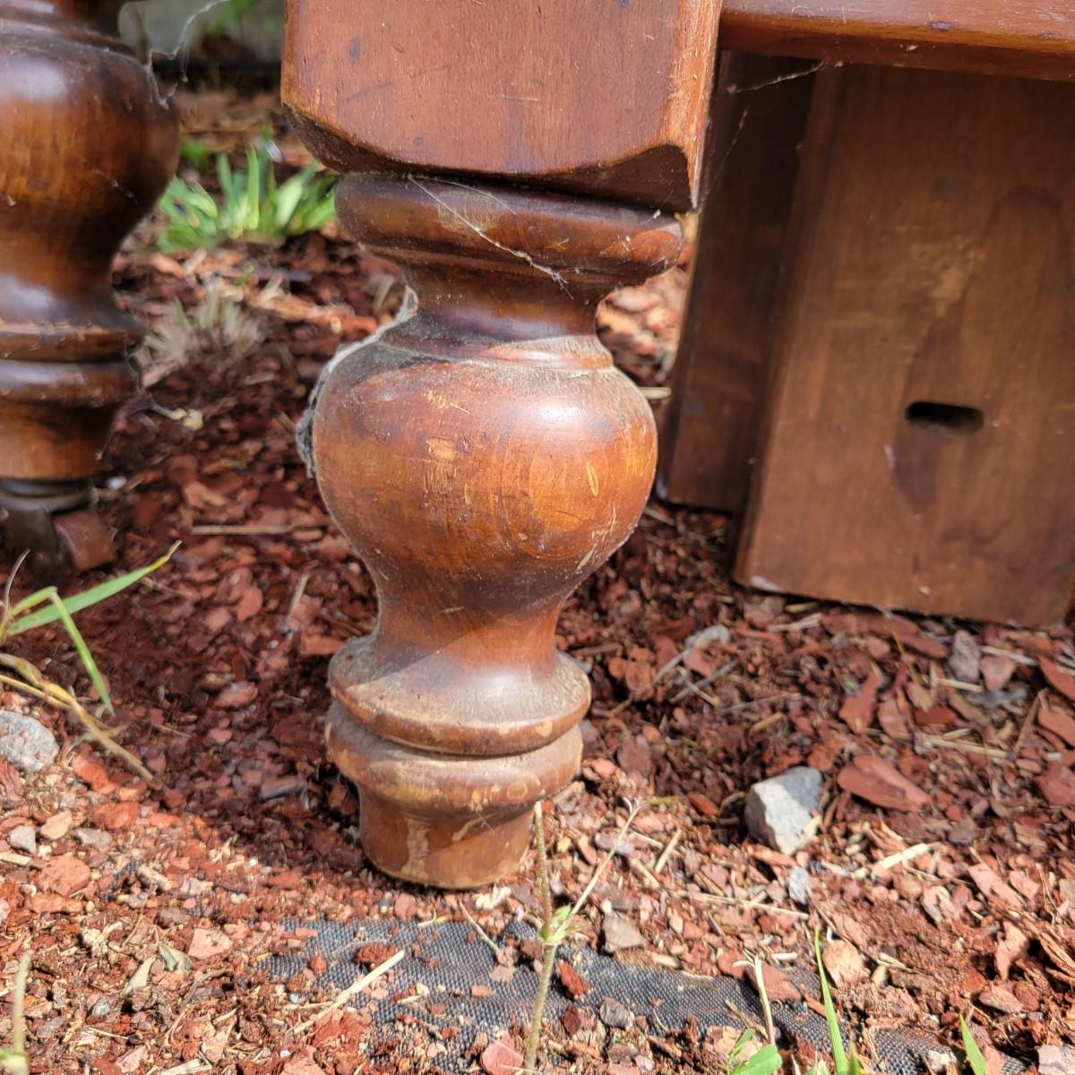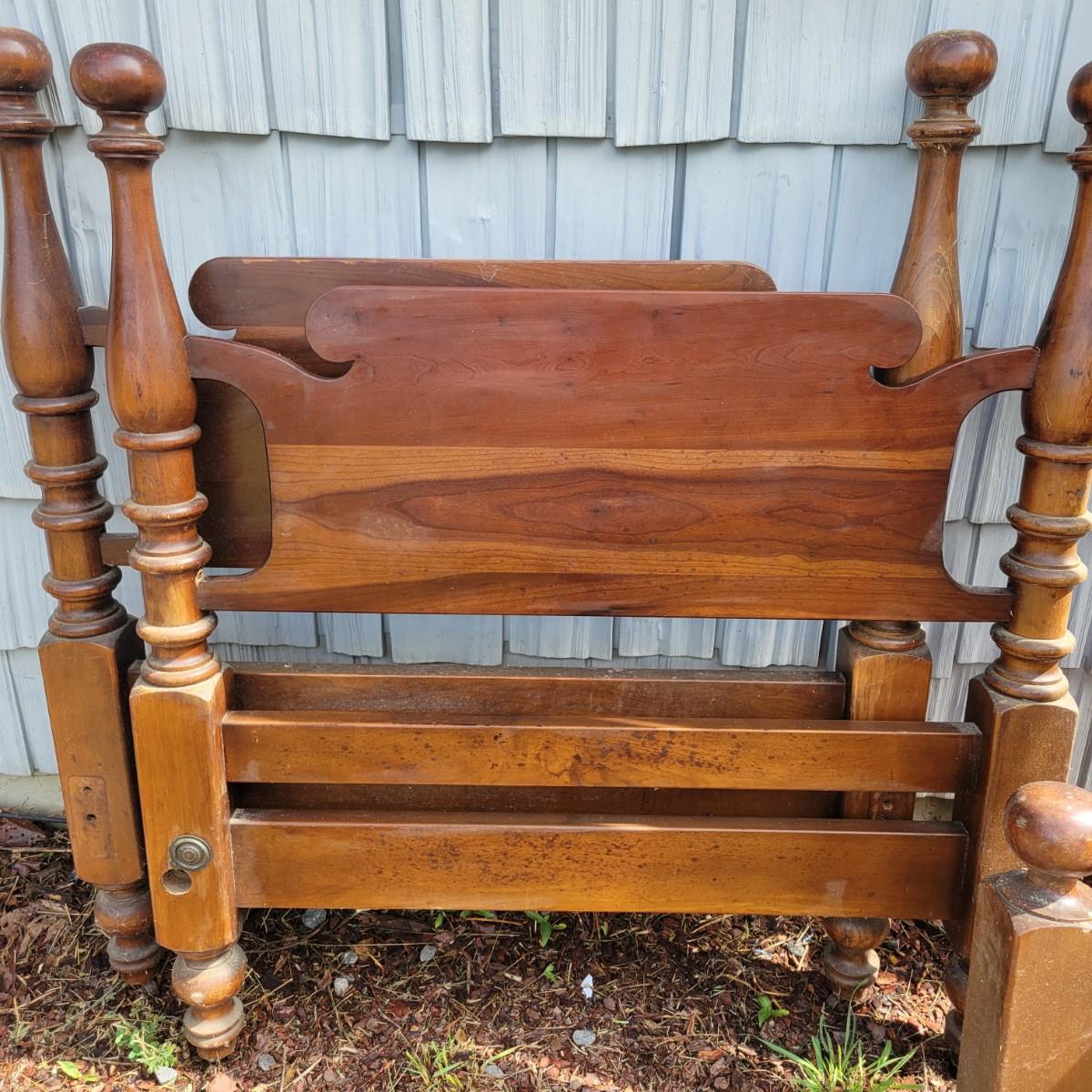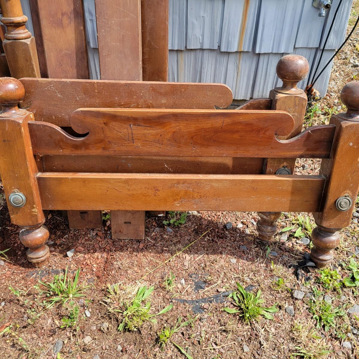 2 vintage, solid wood Bed Frames with metal hardware covers and casters. All the mounting bolts are not present and is also missing 3 casters. Approximately 40" x 78" x 46"