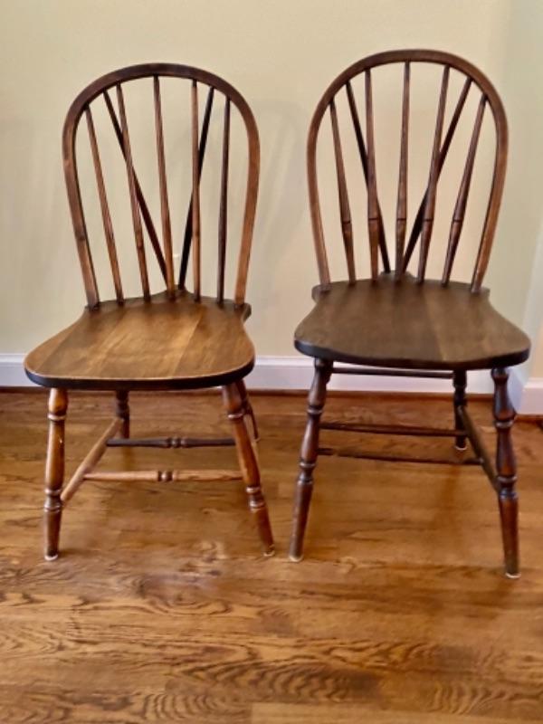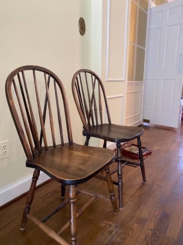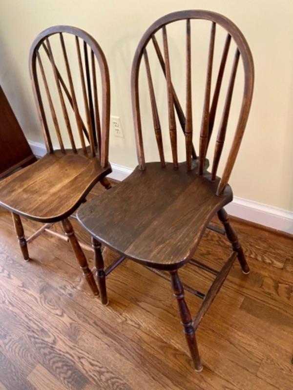 These two great old chairs are perfect by the fireplace, classic armless Windsor stylings, nice formed seats to cradle you perfectly. Not matching - one a bit smaller than other.