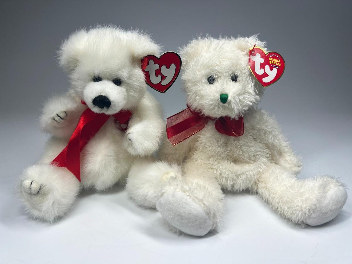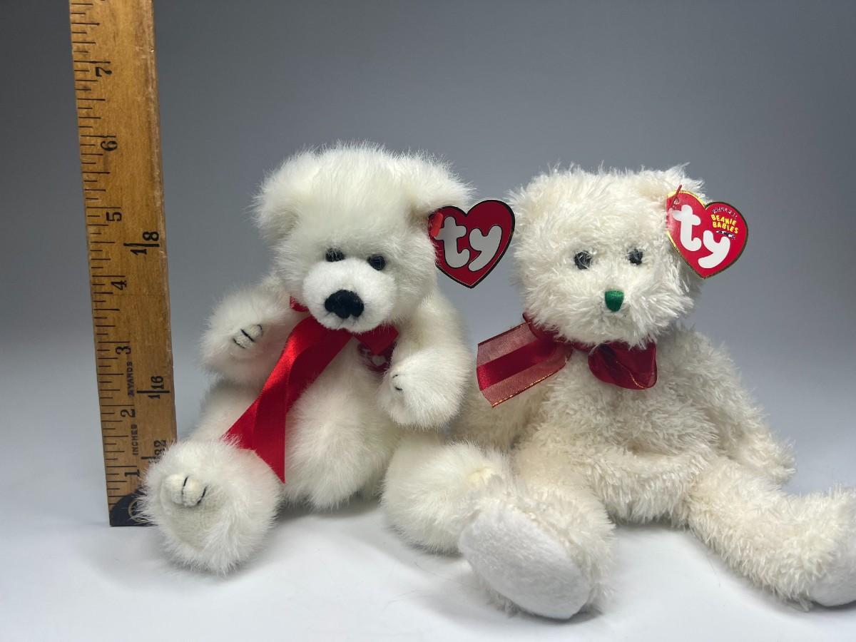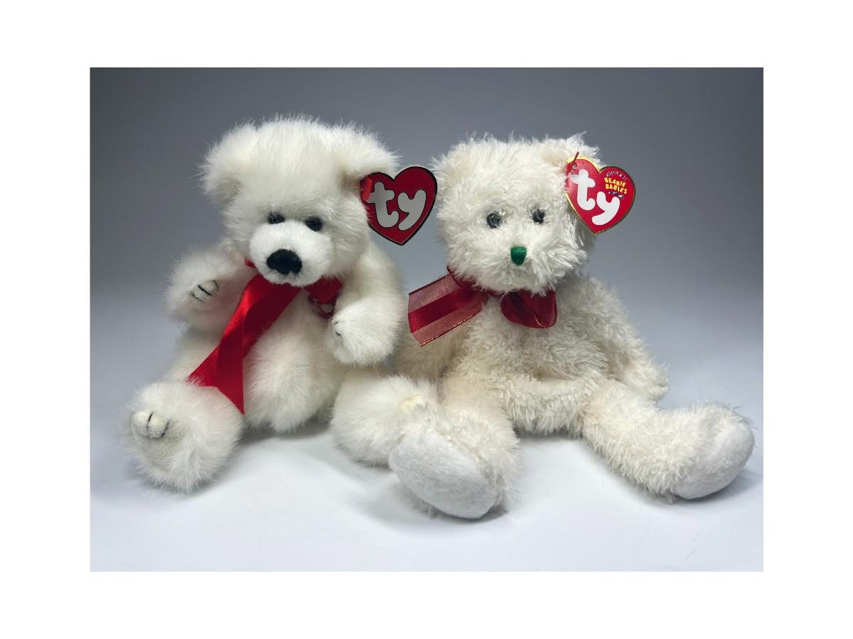 Pair of Ty Beanie Baby Plush White Bears with Red Ribbons