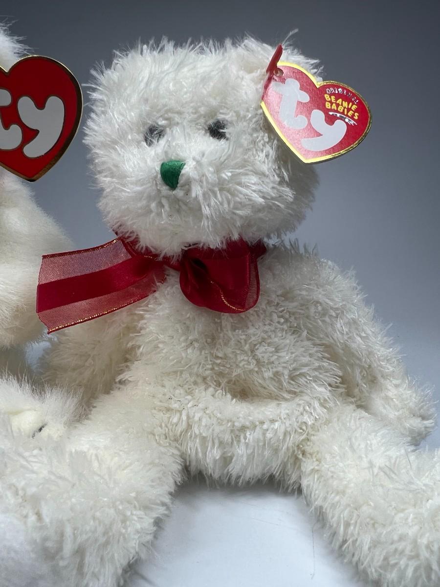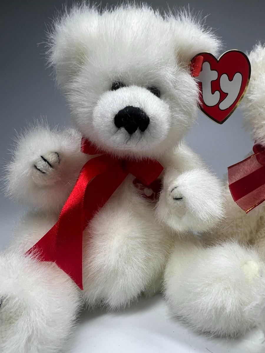 Pair of Ty Beanie Baby Plush White Bears with Red Ribbons. In good condition. Hang tags attached.