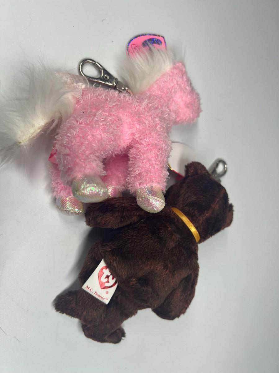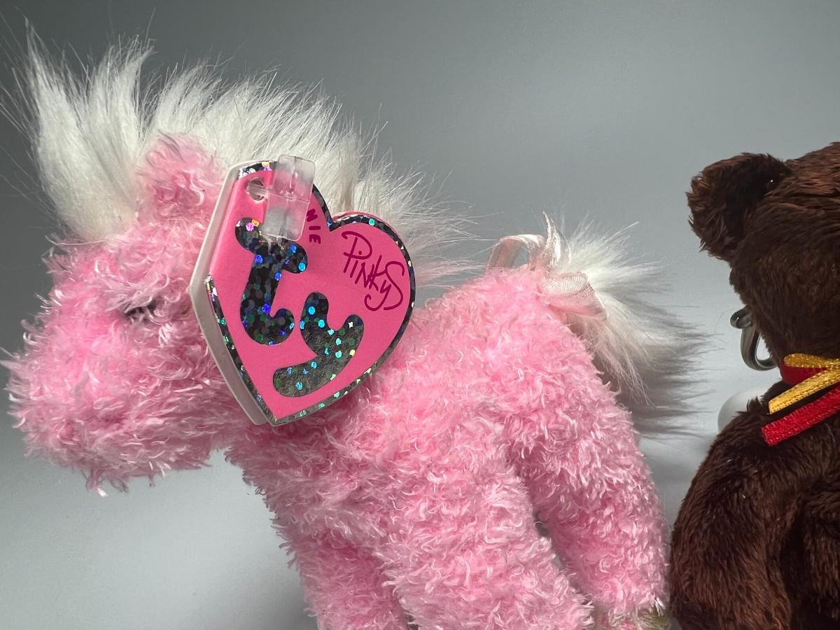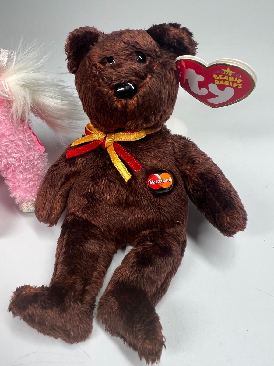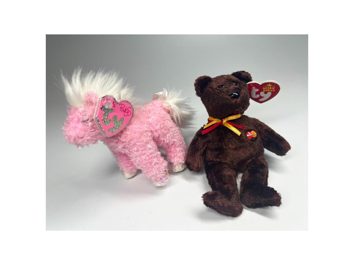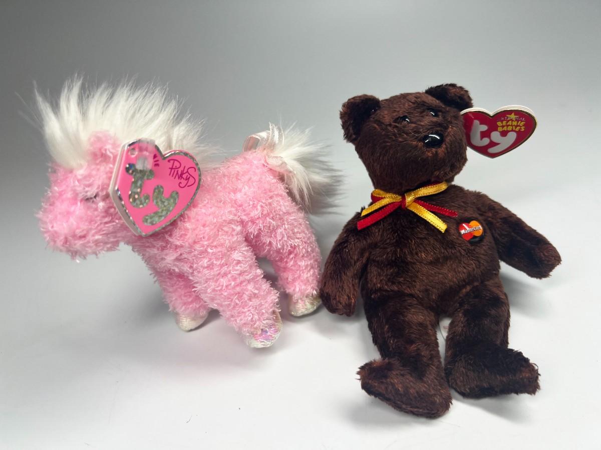 Pair of Ty Beanie Baby Plush Stuffed Animals Pink Fuzzy Horse Mastercard Bear