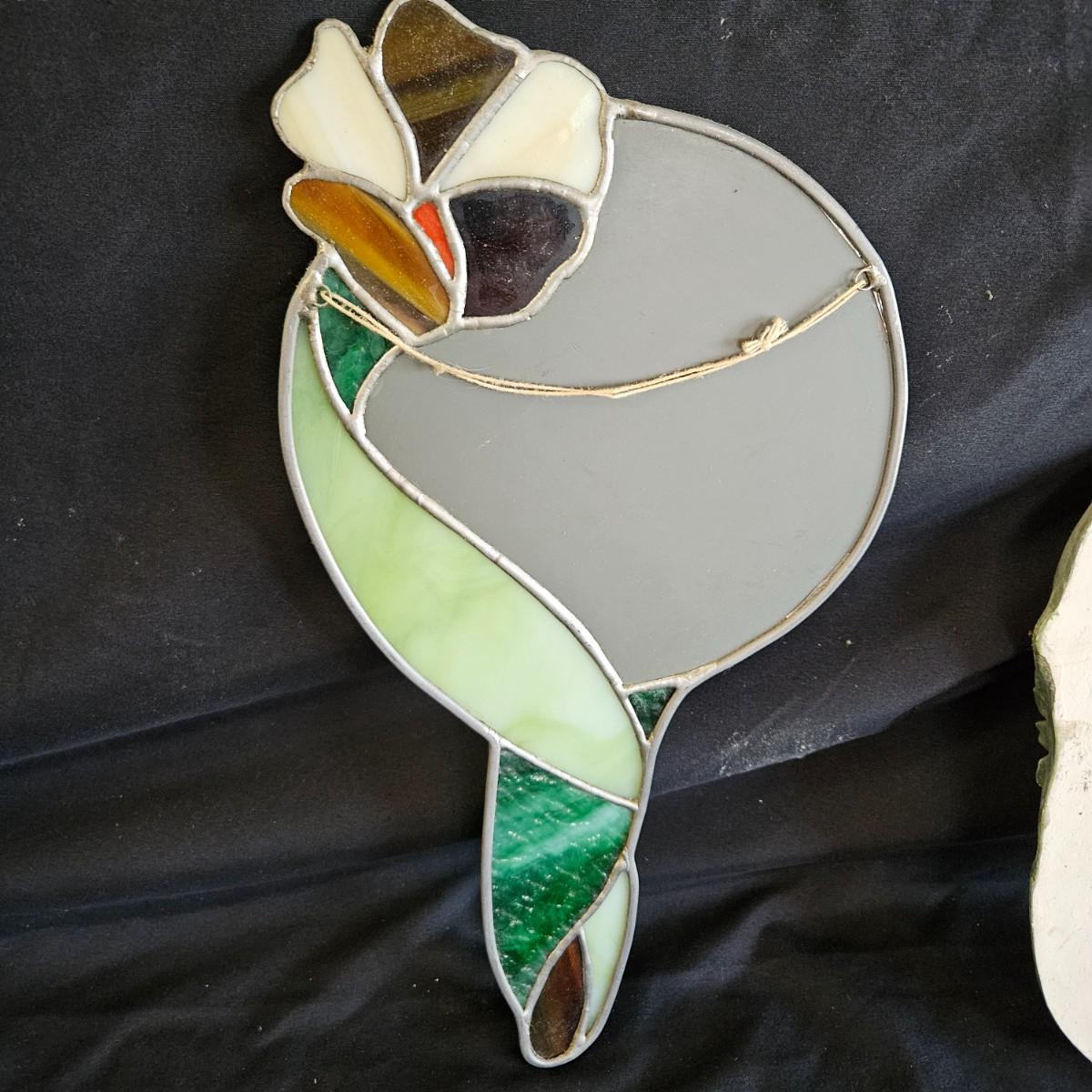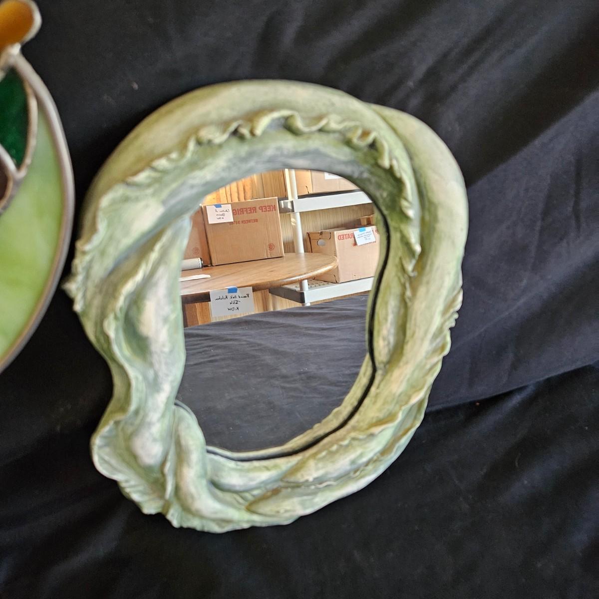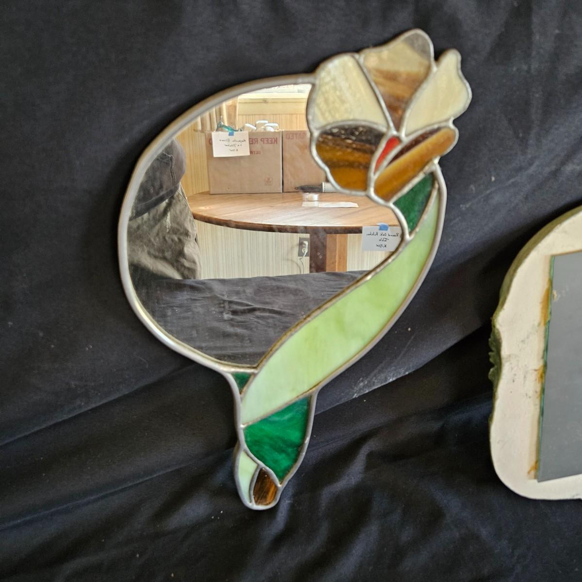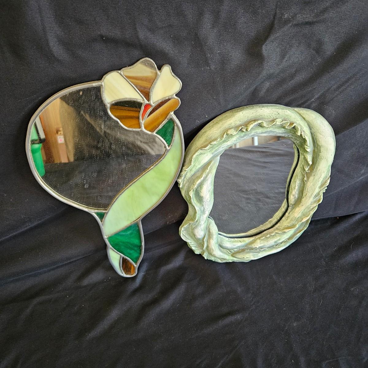 A pair of small, unique mirrors. One is made from a plaster cast with a flowing design that is painted green. The other mirror features stained glass and measures approximately 8" x 14"H. Shipping available