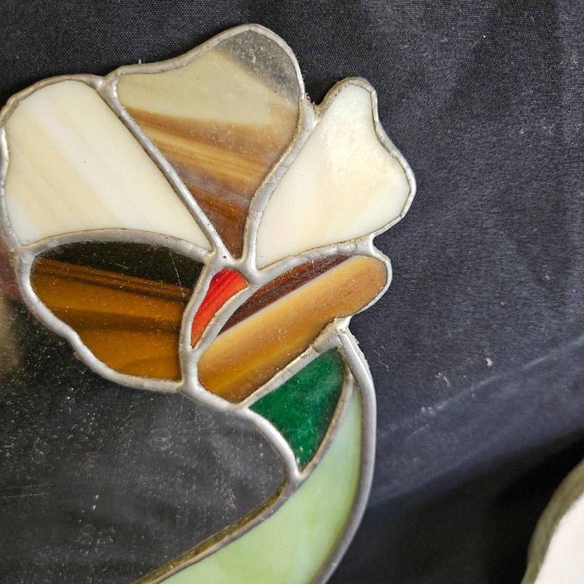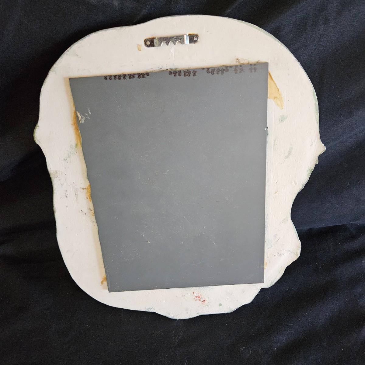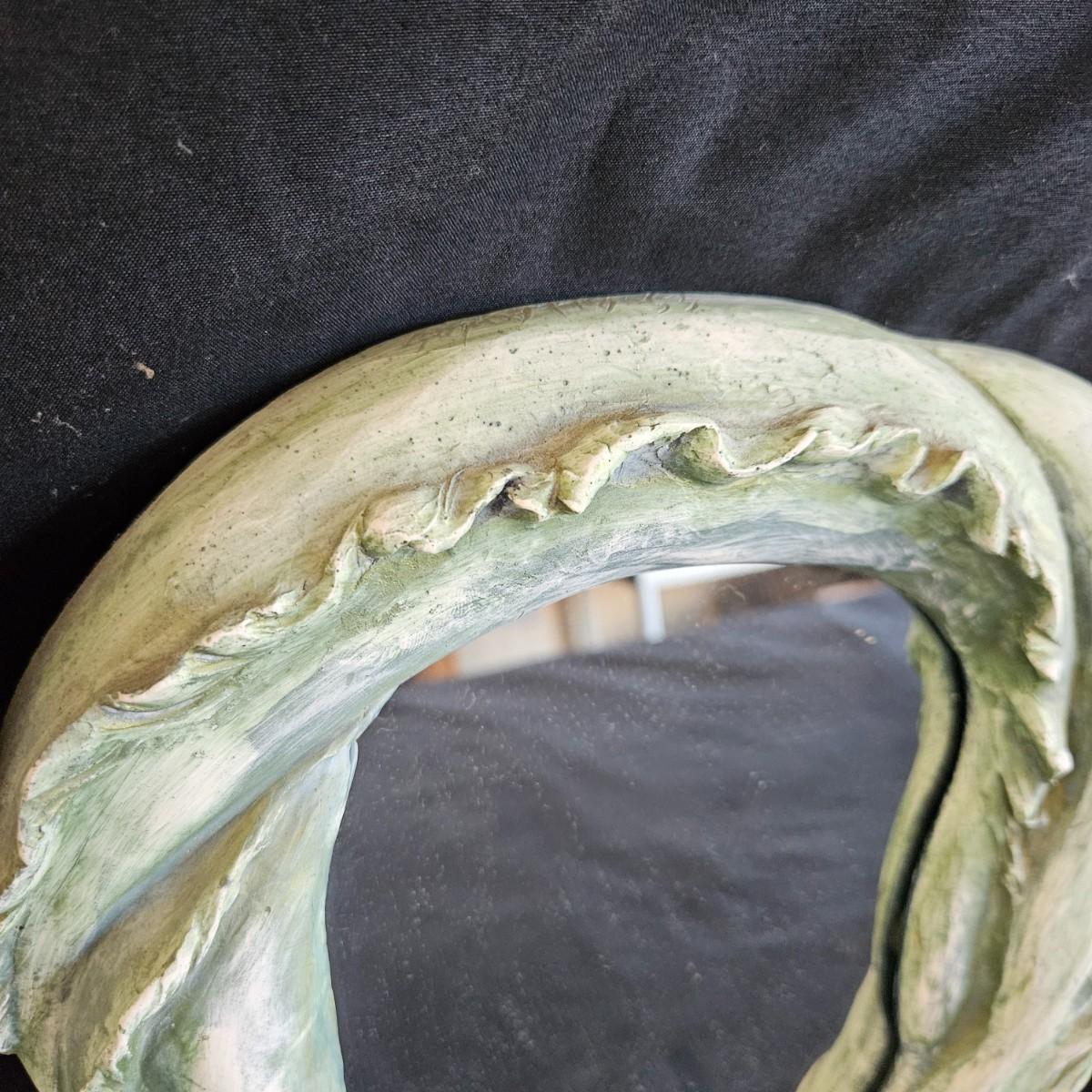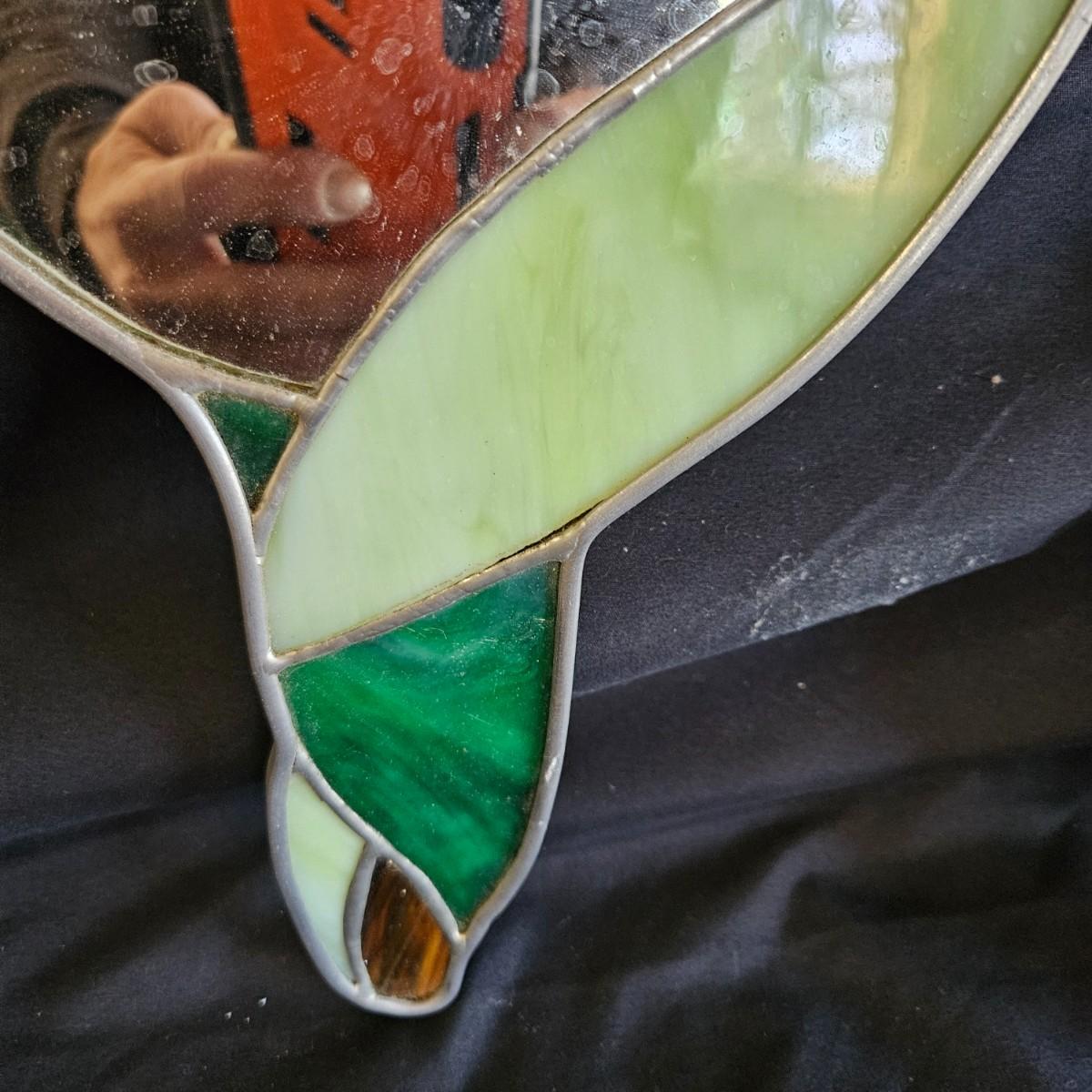A pair of small, unique mirrors. One is made from a plaster cast with a flowing design that is painted green. The other mirror features stained glass and measures approximately 8" x 14"H. Shipping available