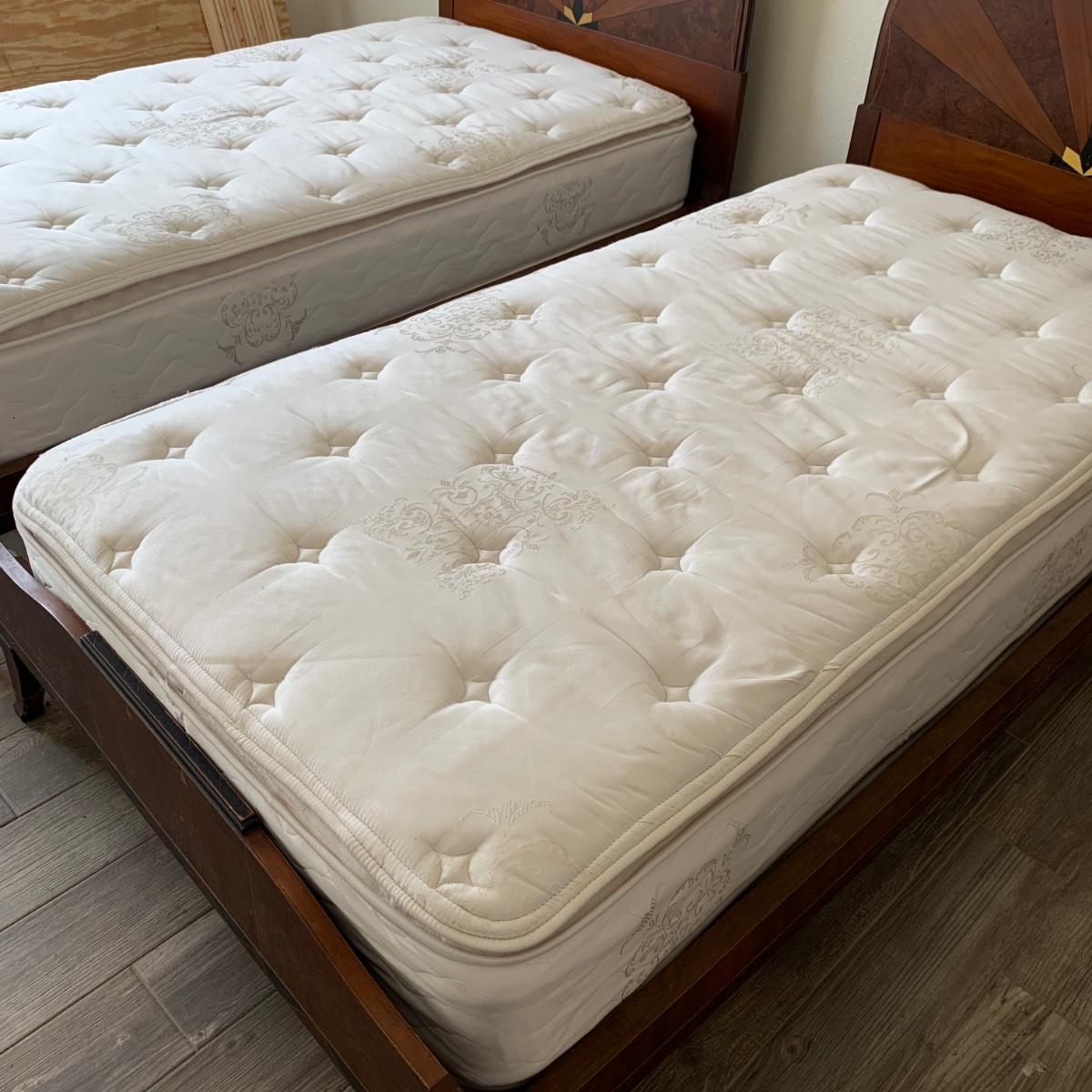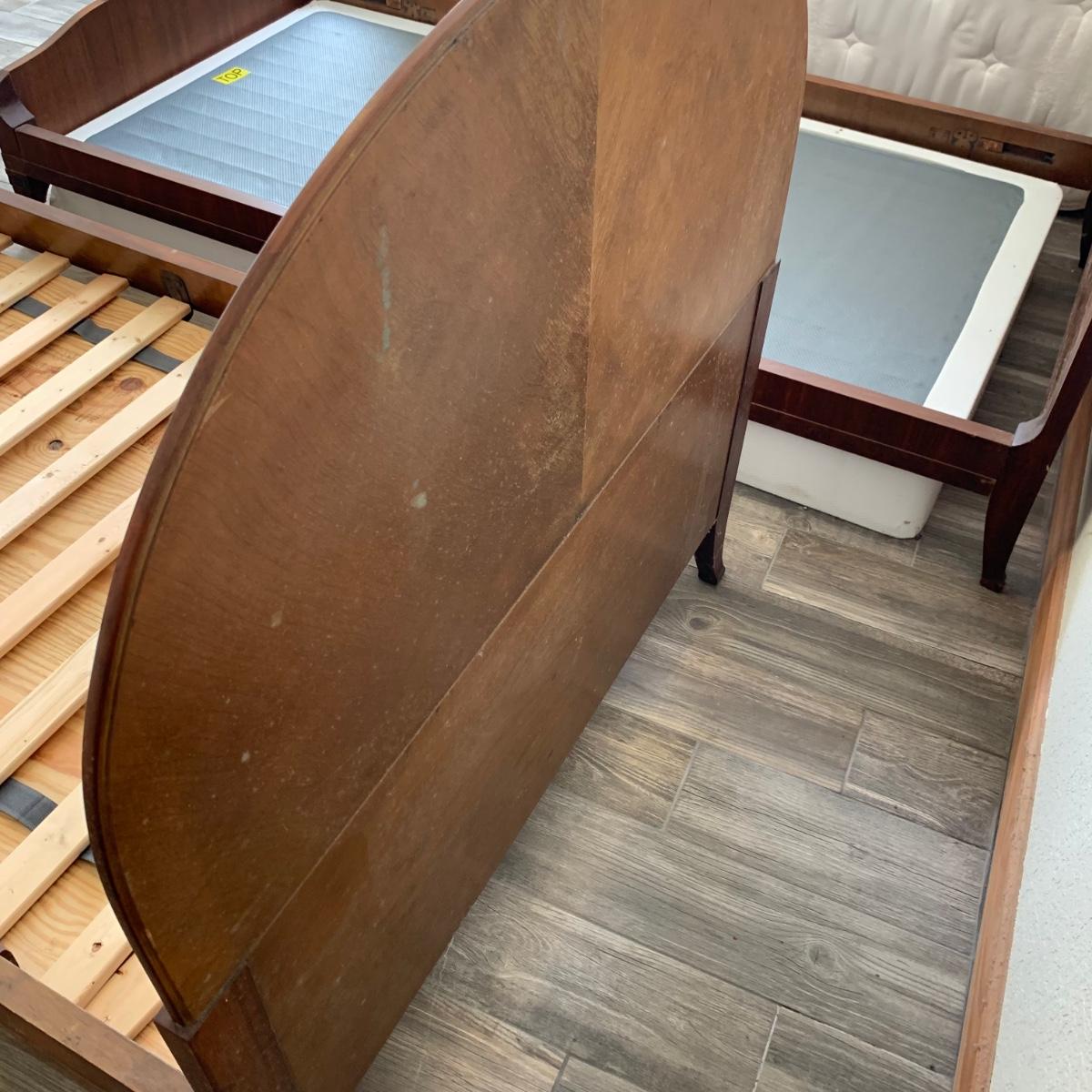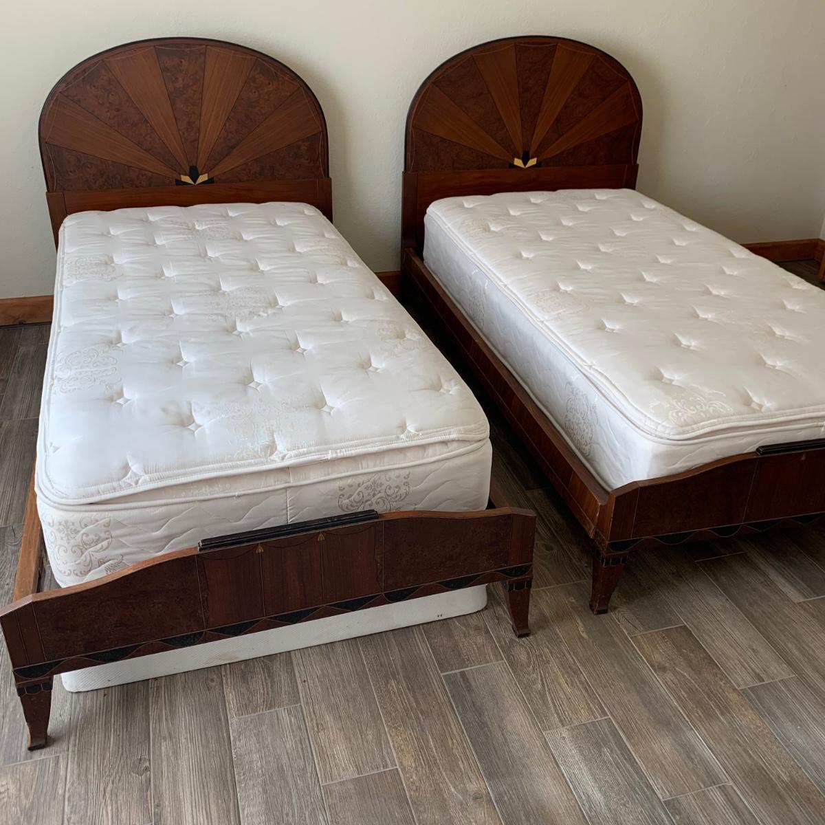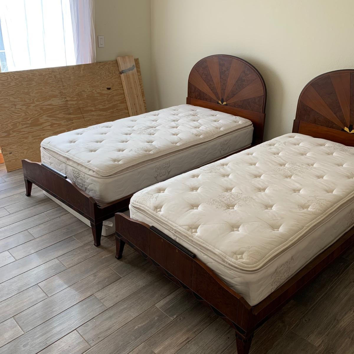 A set of two matching twin size bed frames. Beds are made of wood and have a unique painted design with the appearance of inlaid wood. Each frame measures 41.25” x 80.5”. The height of the headboards is 43”. The bed frames are mostly in good condition. They’re very sturdy. A few chips and blemishes have been noted in the pictures. They have some mildew on them that is easily cleanable. Each bed comes with a pillowtop-like mattress that the winning bidder may have if they desire. One bed has supported the mattress with a box spring and the other with a layer of plywood. The winning bidder may decide if they’d like the box spring or the plywood or both. There is another piece of plywood and hardware for the other bed.