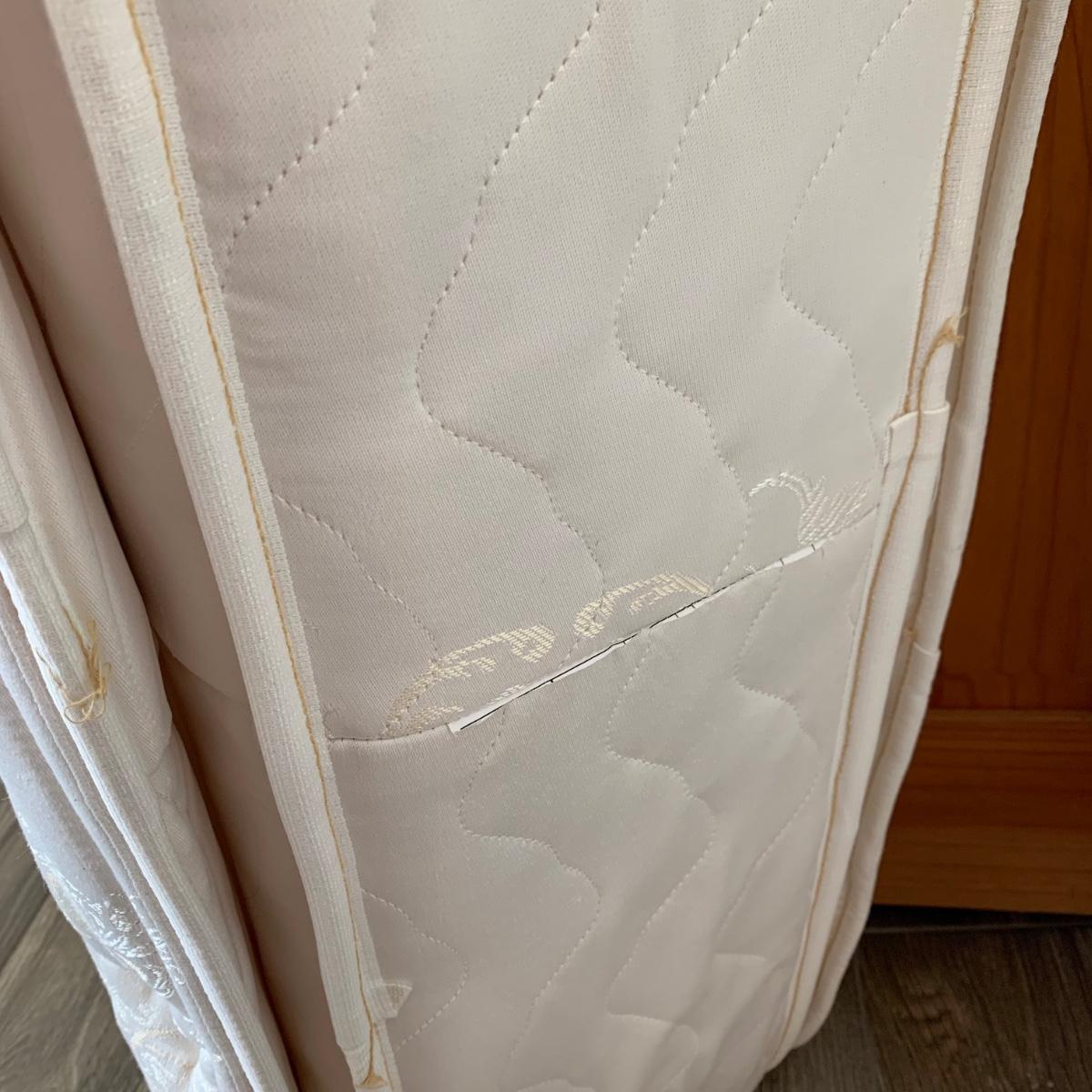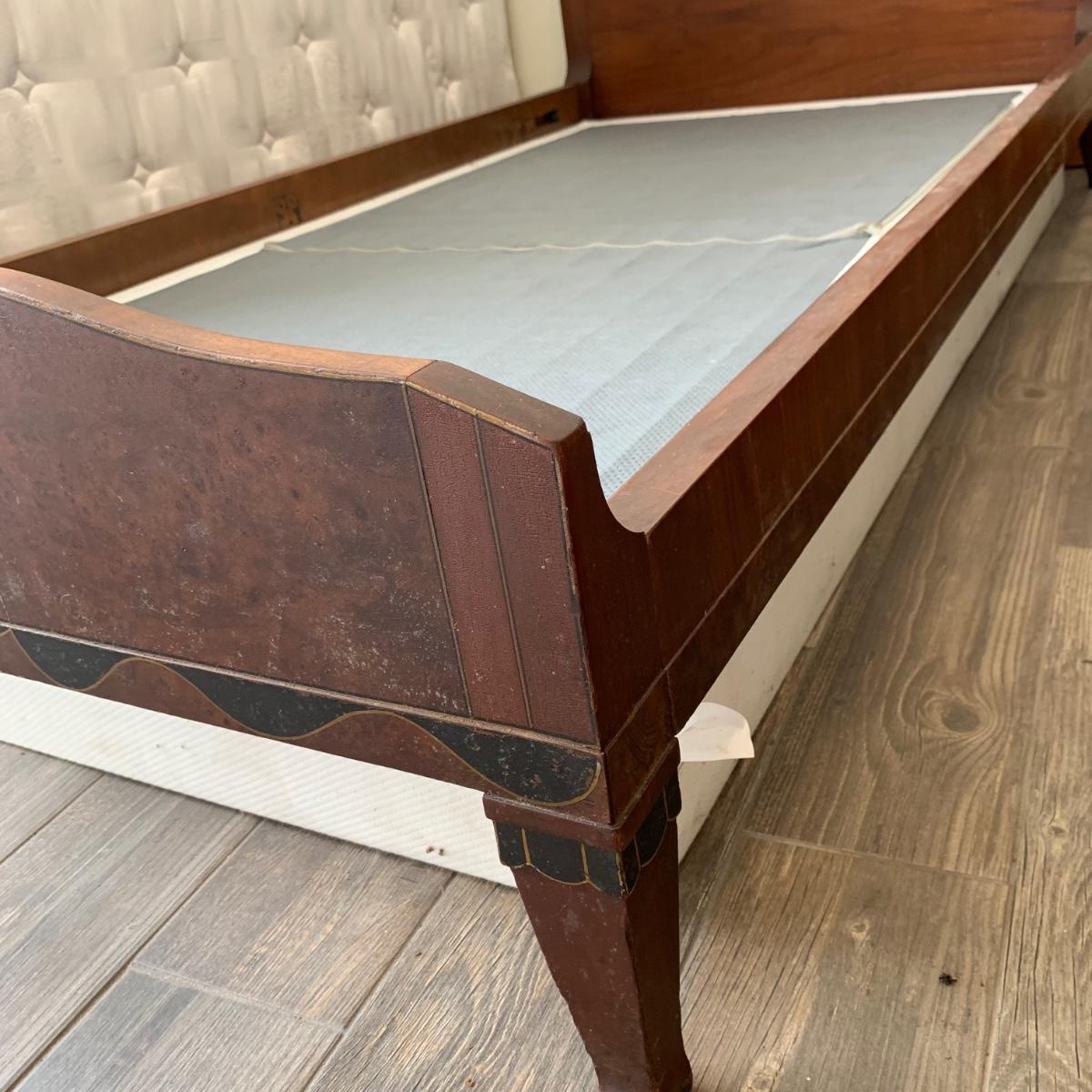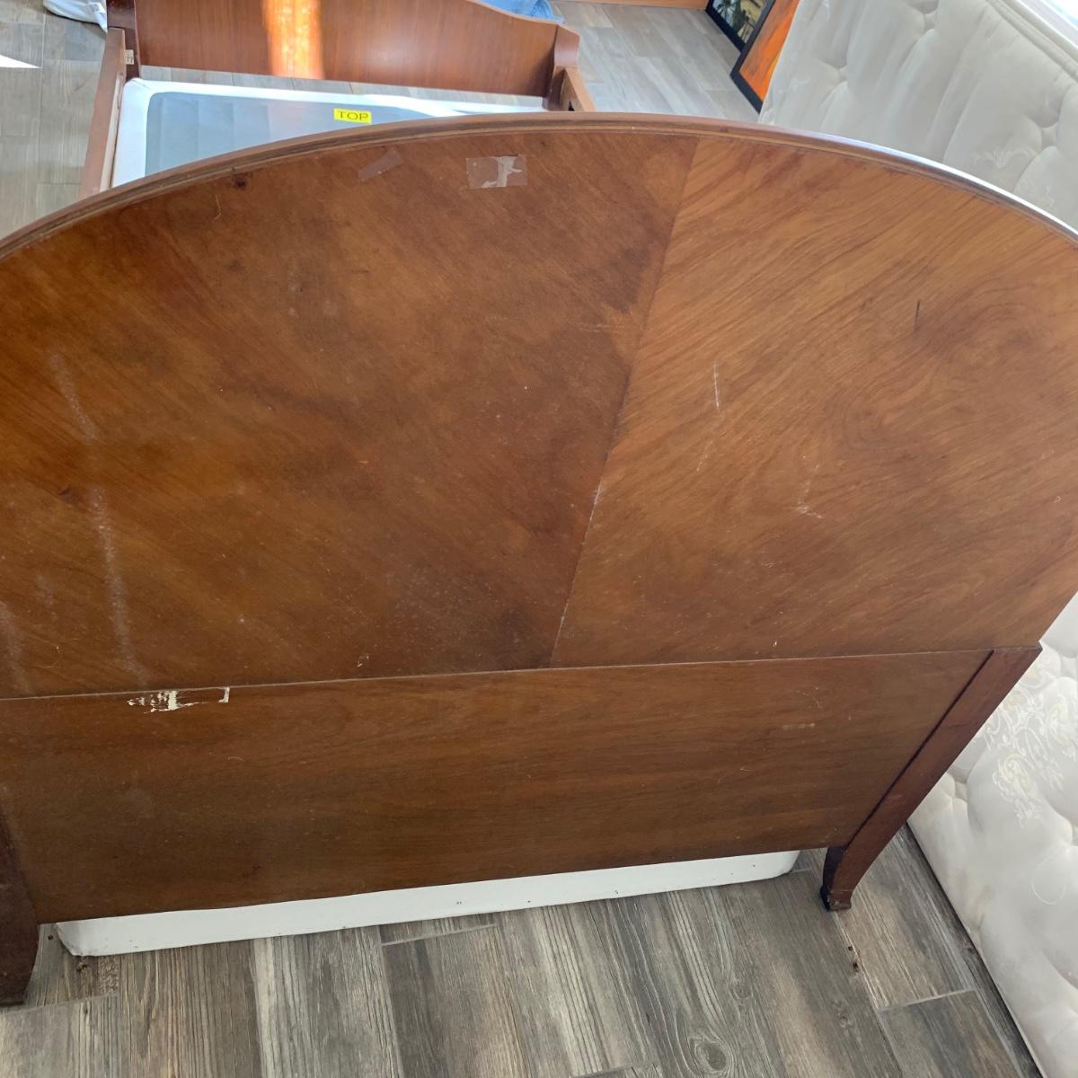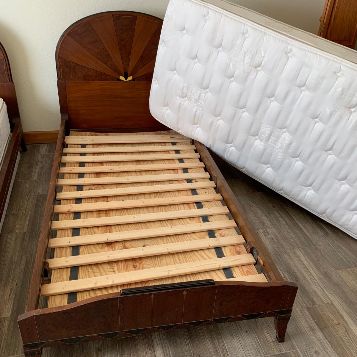 A set of two matching twin size bed frames. Beds are made of wood and have a unique painted design with the appearance of inlaid wood. Each frame measures 41.25” x 80.5”. The height of the headboards is 43”. The bed frames are mostly in good condition. They’re very sturdy. A few chips and blemishes have been noted in the pictures. They have some mildew on them that is easily cleanable. Each bed comes with a pillowtop-like mattress that the winning bidder may have if they desire. One bed has supported the mattress with a box spring and the other with a layer of plywood. The winning bidder may decide if they’d like the box spring or the plywood or both. There is another piece of plywood and hardware for the other bed.