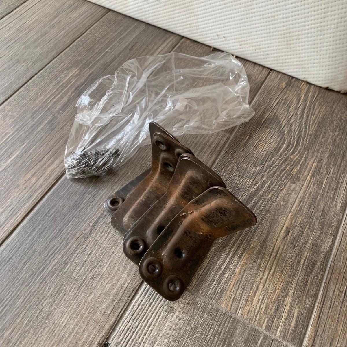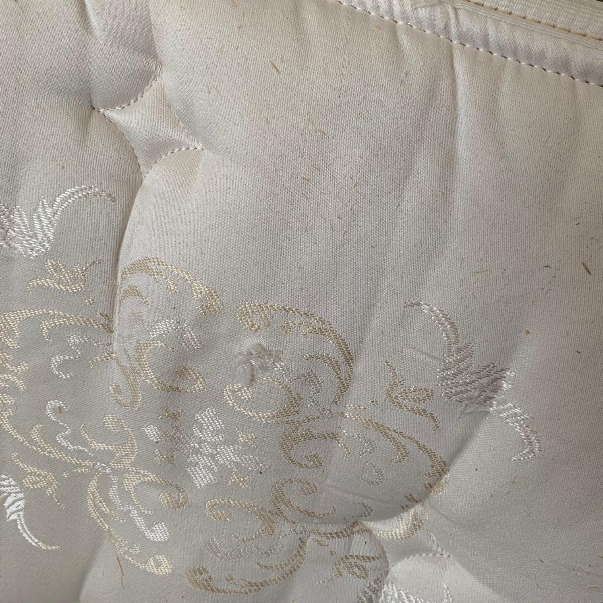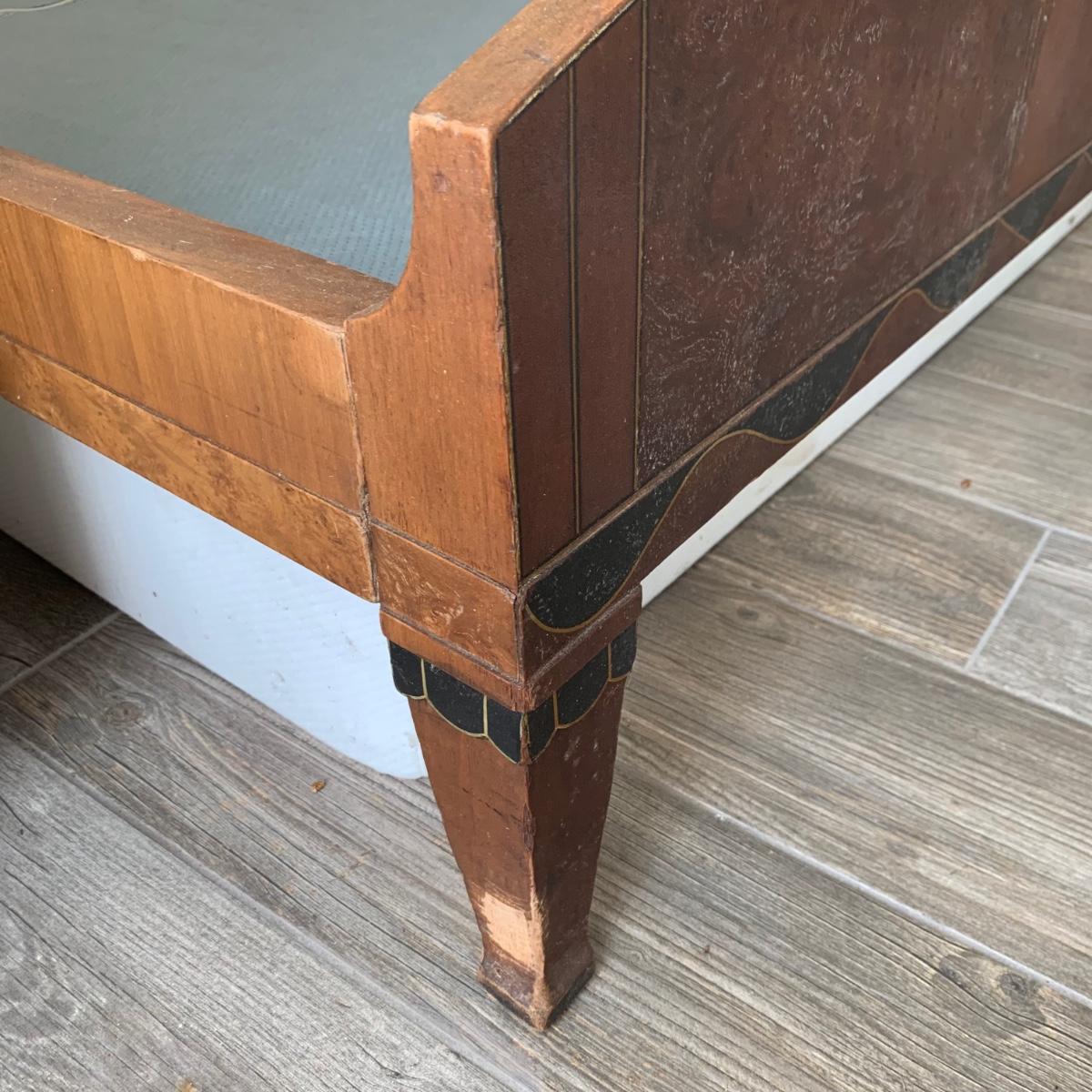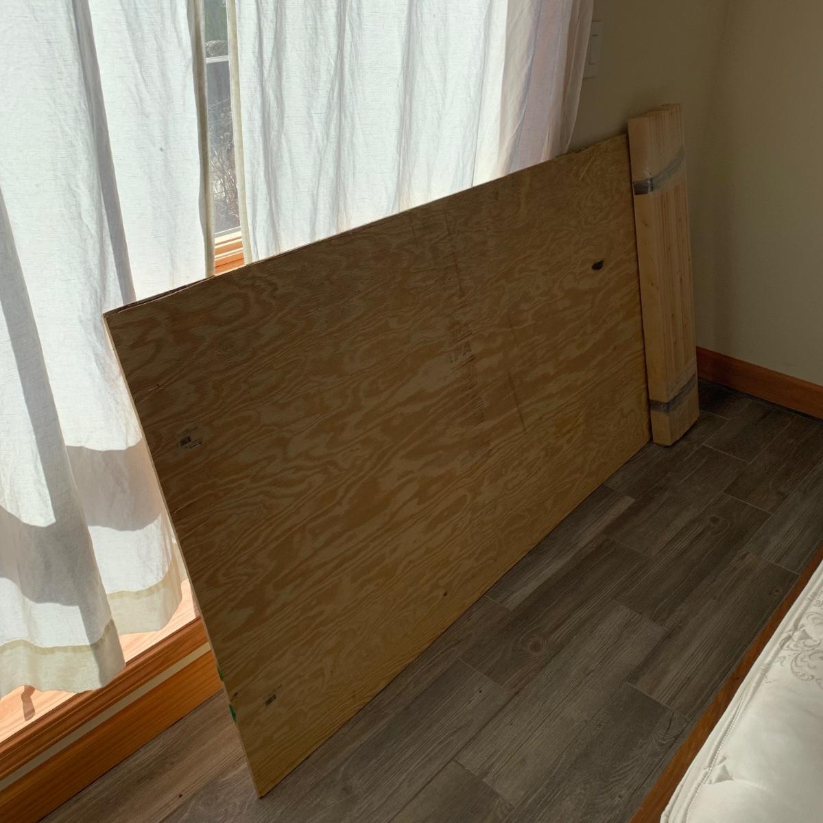A set of two matching twin size bed frames. Beds are made of wood and have a unique painted design with the appearance of inlaid wood. Each frame measures 41.25” x 80.5”. The height of the headboards is 43”. The bed frames are mostly in good condition. They’re very sturdy. A few chips and blemishes have been noted in the pictures. They have some mildew on them that is easily cleanable. Each bed comes with a pillowtop-like mattress that the winning bidder may have if they desire. One bed has supported the mattress with a box spring and the other with a layer of plywood. The winning bidder may decide if they’d like the box spring or the plywood or both. There is another piece of plywood and hardware for the other bed.