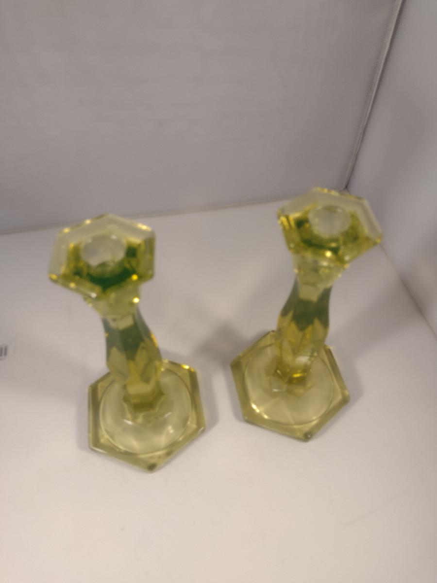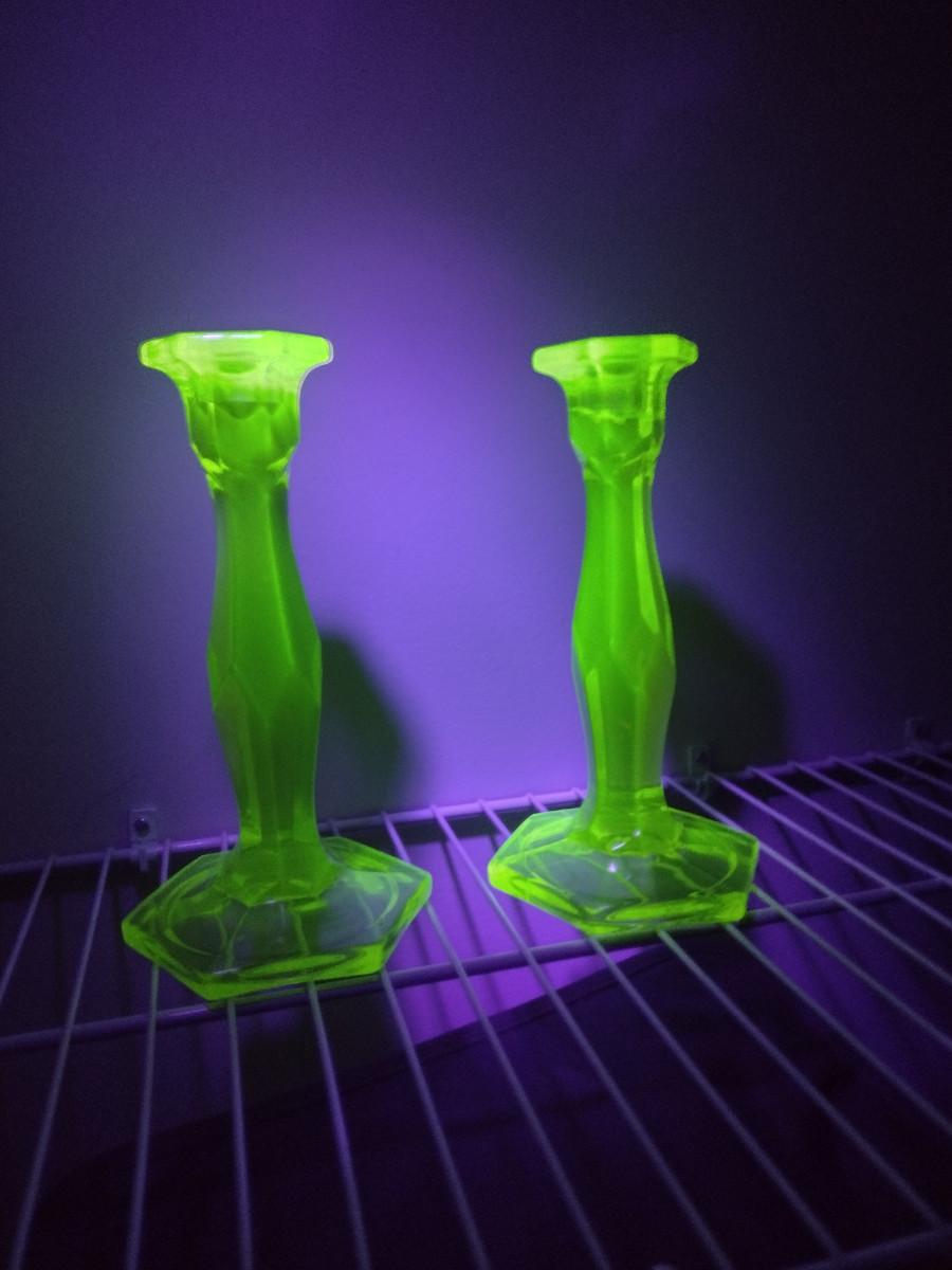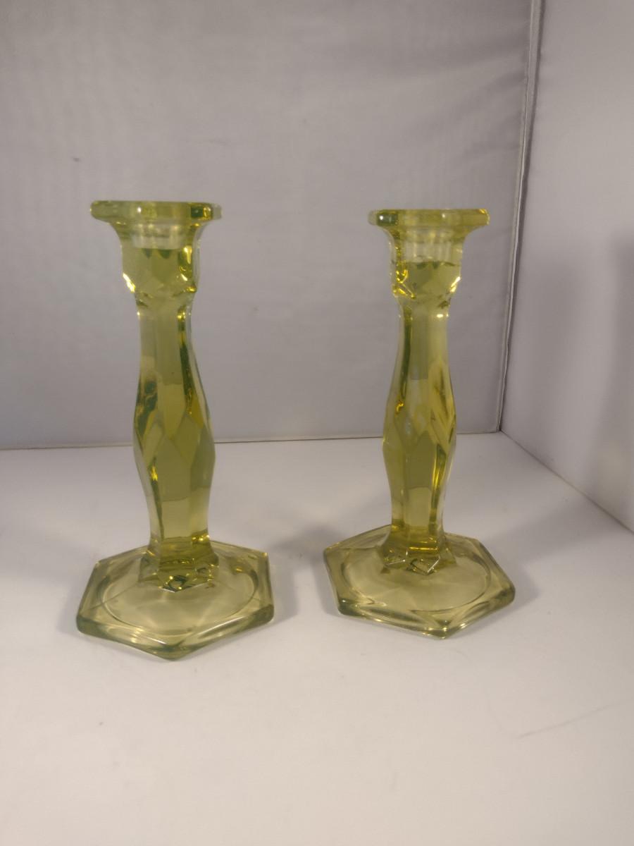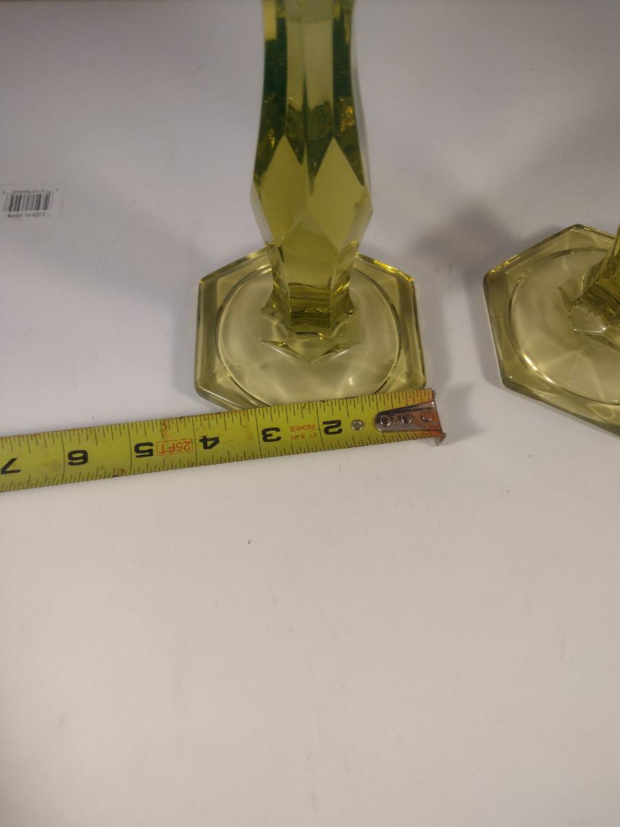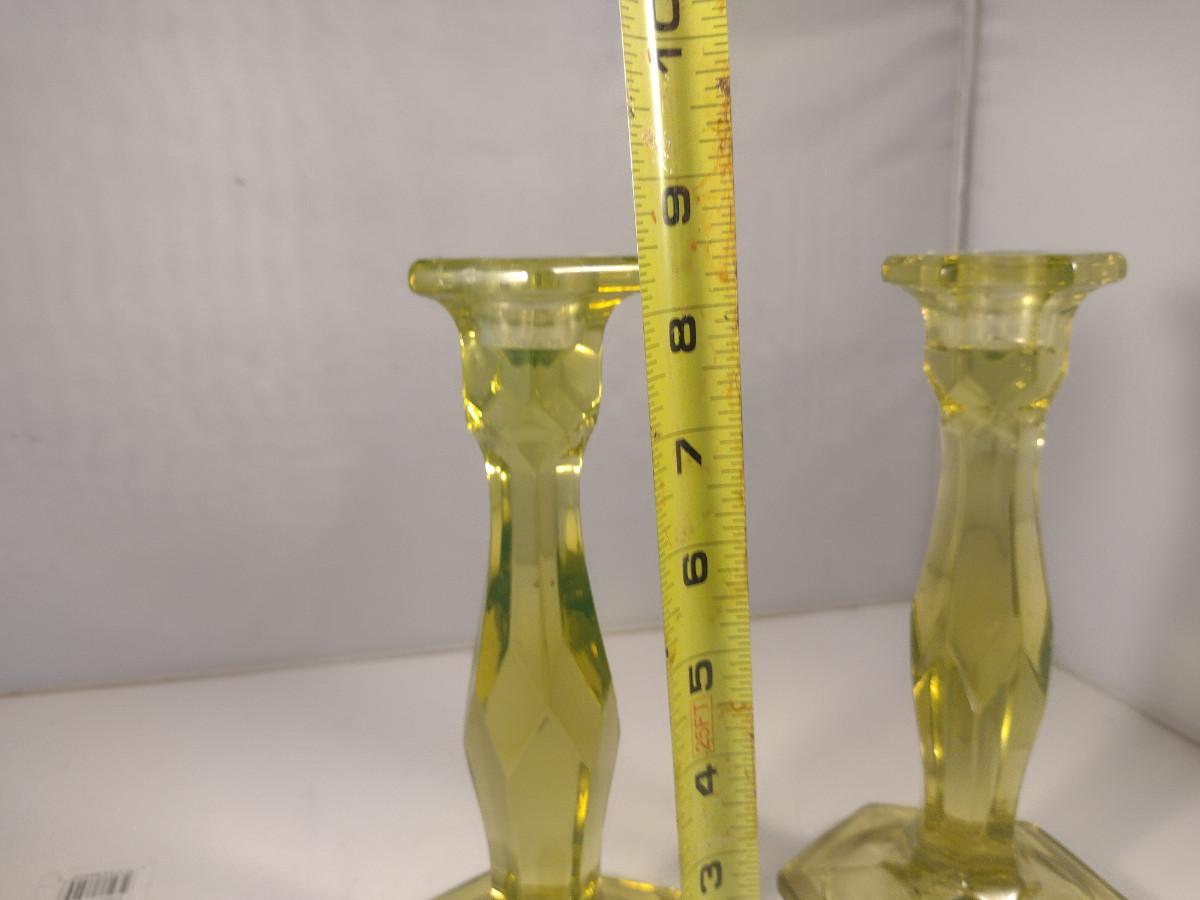 Pair of Uranium Glass Candle Stick Holders- Approx 8 1/2" Tall