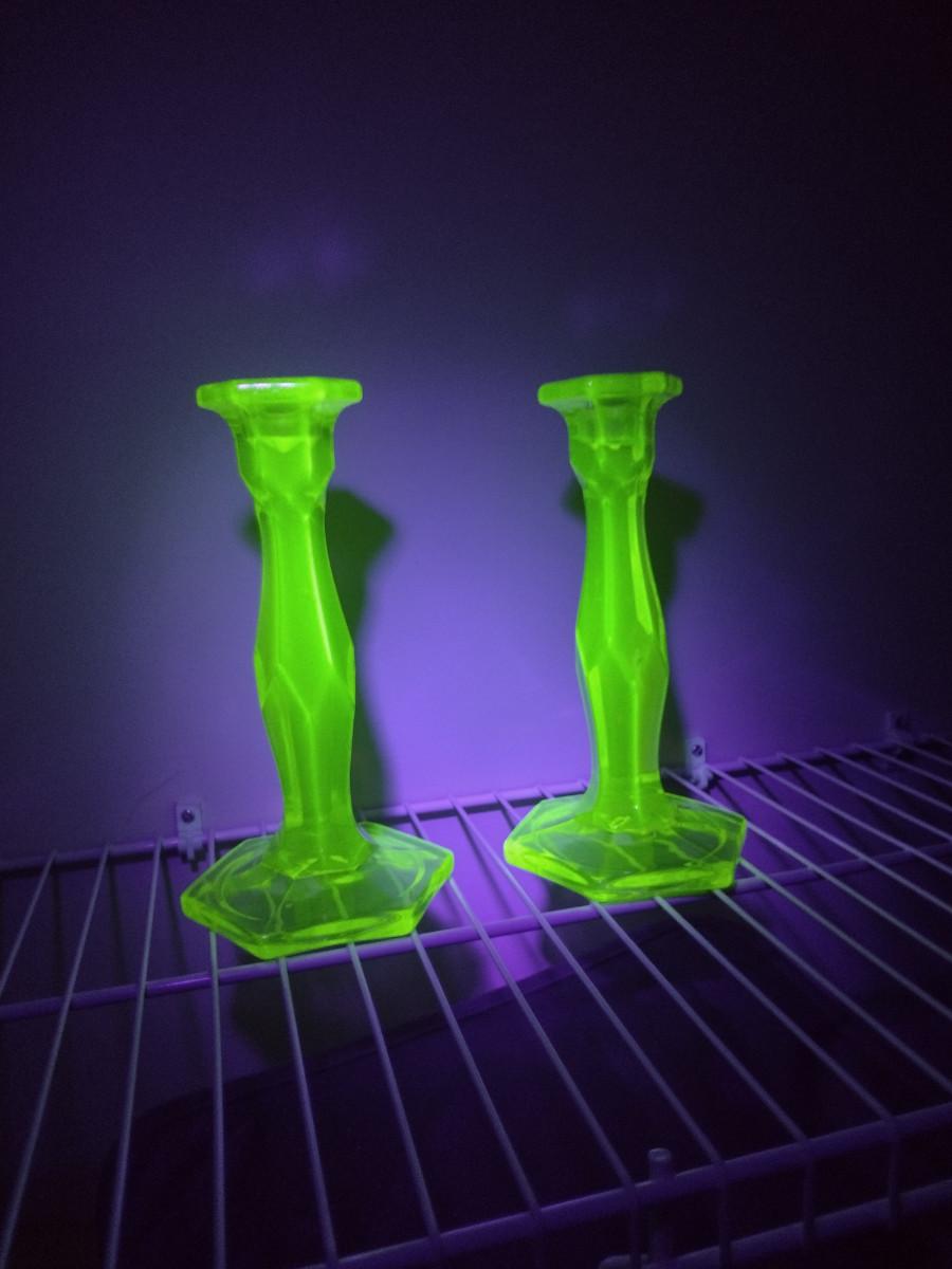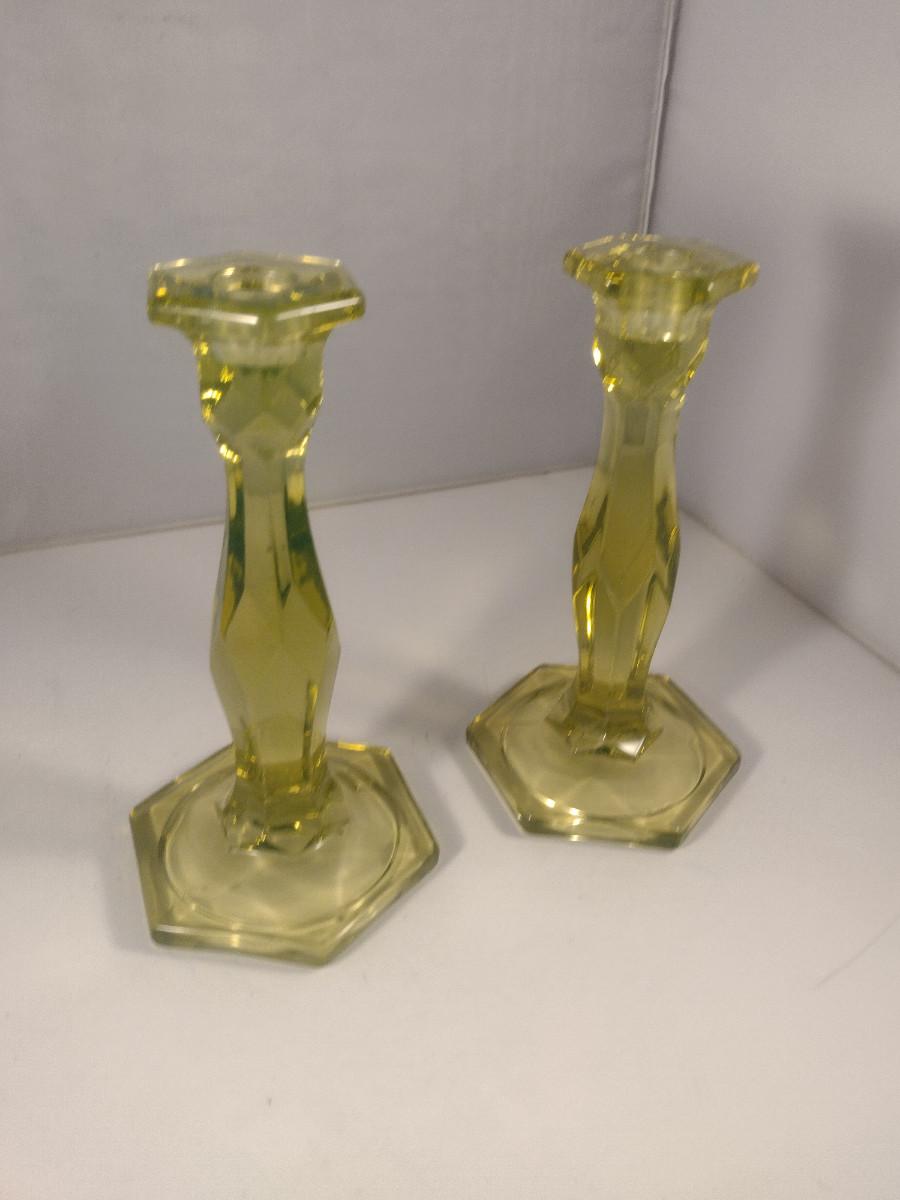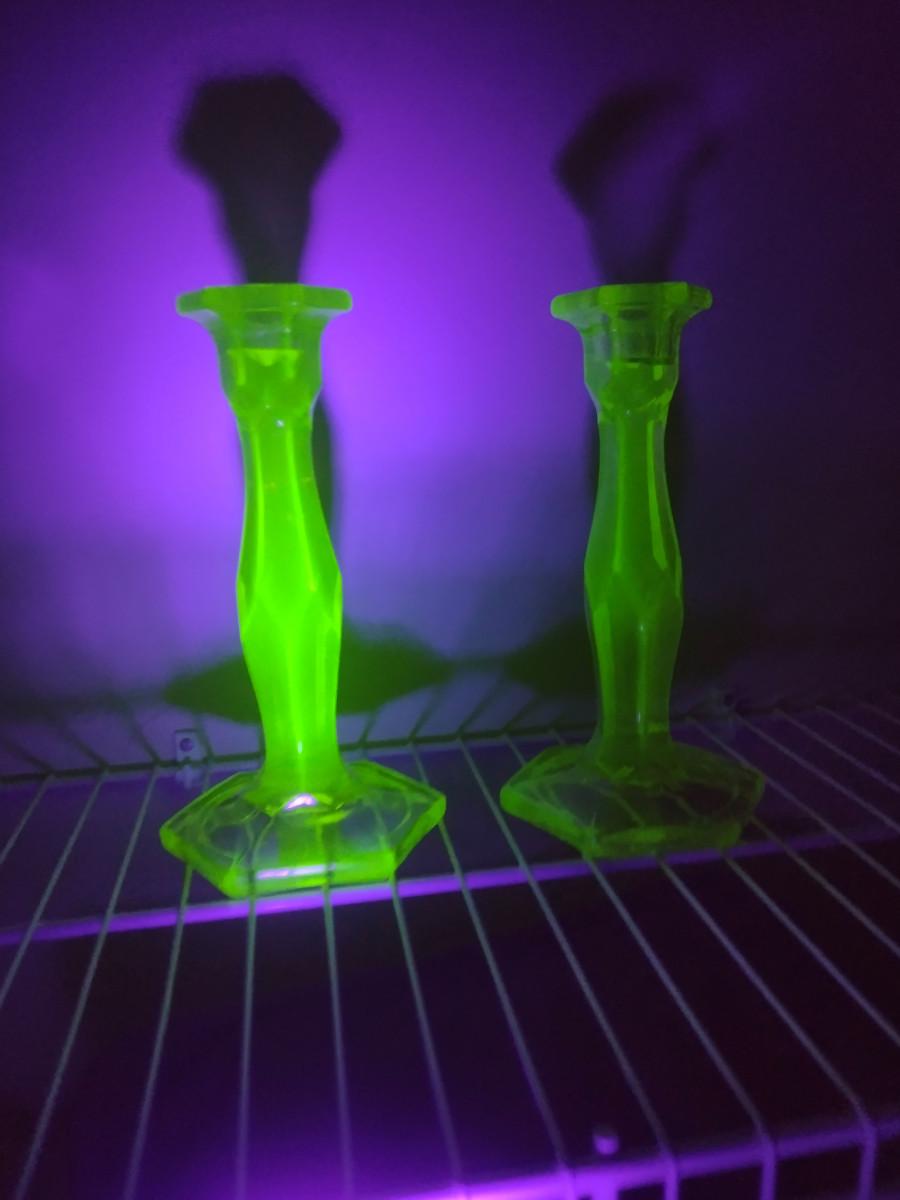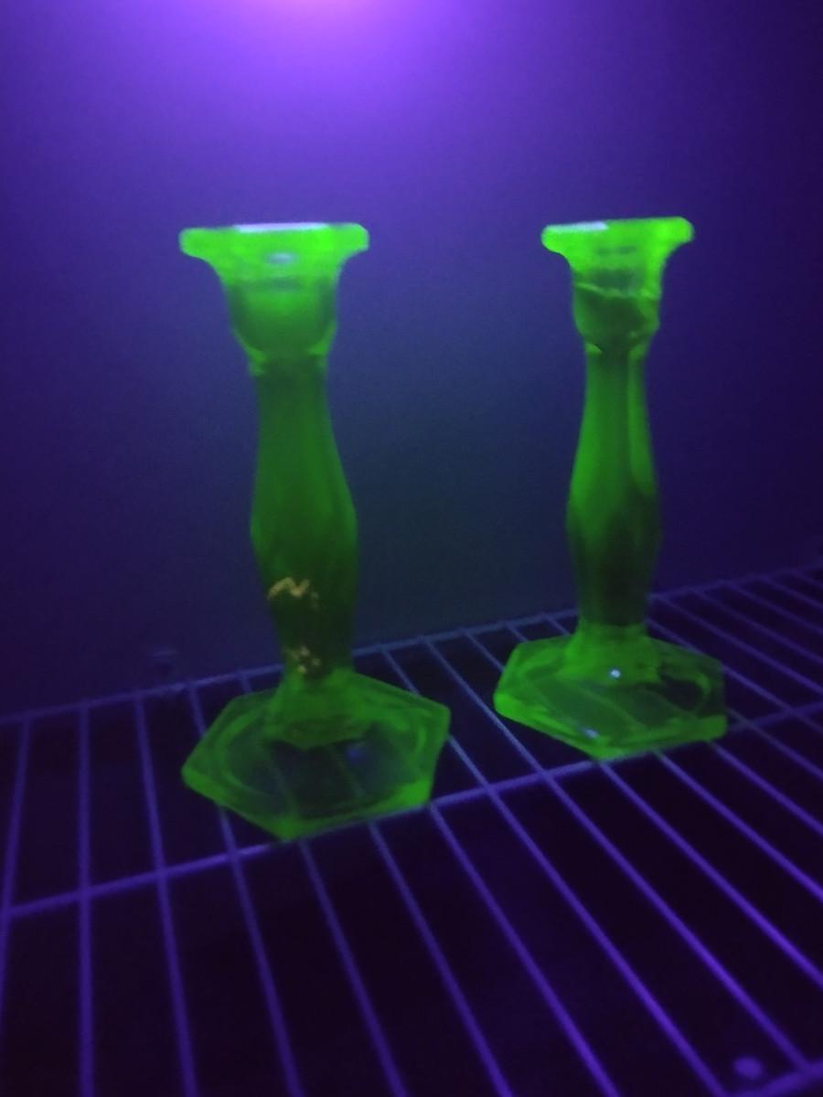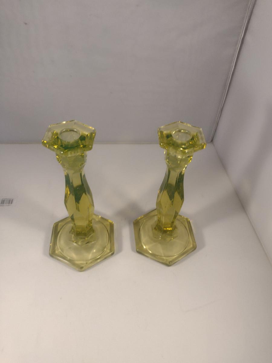 Pair of Uranium Glass Candle Stick Holders- Approx 8 1/2" Tall