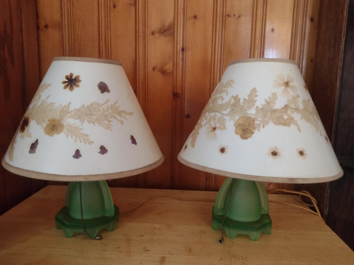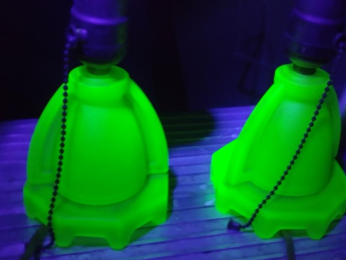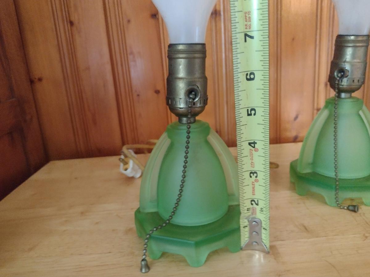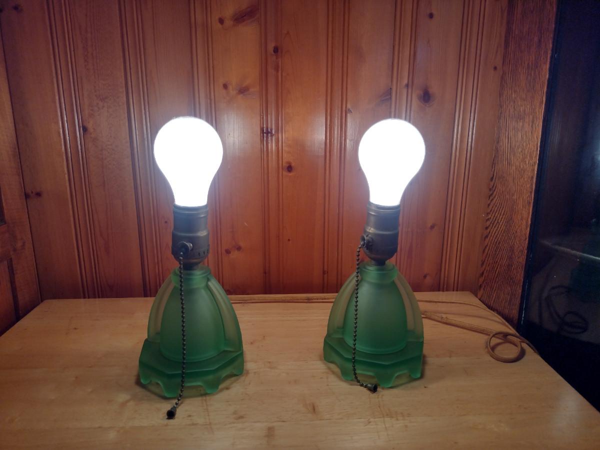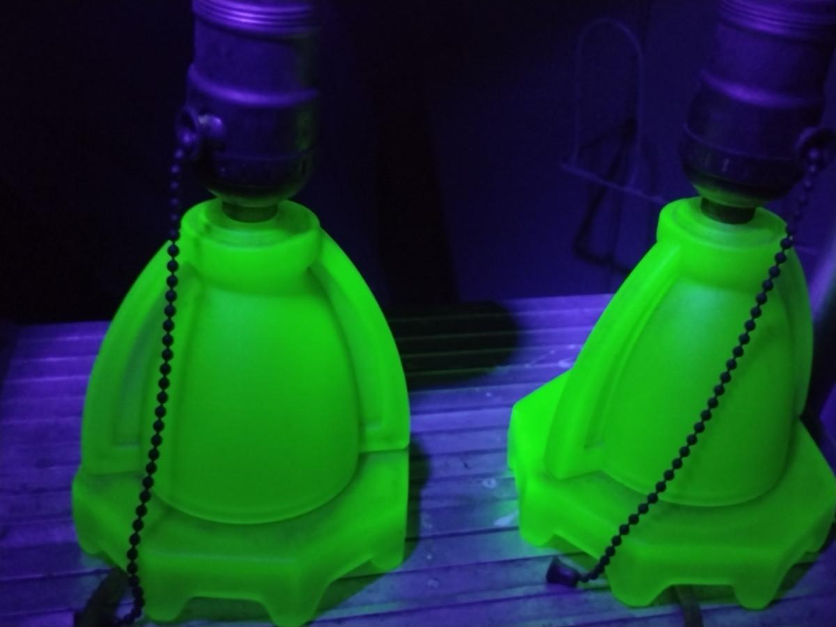 Pair of Uranium Glass Table Top Lamps with Shades (K)
