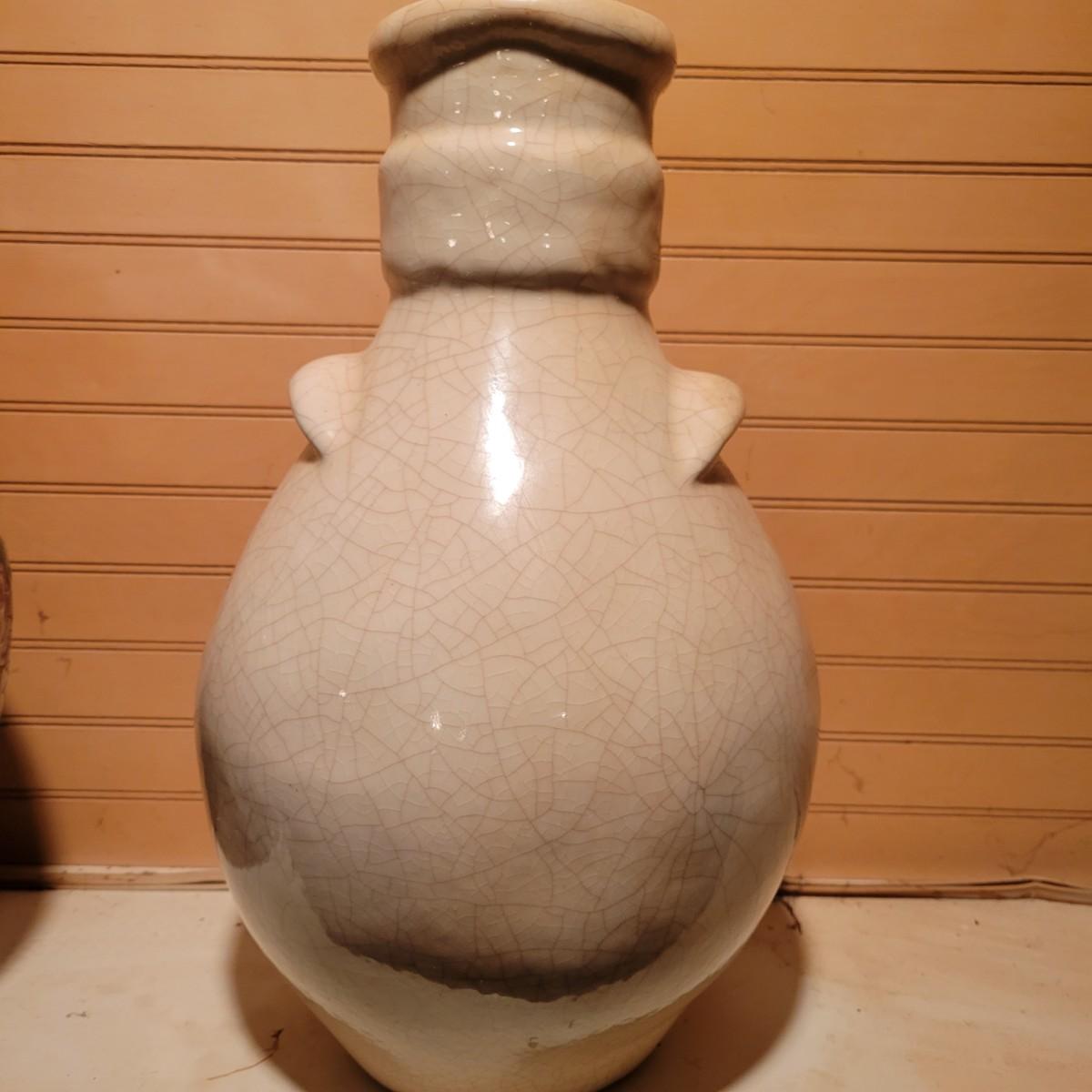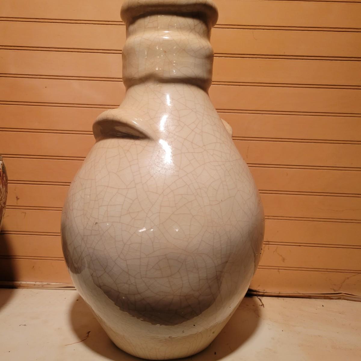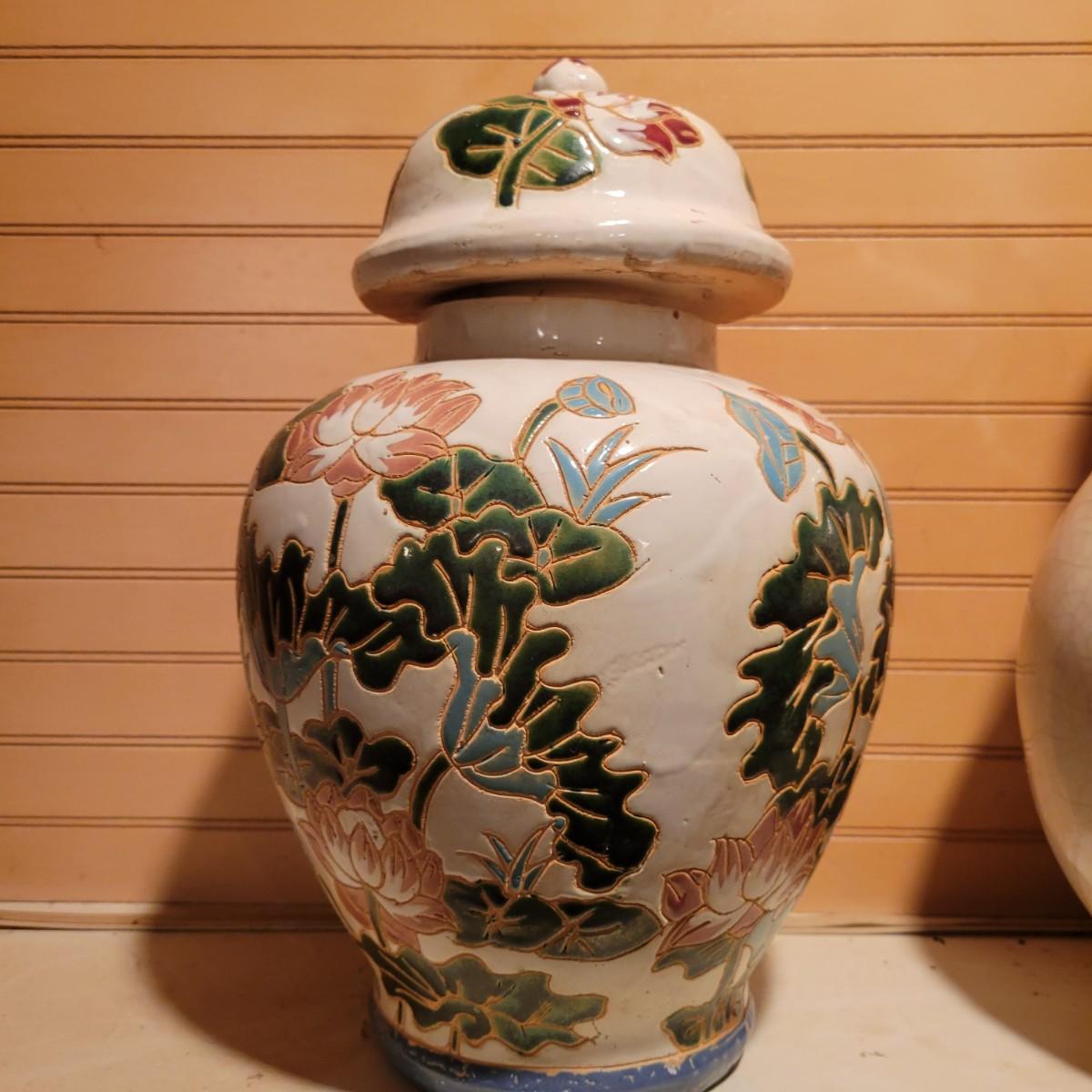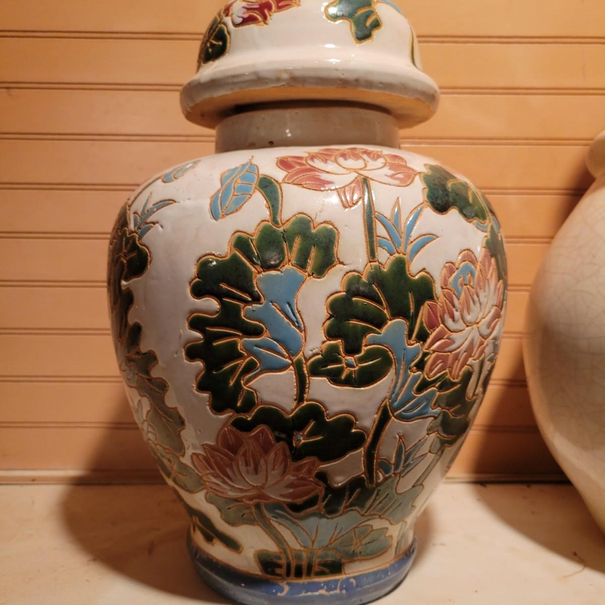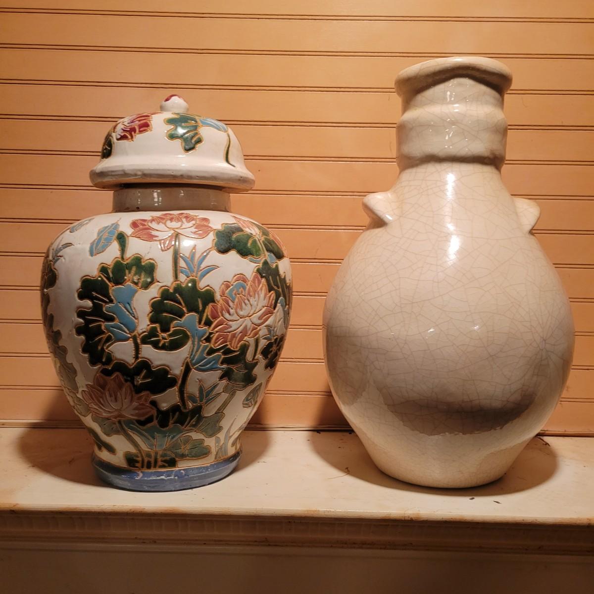 A pair of urns in good condition with no notable damage. One urn appears to be hand painted pottery with a mark on the bottom. It's design has an Asian floral design and has a lid. The other piece has a cream colored glaze that was intentionally crazed. This piece measures approximately 8" x 14". Shipping available