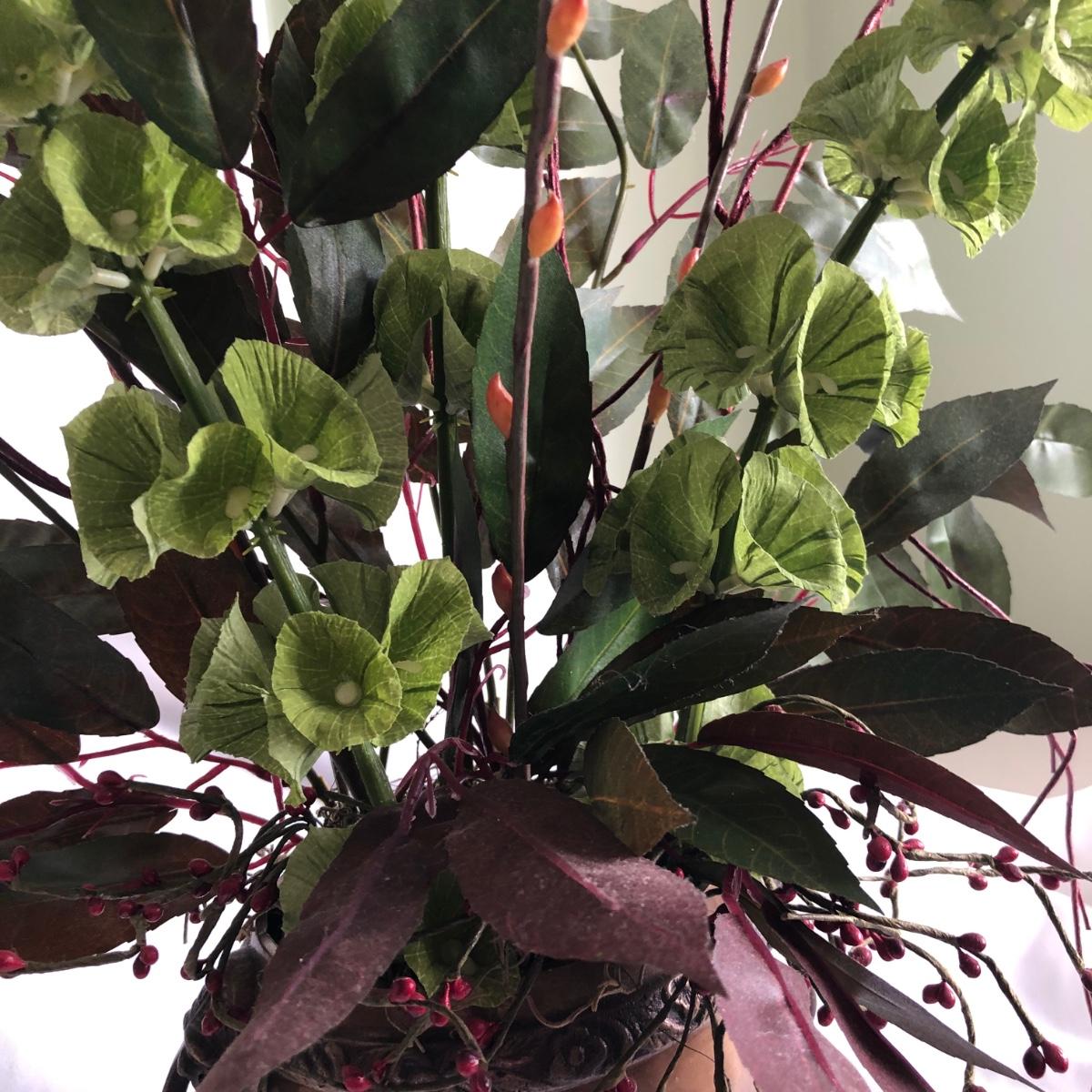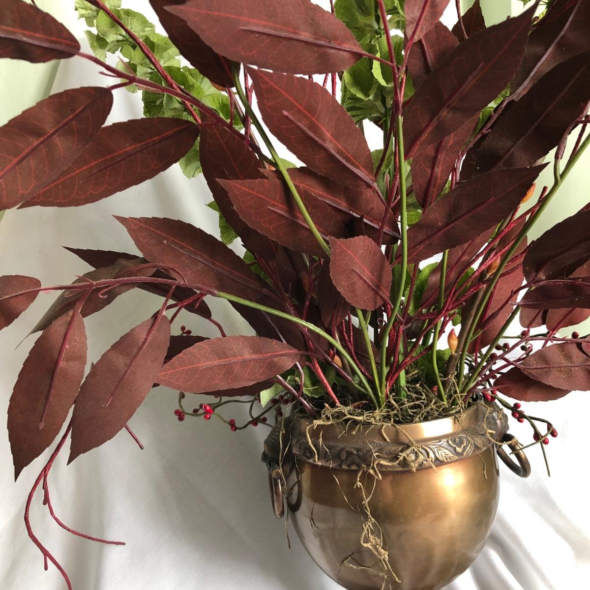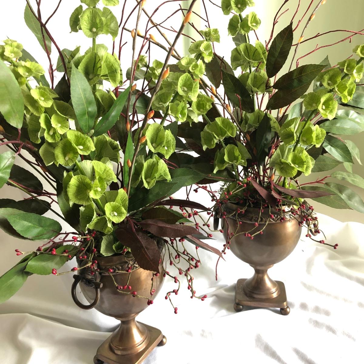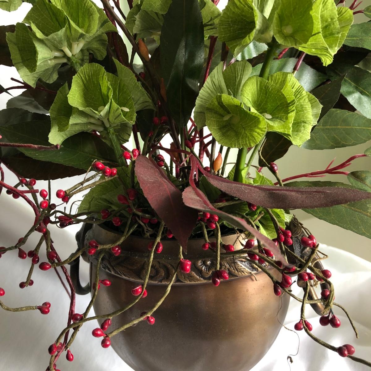 This matching pair of artificial greenery is in metal vases that have small handles on the sides and metal balls as feet. Green and red artificial foliage includes red berries and yellow buds. Each vase about 24” x 28” x 16” and is marked handcrafted on the base. Local pick up only.