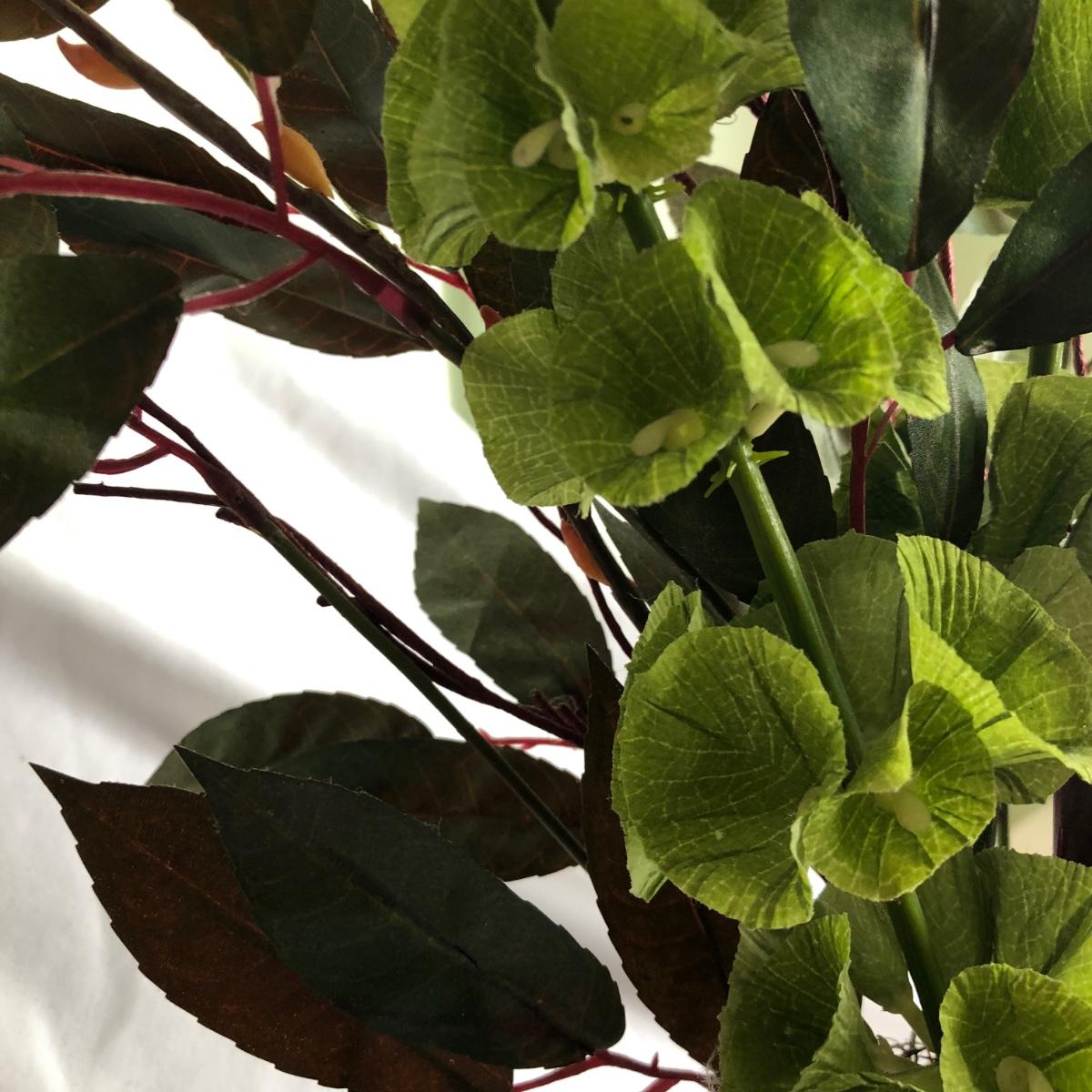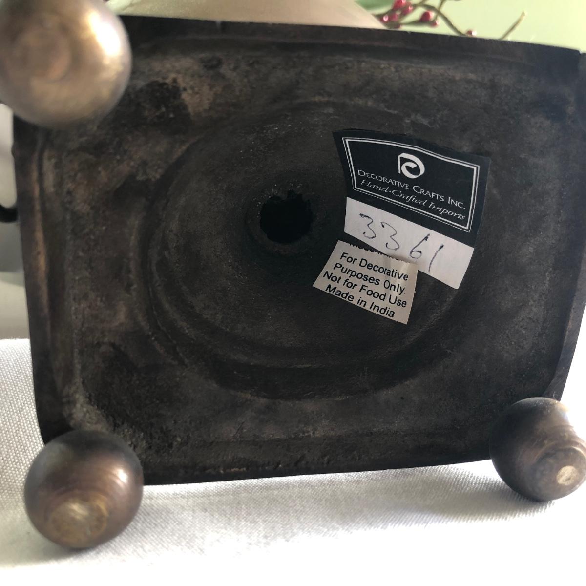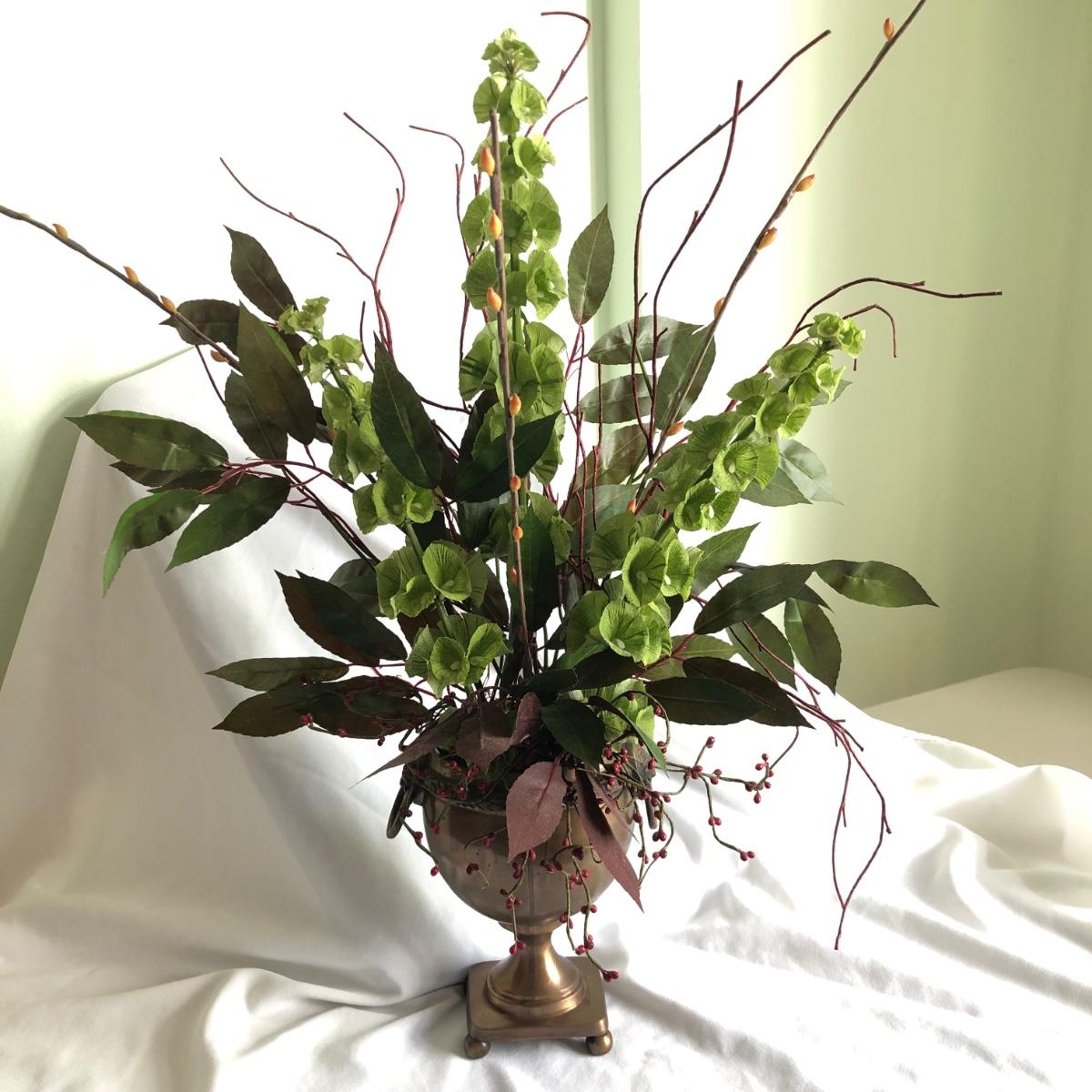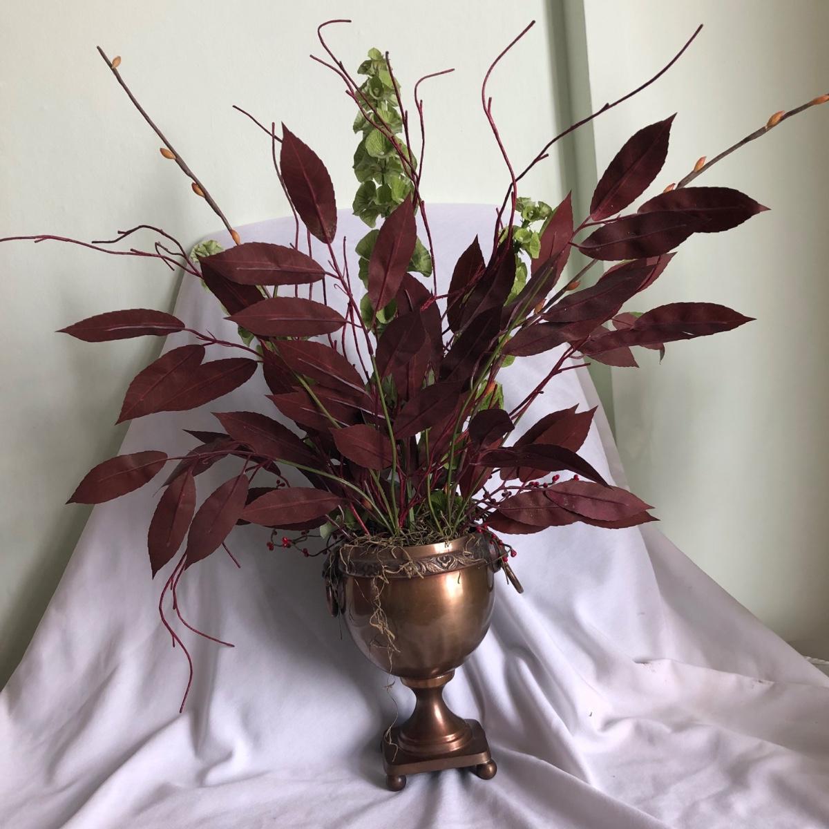 This matching pair of artificial greenery is in metal vases that have small handles on the sides and metal balls as feet. Green and red artificial foliage includes red berries and yellow buds. Each vase about 24” x 28” x 16” and is marked handcrafted on the base. Local pick up only.