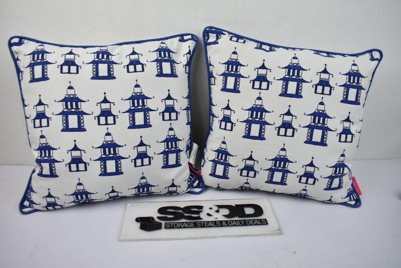 Pair of VCNY Home Clairebella Pagoda Chinoiserie Outdoor Decorative Pillow, 18" x 18", Blue, Retail $33 - New