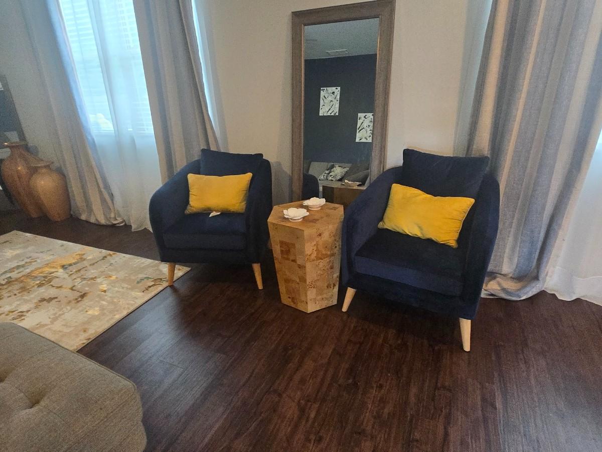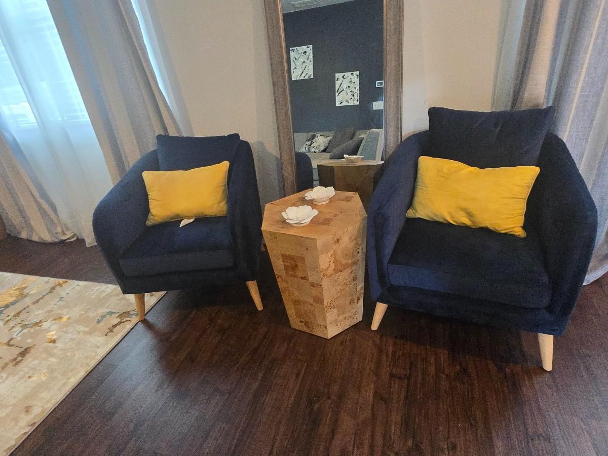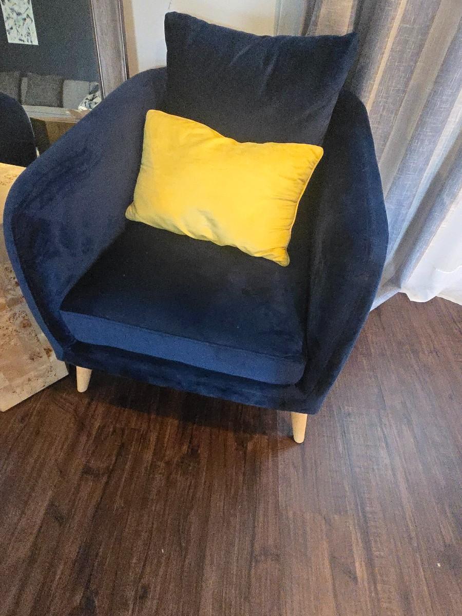 Set of two plush navy blue velvet armchairs with angled wooden legs and bright yellow accent pillows. Comfortable and stylish seating for living rooms or reading nooks. New Condition