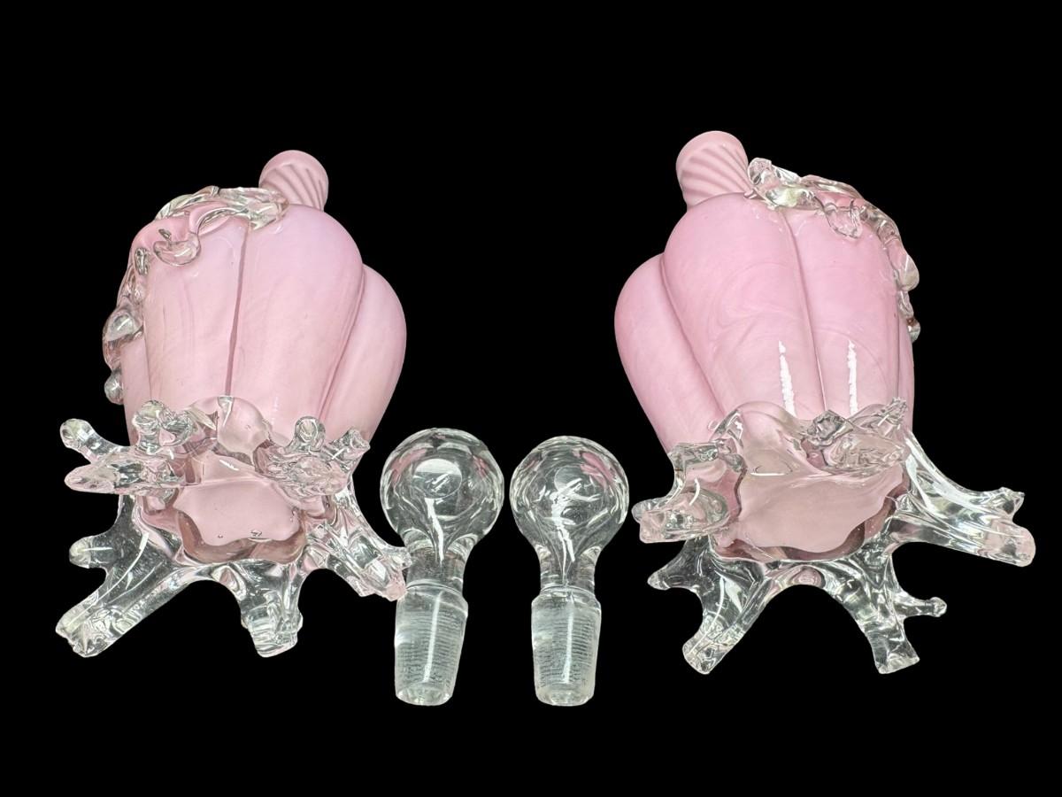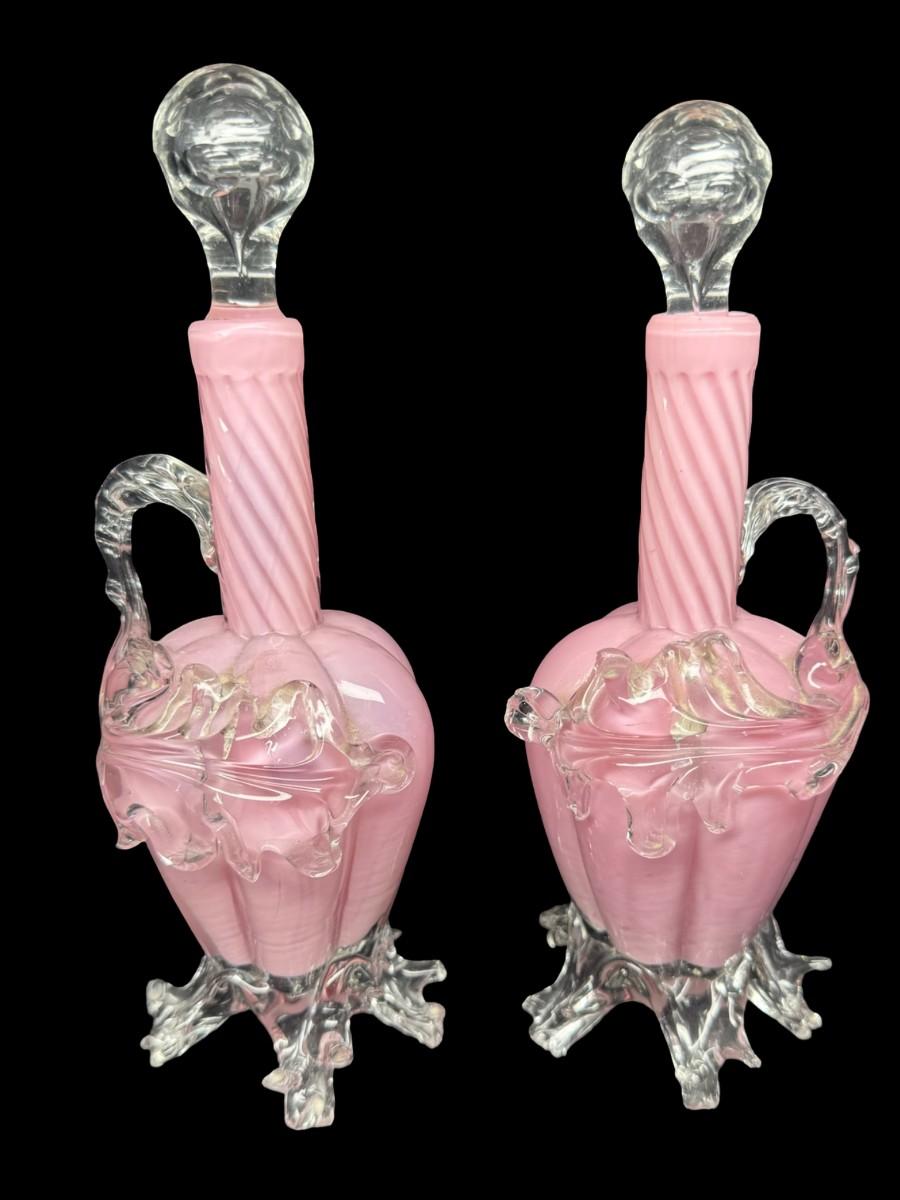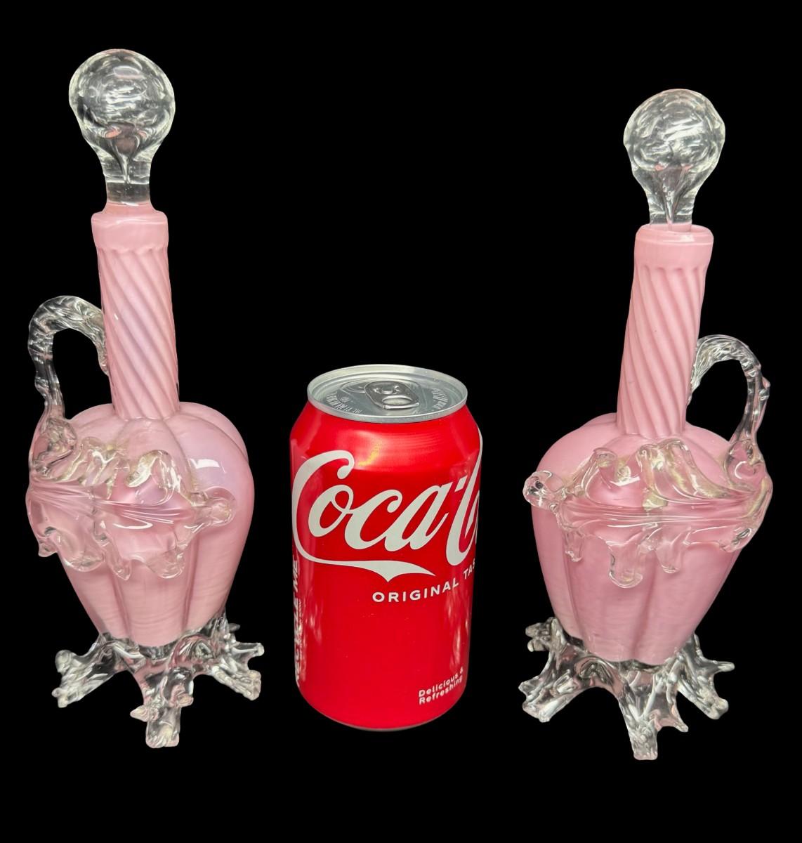 Pair of Victorian Era Cranberry Opalescent Decanters