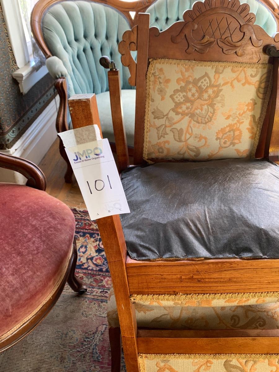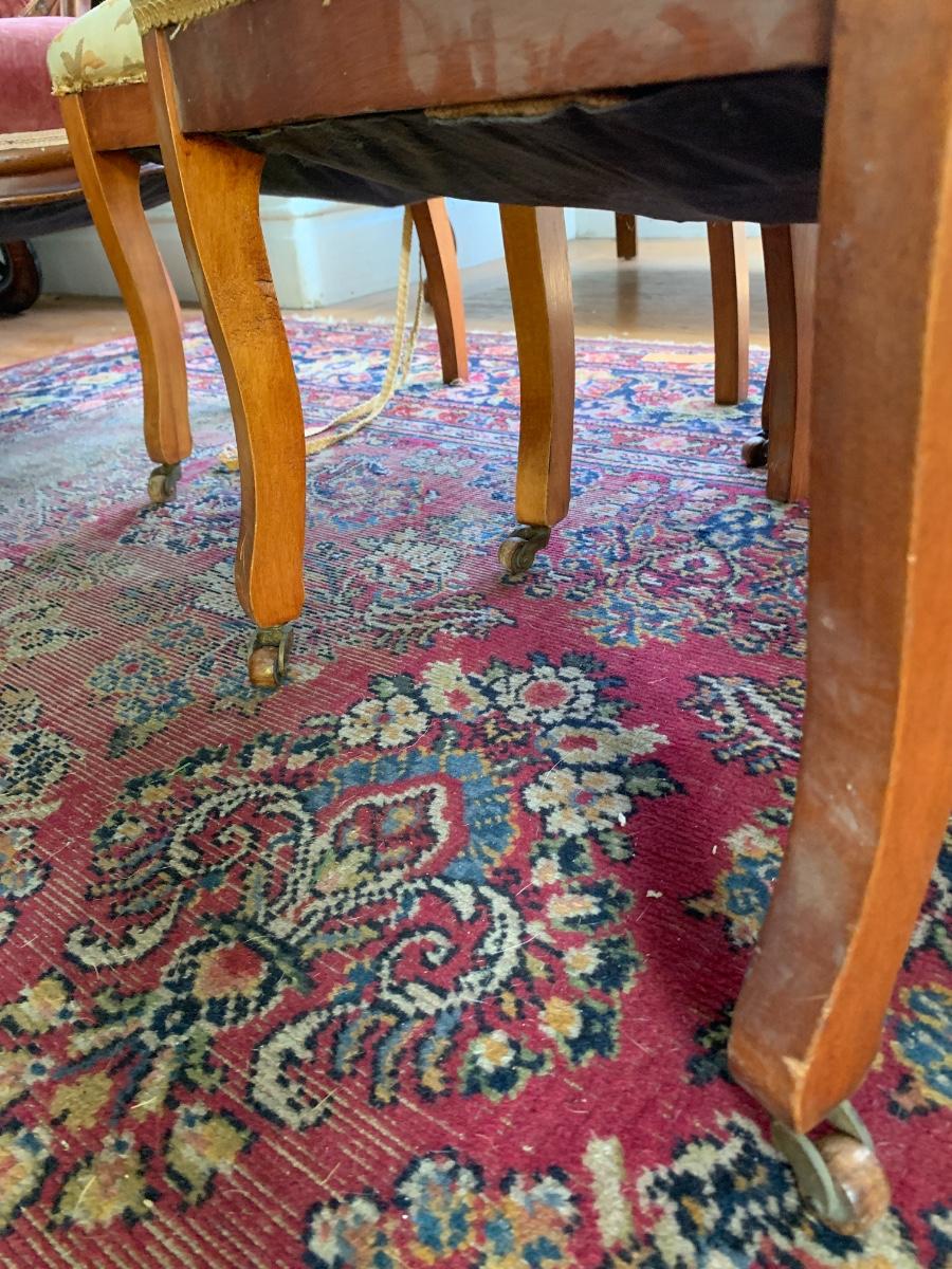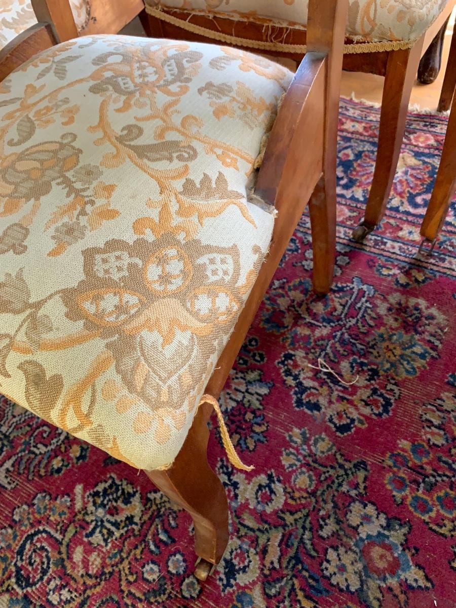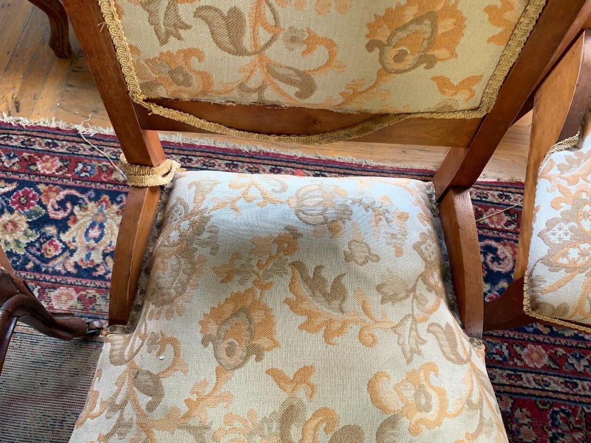 Carved wood frames with front leg casters. Upholstery clean but requires repair around edges as shown - trim is partially detached. These chairs are not sturdy enough for every day use.
