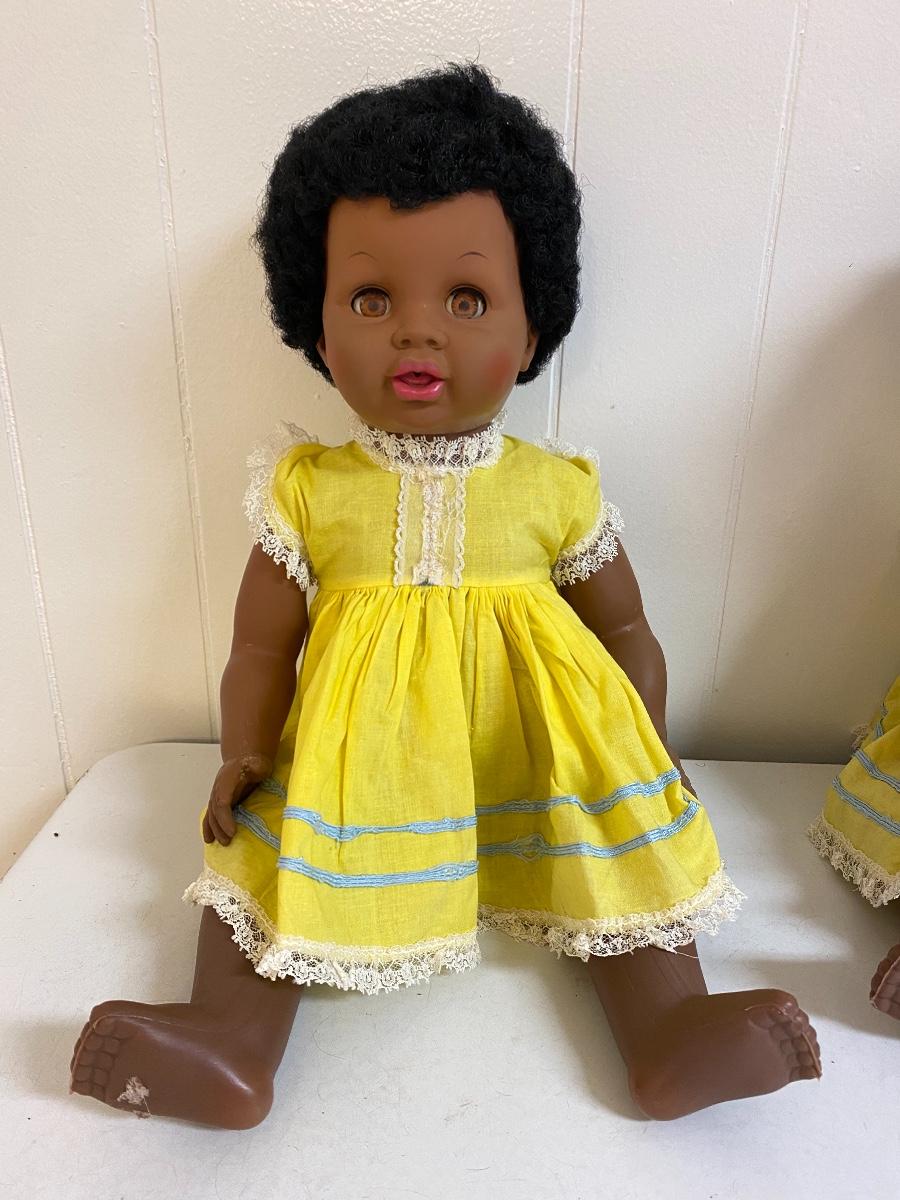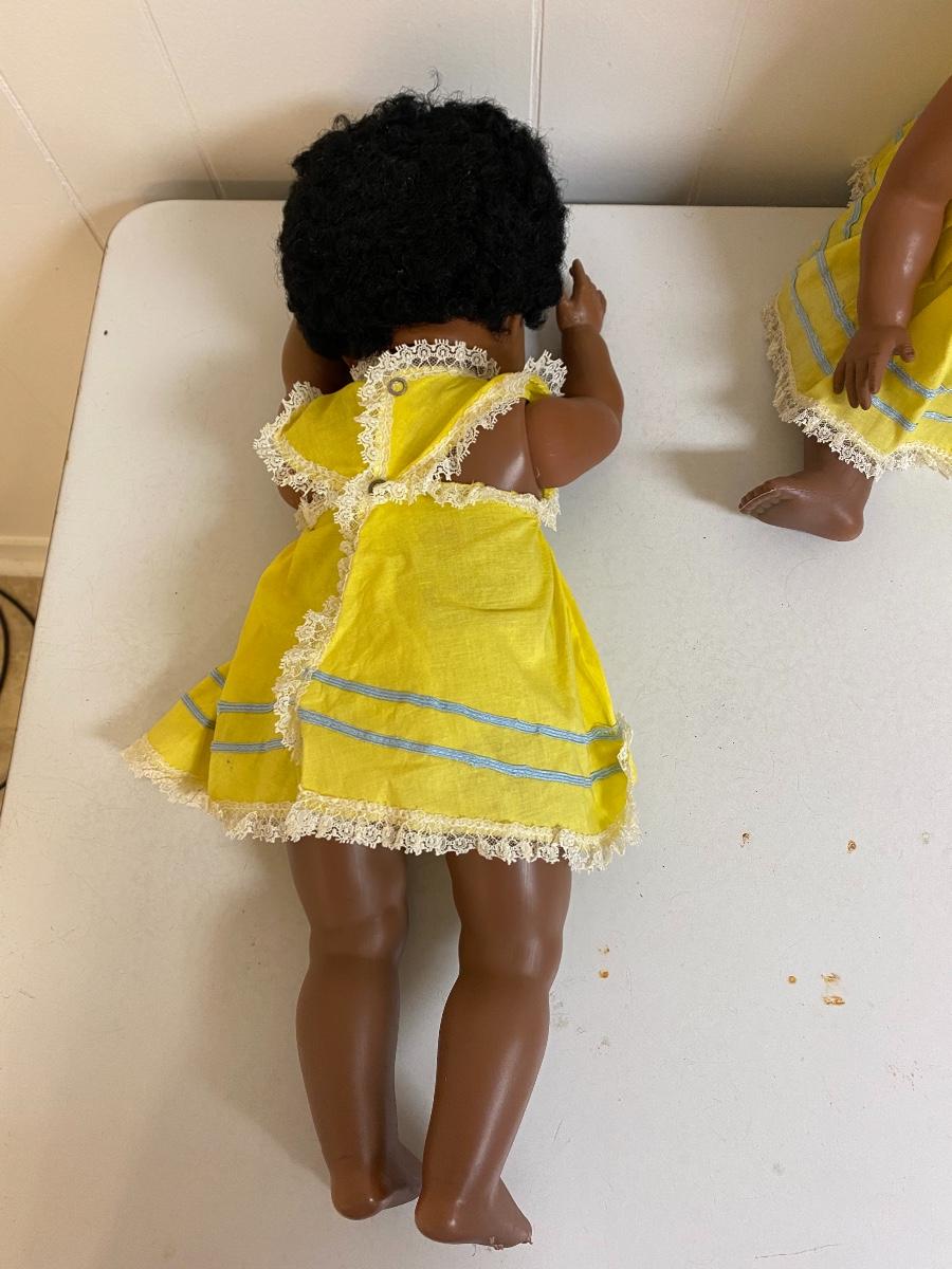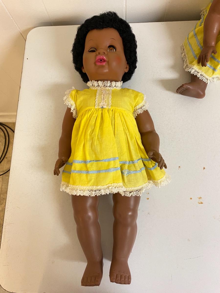 Pair of Vintage 1969 Jolly Toys African American baby dolls with Original Dresses, 19", sleepy eyes, rubber, Jointed arms and legs. Original dresses are in good condition with one missing bow. Dolls are in very good condition, except one doll’s left eye gets a little stuck
