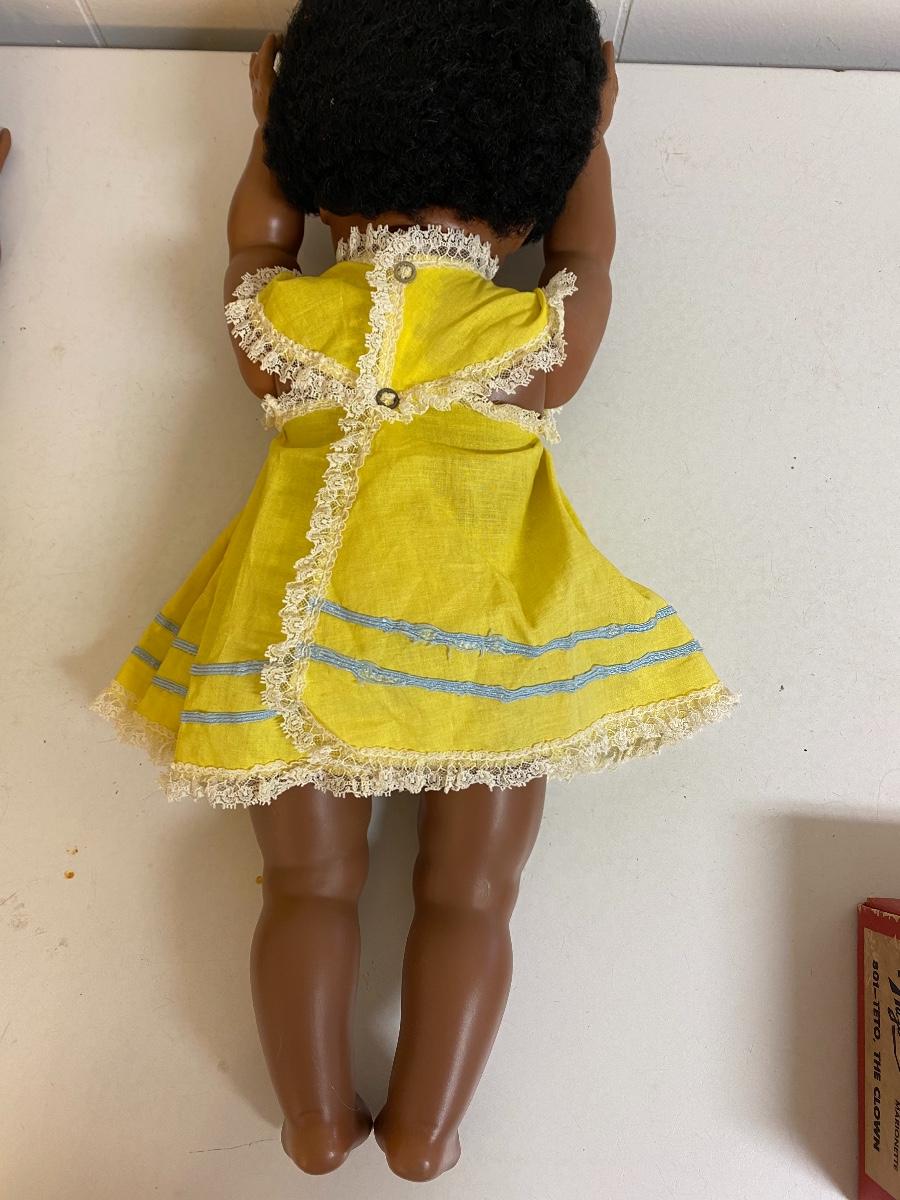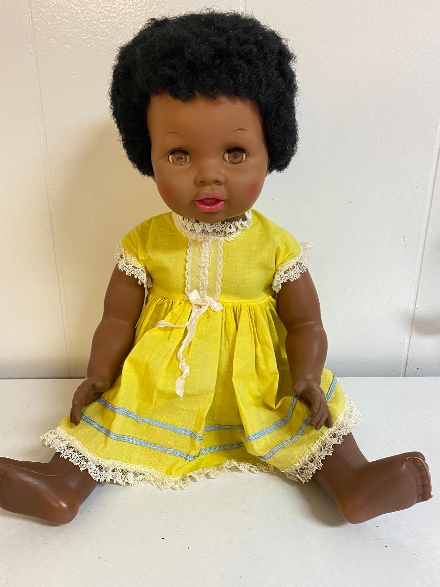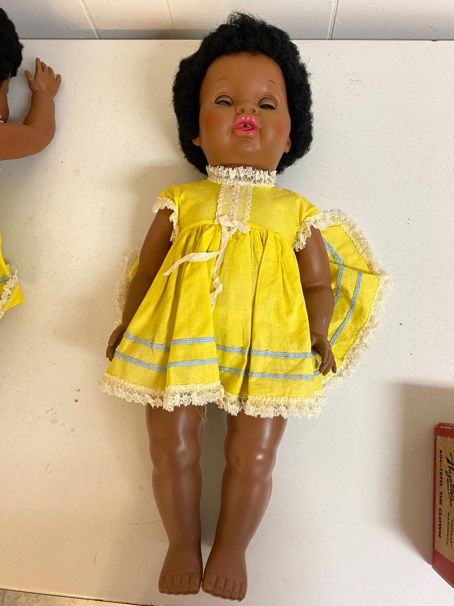 Pair of Vintage 1969 Jolly Toys African American baby dolls with Original Dresses, 19", sleepy eyes, rubber, Jointed arms and legs. Original dresses are in good condition with one missing bow. Dolls are in very good condition, except one doll’s left eye gets a little stuck