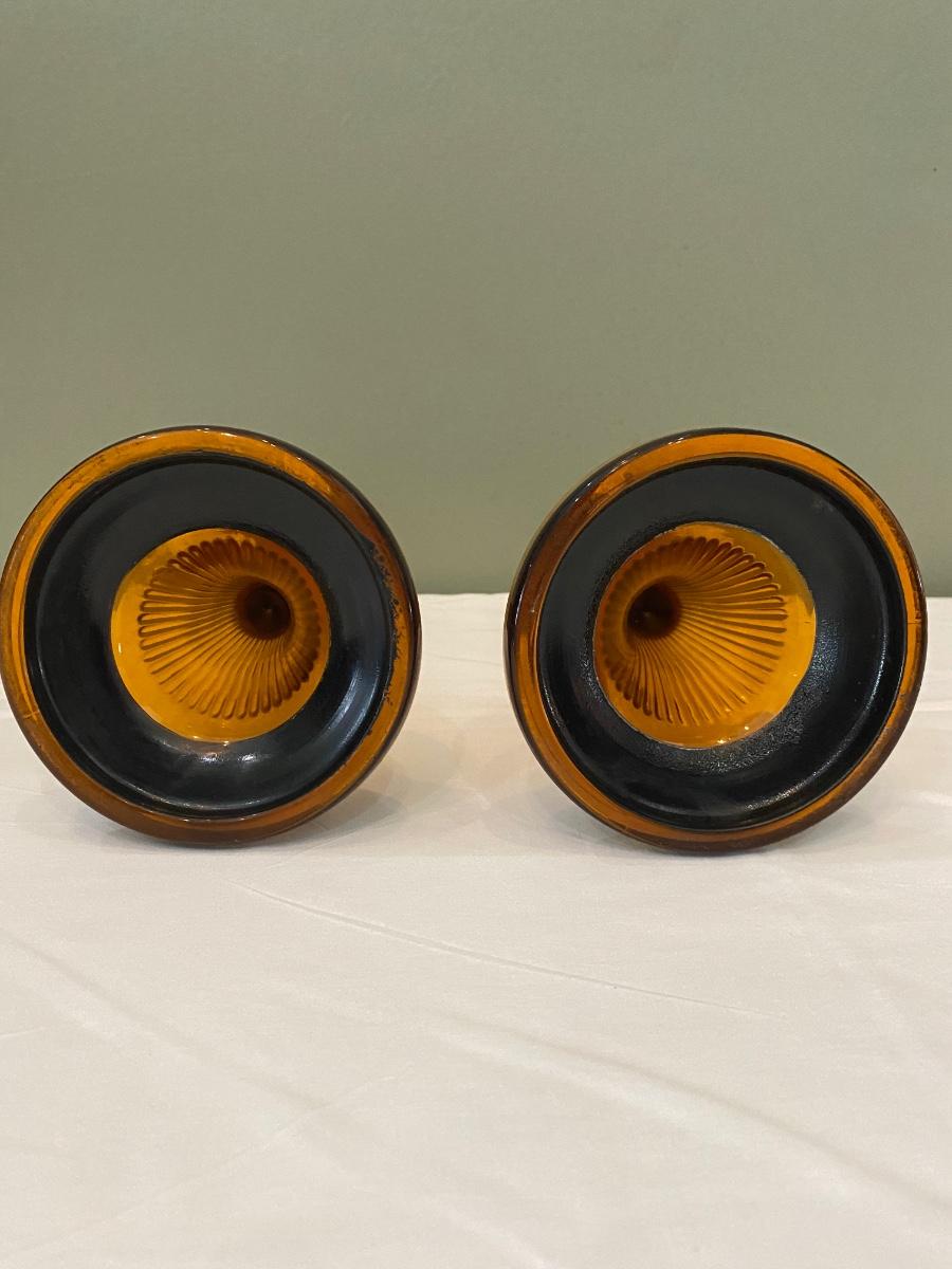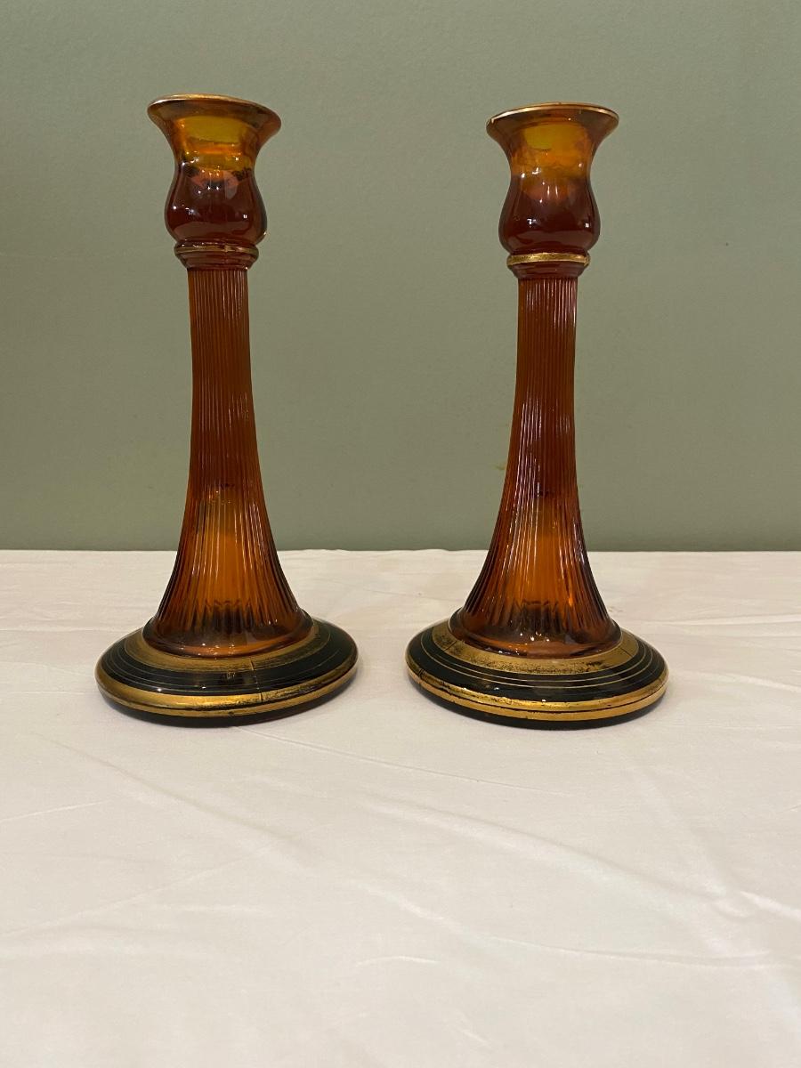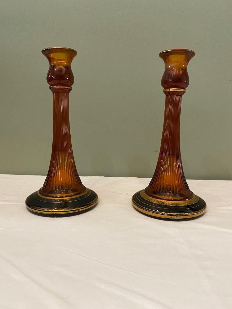 Pair of vintage amber glass fluted candlesticks. Approx 9-1/4”H