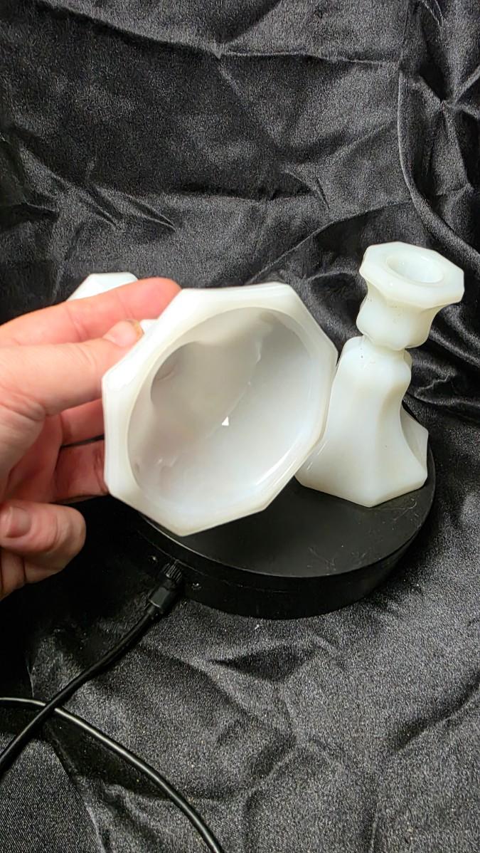 Soft white glass shaped into crisp, flared geometry. This pair of milk glass candle holders carries the quiet elegance of mid-century American design, their octagonal bases rising into sculpted stems that feel both sturdy and refined. When light passes through their creamy translucence, they glow with a subtle warmth that elevates any setting.