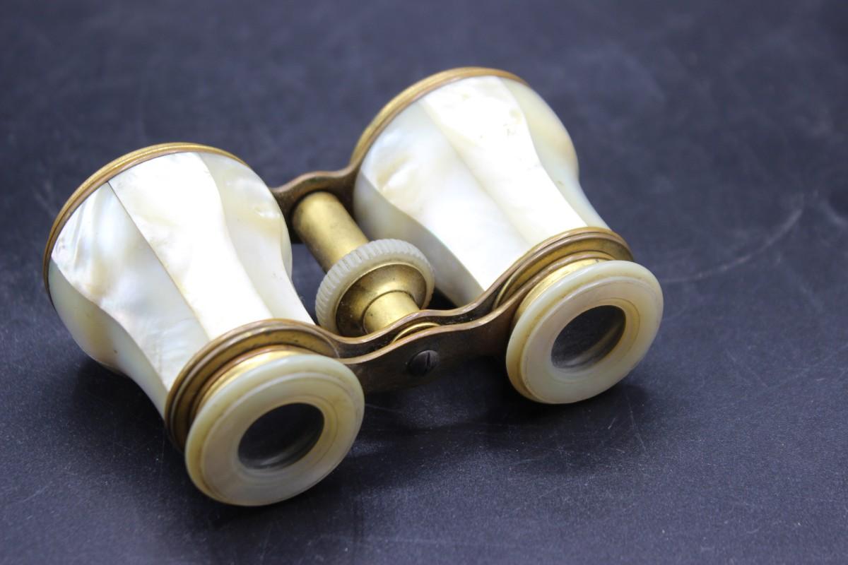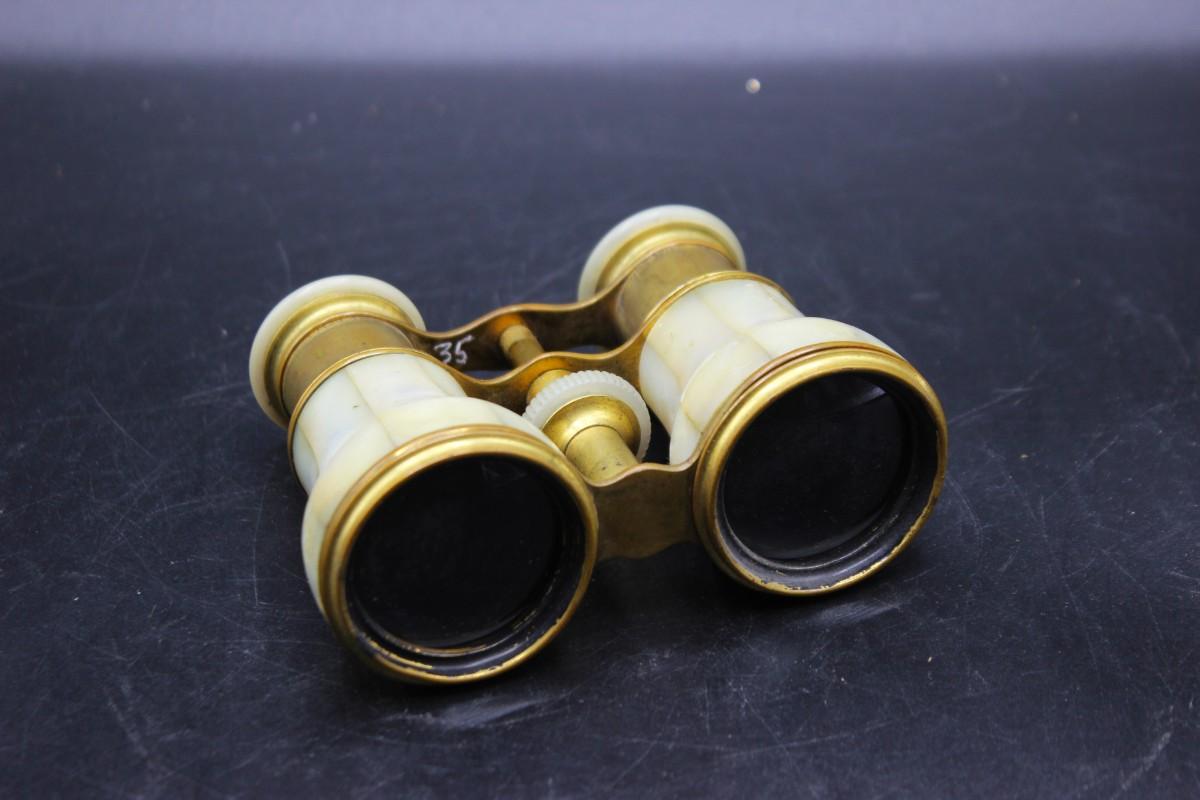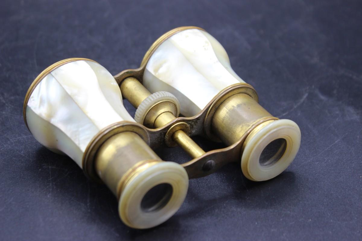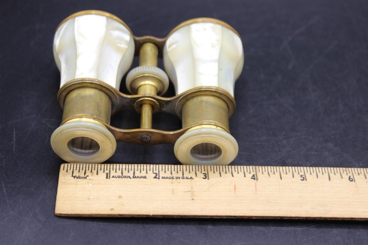 Pair of brass and mother of pearl opera glasses/binoculars. Display wonderfully. There is a missing mother of pearl panel on one of the sight pieces.