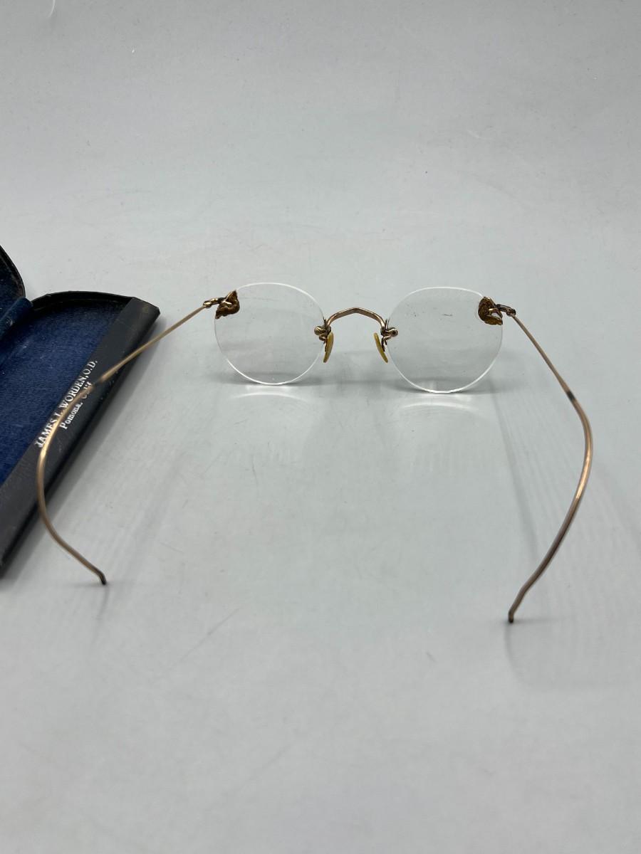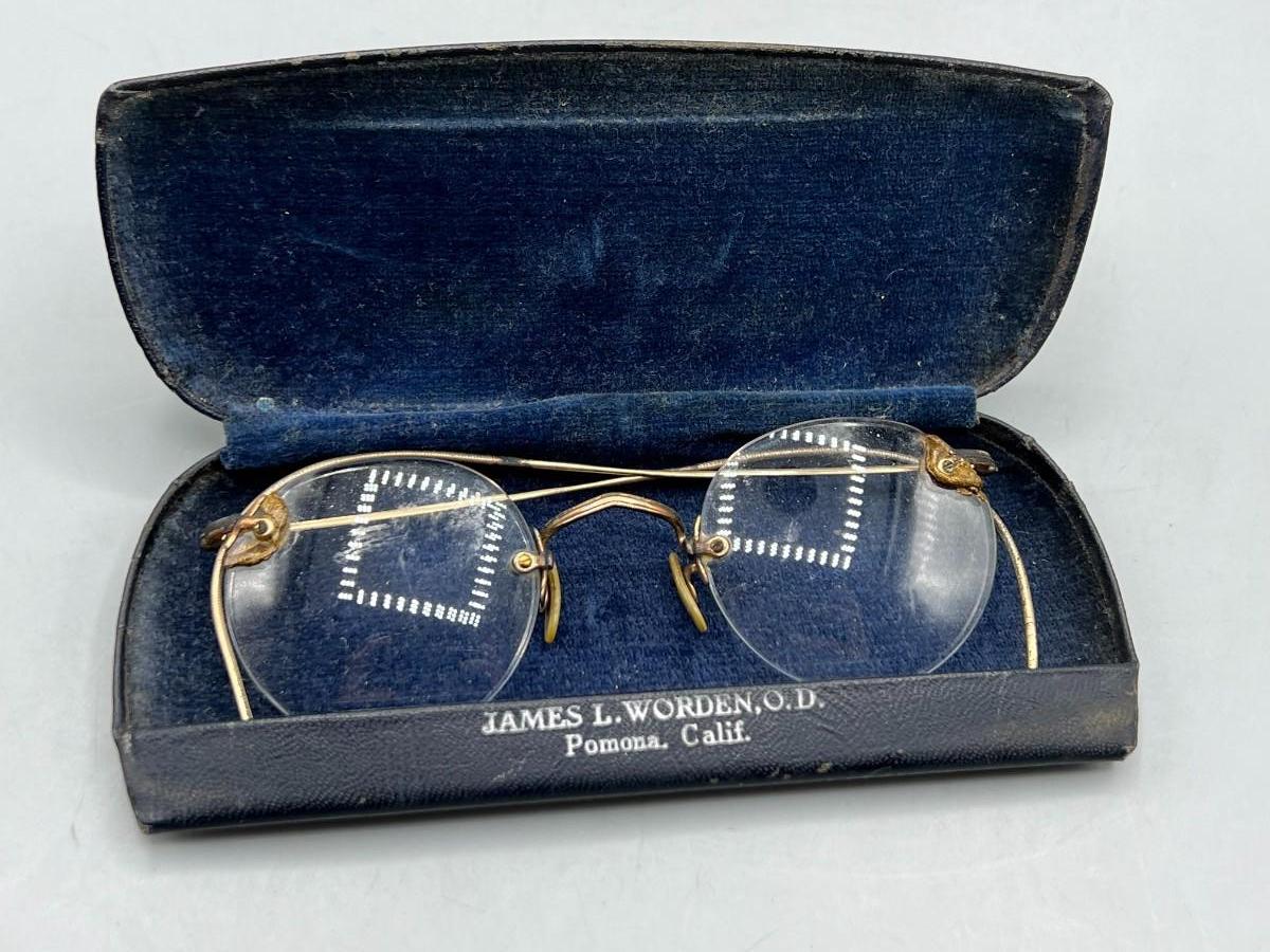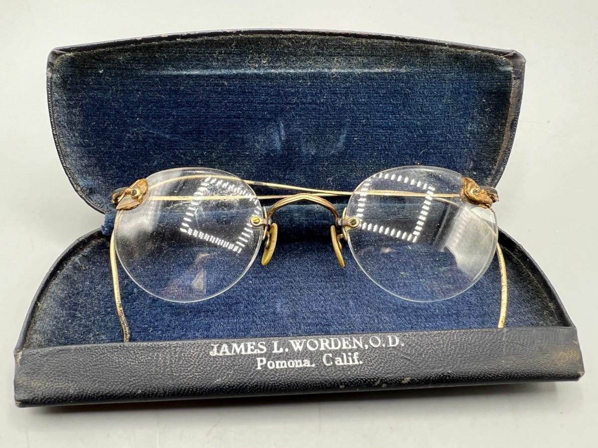 Pair of Vintage Antique Thin Gold Tone Wire Framed Eyeglasses with Glasses Case
