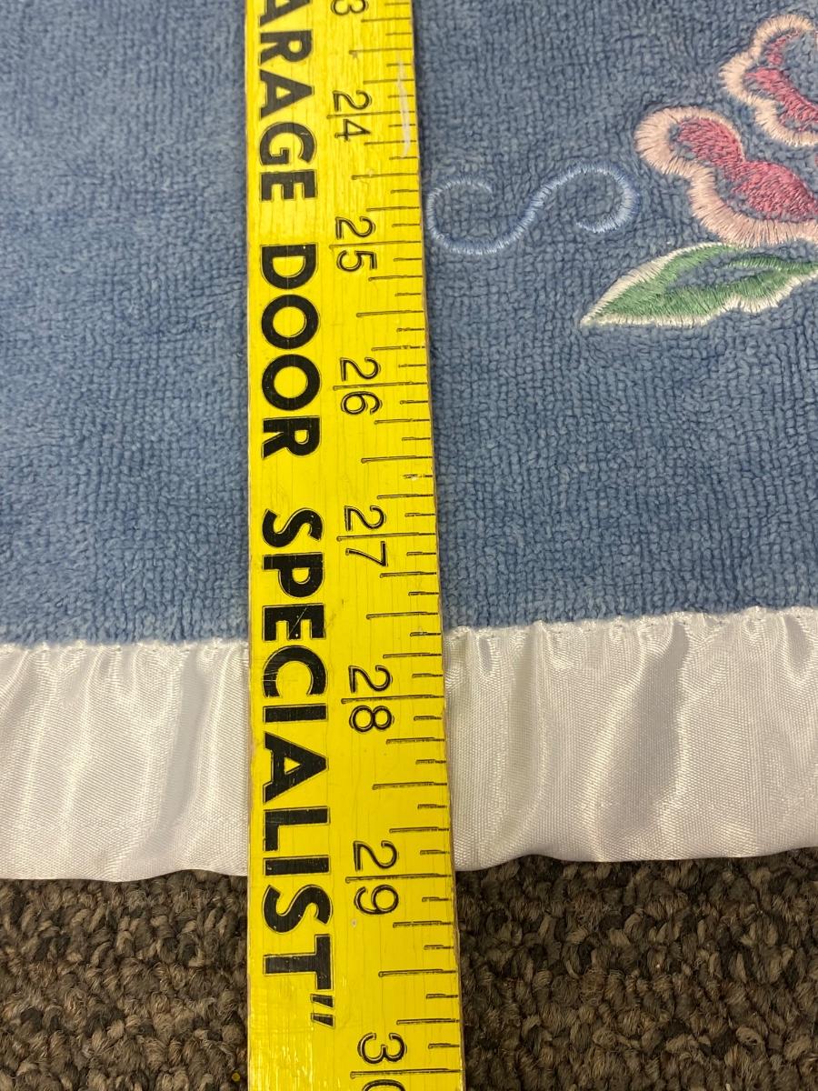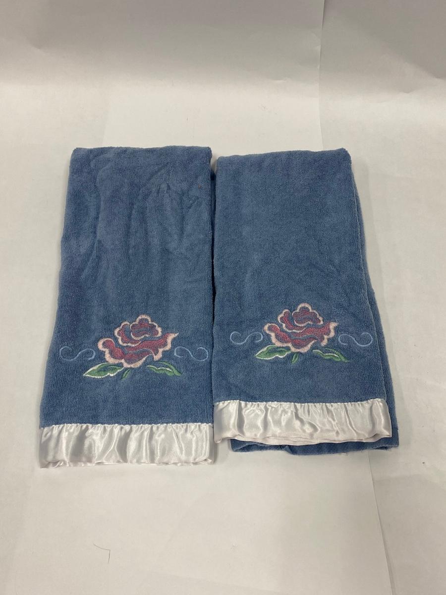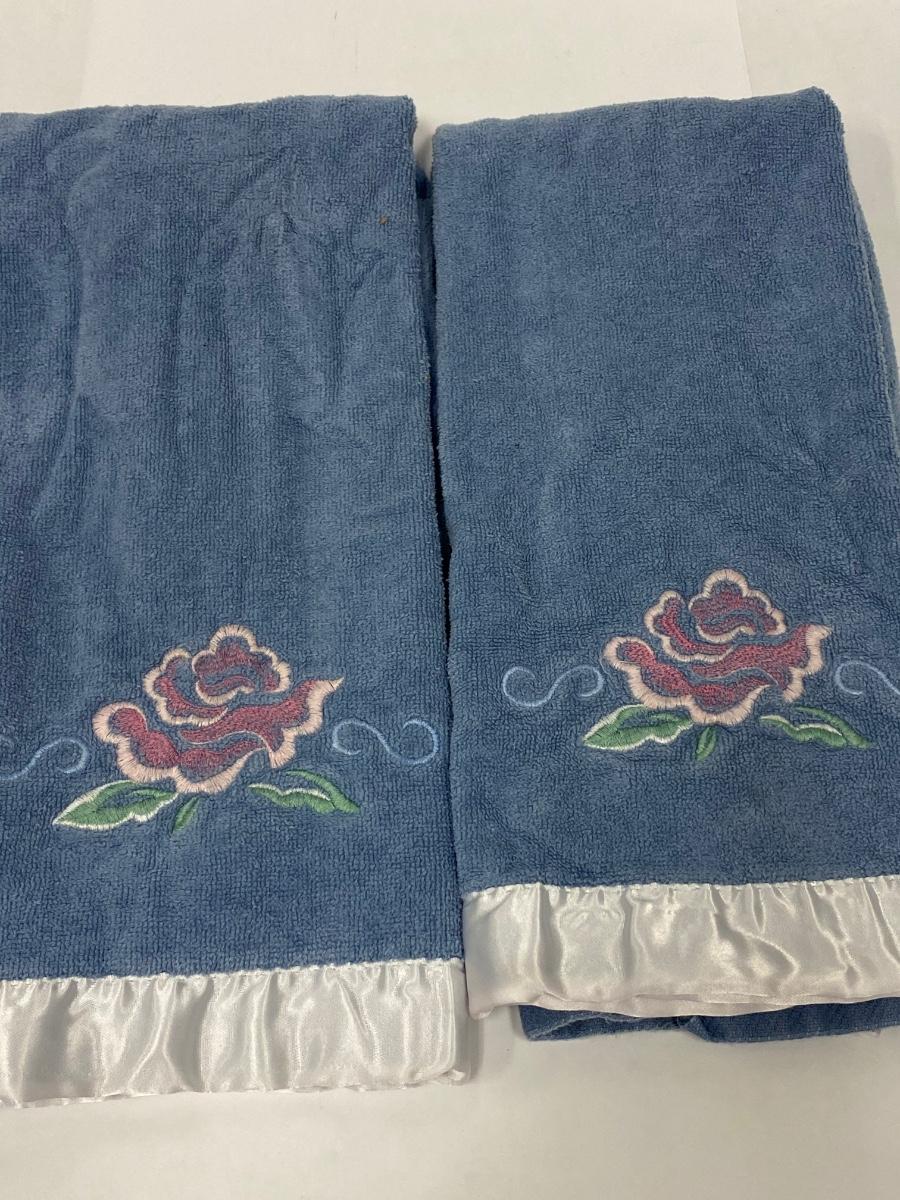 Pair of Vintage Rose Embroidered Blue Bath Hand Towels. Larger than normal hand towels but definitely not a bath towel. Some discolor, may just need to be washed. Tag has date as 1978.