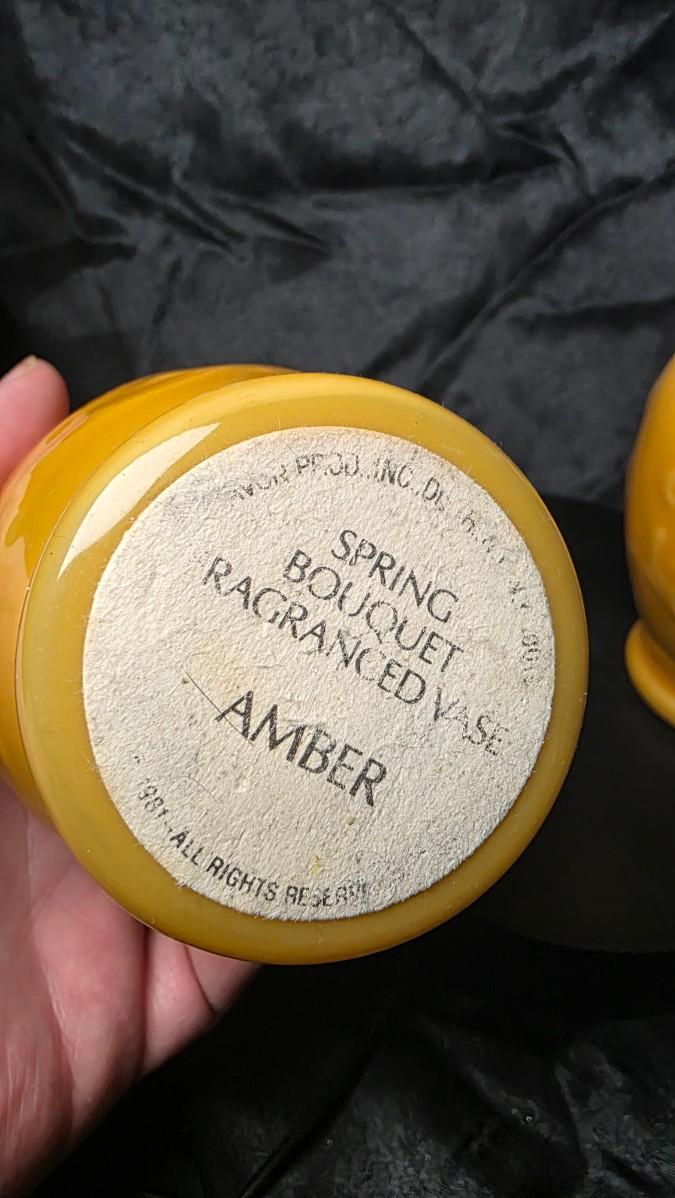 There is a warmth to amber that feels timeless — a golden glow that carries memory, nostalgia, and quiet luxury all at once. This pair of vintage Avon “Spring Bouquet” vases captures that glow perfectly, their amber-coated milk glass bodies radiating a soft, honeyed translucence that transforms light into atmosphere. Designed in 1981 as part of Avon’s fragrance presentation collection, these vases were created not simply as containers, but as decorative keepsakes meant to live on long after their original contents had faded.